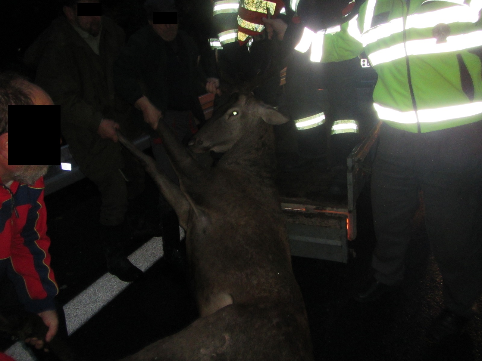 Spolu s členy mysliveckého sdružení hasiči jelena naložili na přívěsný vozík. Po oplachu silnice vodou se vrátili zpět na stanici.