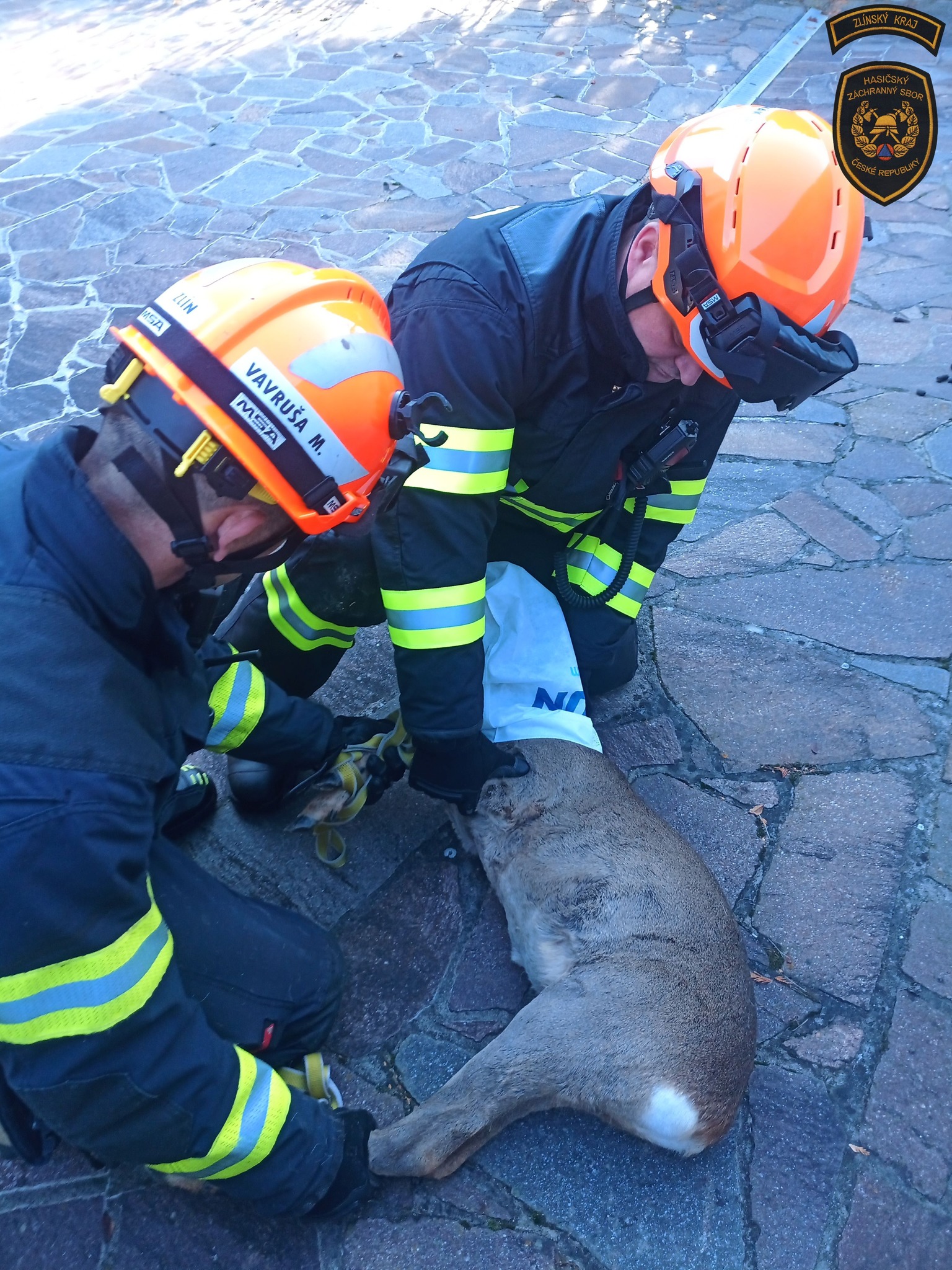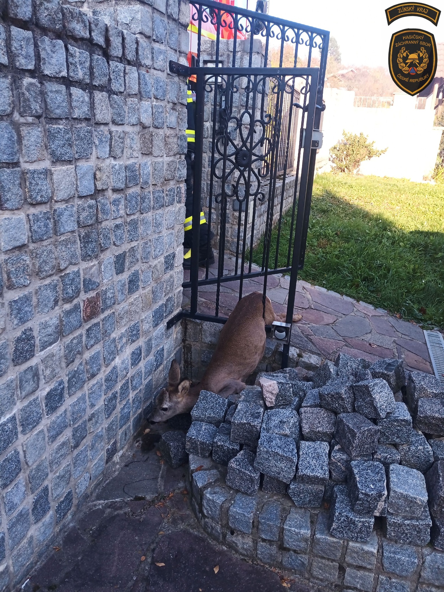 Zlínští profesionální hasiči zasahovali dnes dopoledne ve Zlíně - Prštném, kde se srna zasekla v brance u rodinného domu.Po příjezdu hasiči zvíře opatrně protáhli brankou.