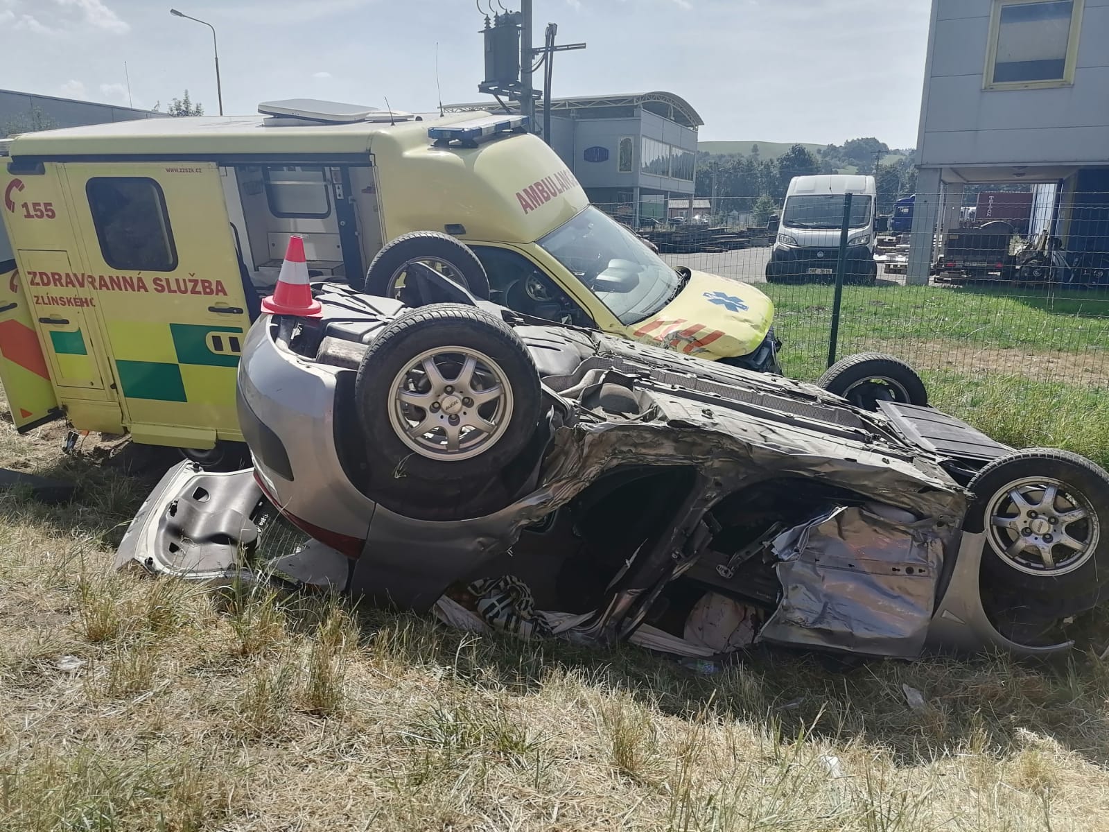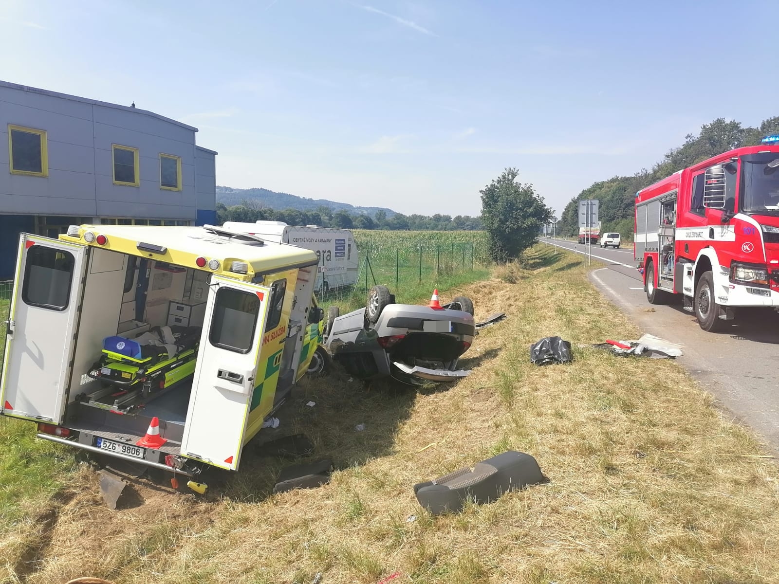 Sanitní vůz VW Transporter sjel mimo silnici, kde na rozdíl od osobního auta, zůstal stát na kolech. Převážející pacientku si převzali další zdravotníci a převezli ji do nemocnice. Tam skončila i dvoučlenná posádka rozbité sanitky.