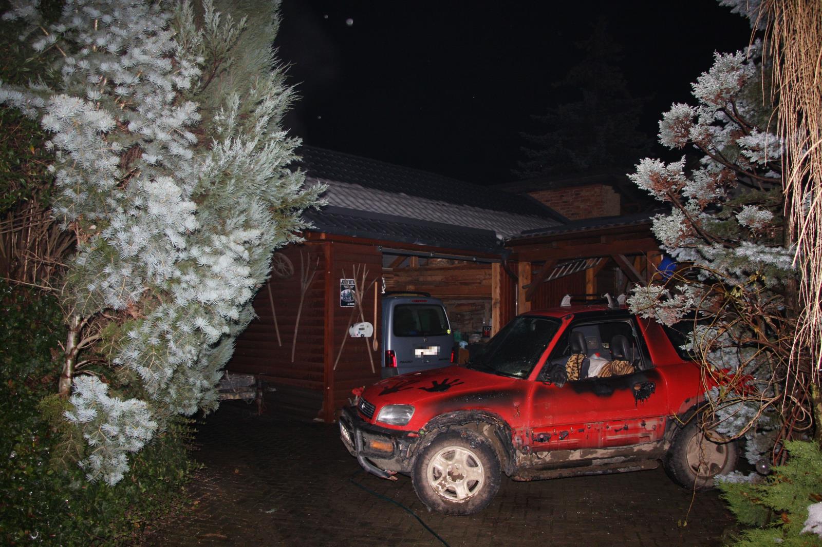 od hořícího objektu s vozem Toyota RAV. Tím zabránil k rozšíření požáru na automobil a sousední dřevěný objekt. Pak roztáhl zahradní hadici a začal plameny hasit vodou až do příjezdu hasičů. Automobil z boku poškodily plameny.