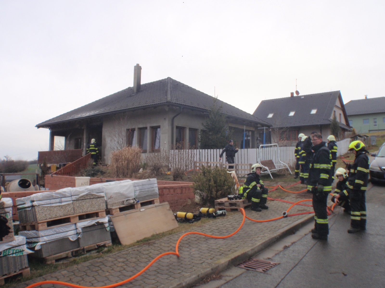 Na místě byli jako první dobrovolní hasiči z Kvasic. Ti průzkumem zjistili, že hoří dřevěný podhled terasy a dřevěný krov střechy. Hasiči v dýchacích přístrojích provedli odpojení elektřiny a začali hasit jedním proudem vody. Po příjezdu profesionálních hasičů z Kroměříže byli odesláni zpět na stanici profesionální hasiči z Otrokovic. Dále byl na stanici v Kroměříži odeslán automobilový žebřík a jedna automobilová cisterna.