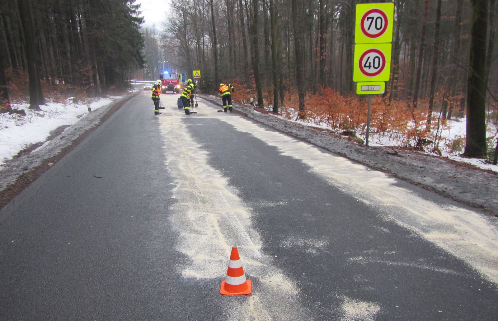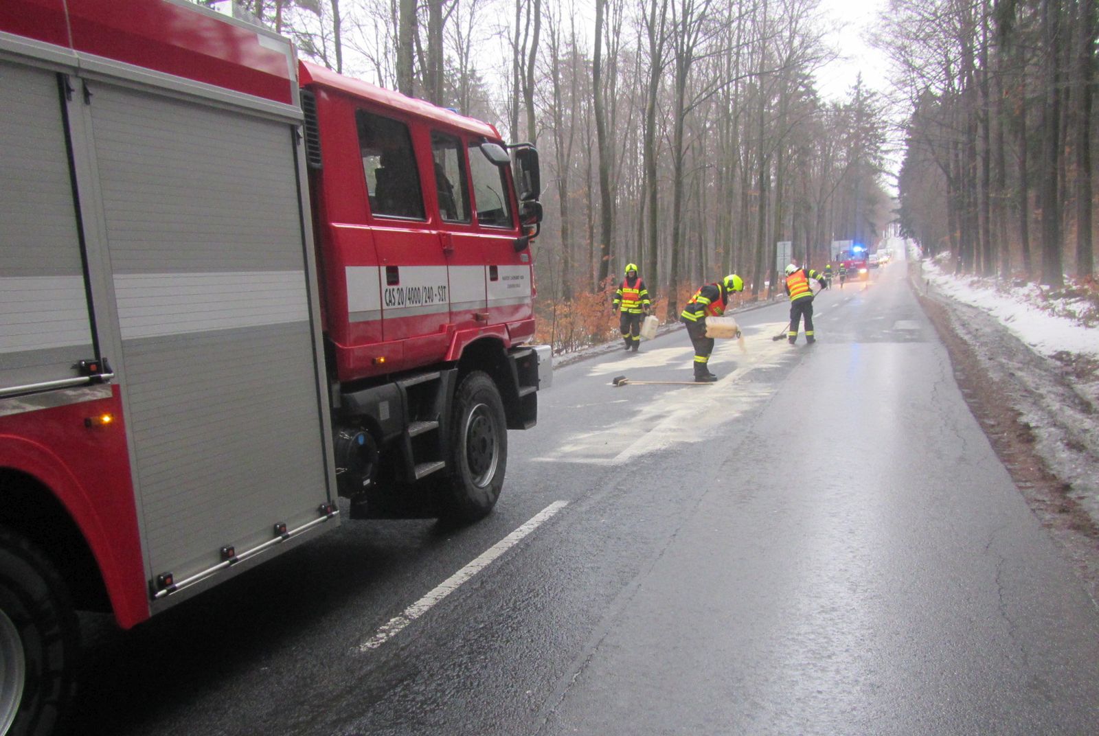 V 15:30 hodin přijal operátor tísňové linky krajských hasičů ve Zlíně oznámení o úniku nafty na komunikaci v táhlém stoupání z Pozlovic směrem na Petrůvku u Luhačovic. Podle oznamovatele byla komunikace znečištěna v délce asi 400 metrů a její povrch byl velmi kluzký.