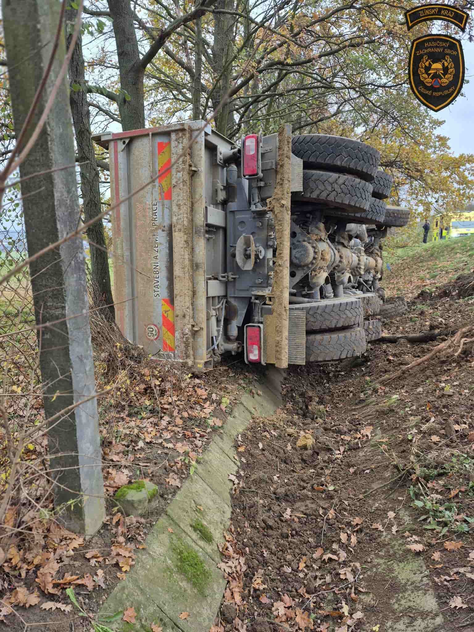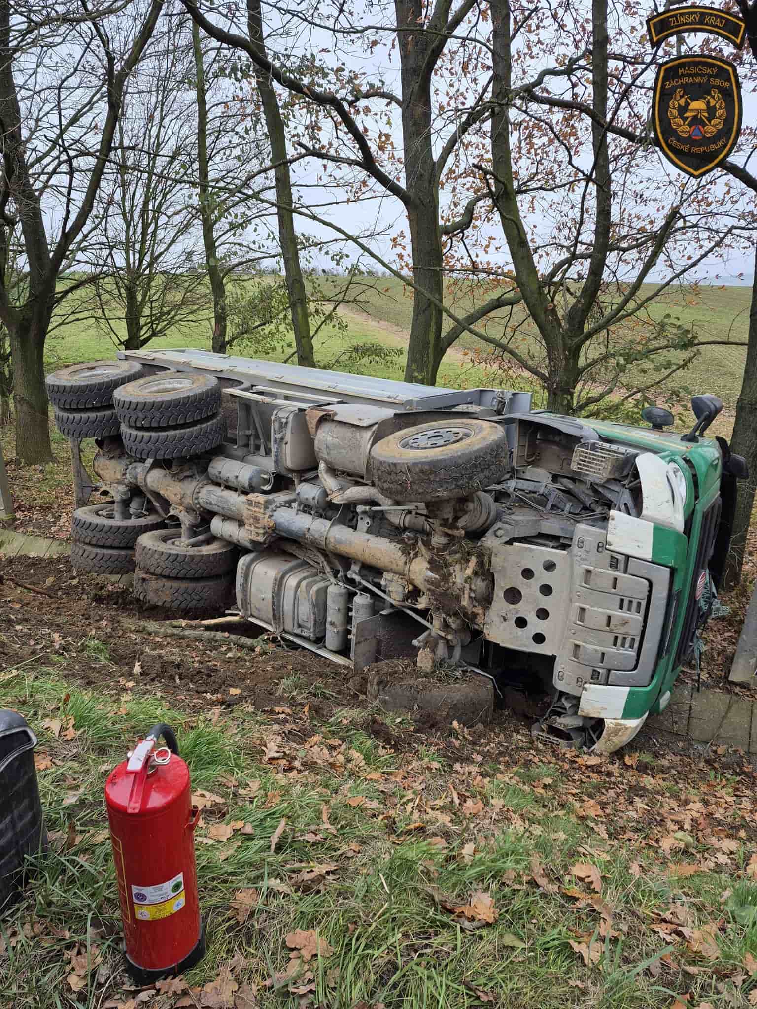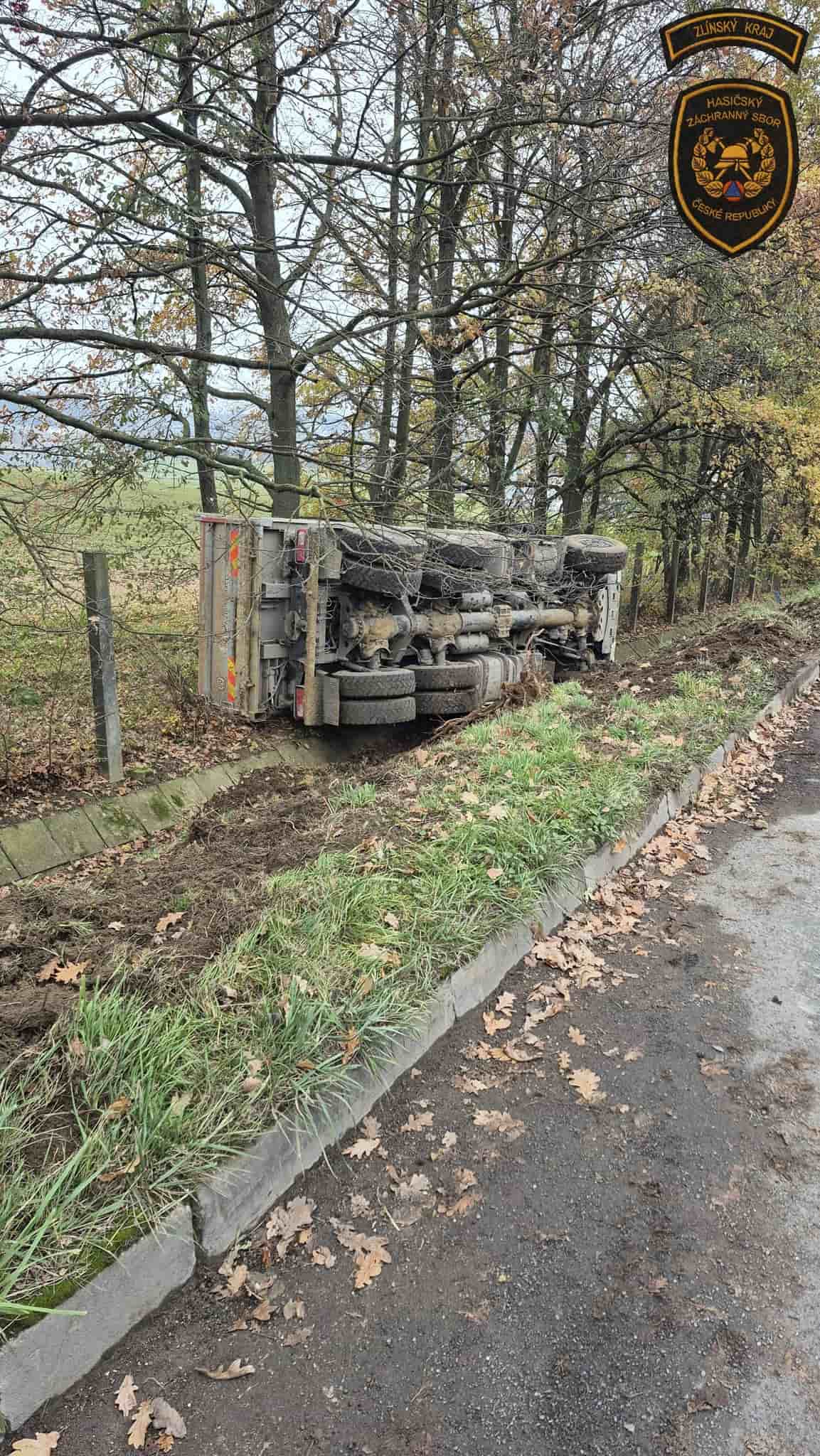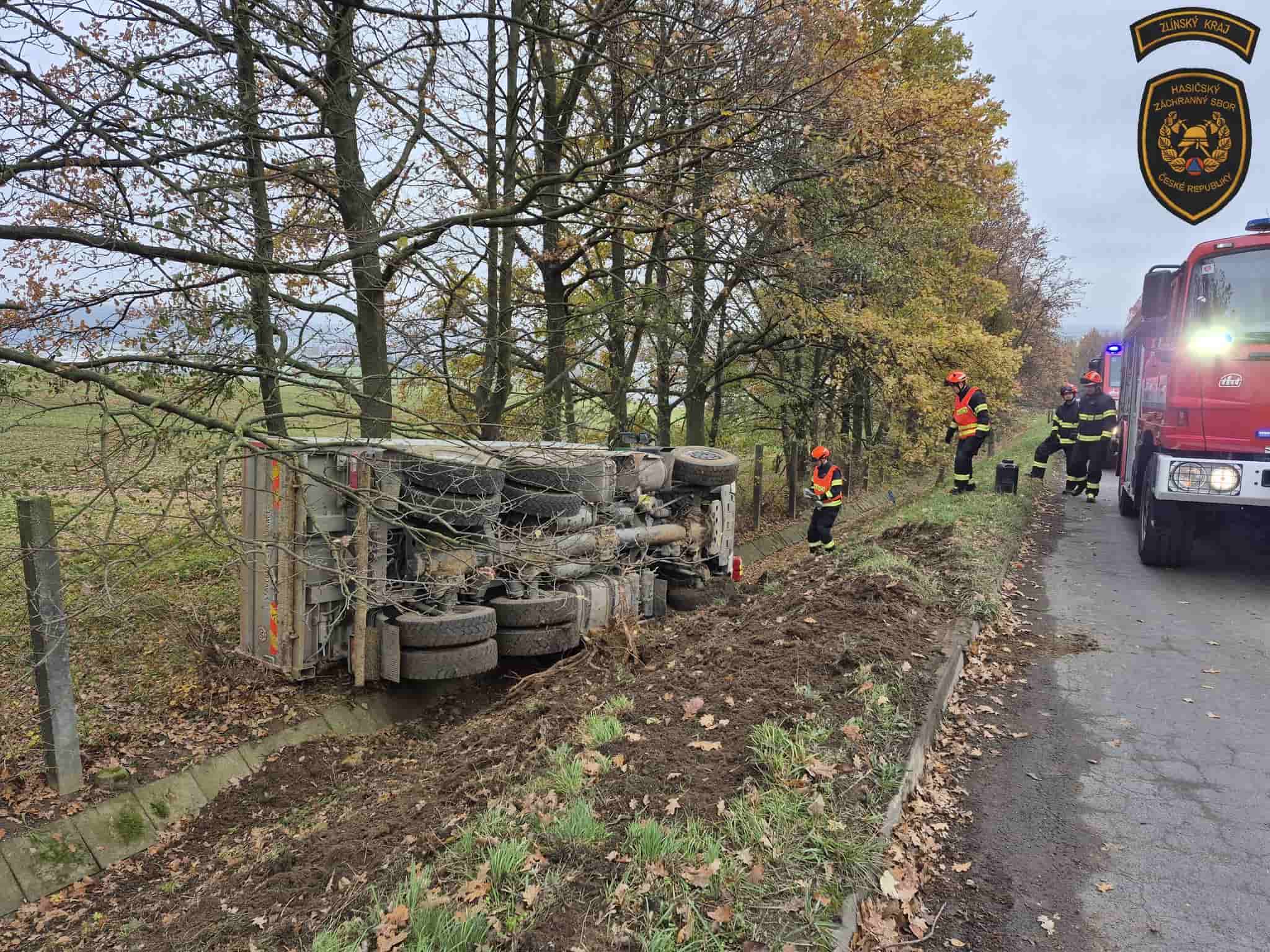 Dopolední nehoda v Otrokovicích–Kvítkovicích zaměstnala složky integrovaného záchranného systému. Nákladní vůz sjel ze silnice a převrátil se na bok mimo komunikaci. Hasiči ze Zlína a Otrokovic provedli protipožární opatření, zachytili unikající provozní kapaliny a zajistili místo, zatímco řidič byl převezen do nemocnice.