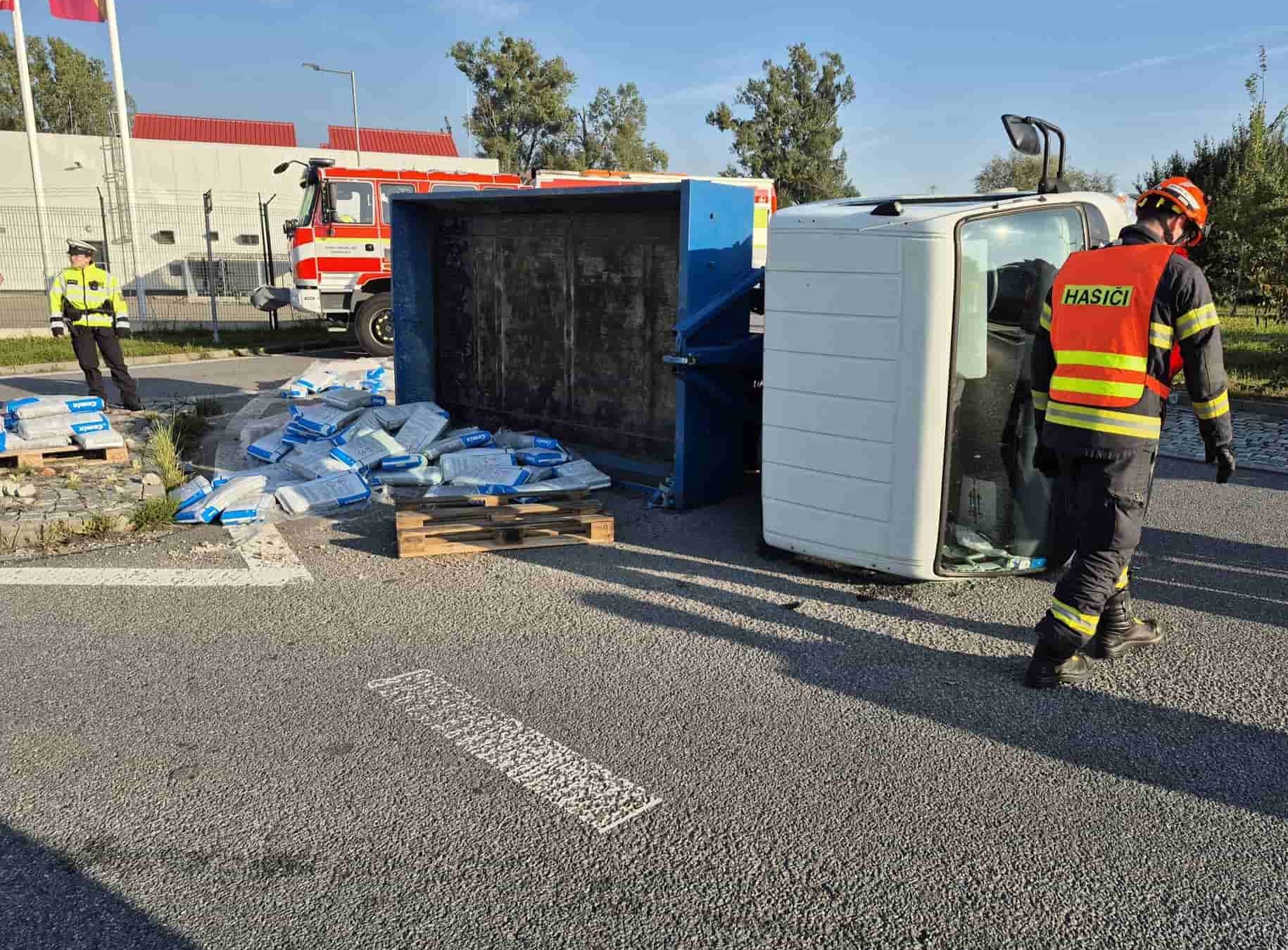 Nákladní vůz se převrátil na kruhovém objezdu: Hasiči zasahovali u nebezpečného úniku kapalin