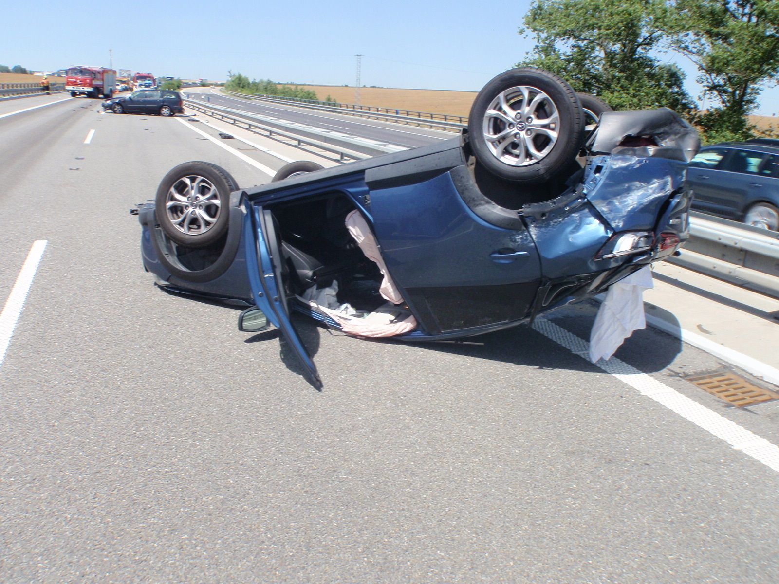 Nehoda na dálnici D1 s vozidlem na střeše na 253 kilometru ve směru na Ostravu byla hasičům ohlášena v 11:28 hodin. K nehodě byla vyslána jednotka profesionálních hasičů z Kroměříže a v rámci mezikrajské výpomoci i jednotka profesionálních hasičů z Kojetína a dobrovolných hasičů z Němčic nad Hanou.