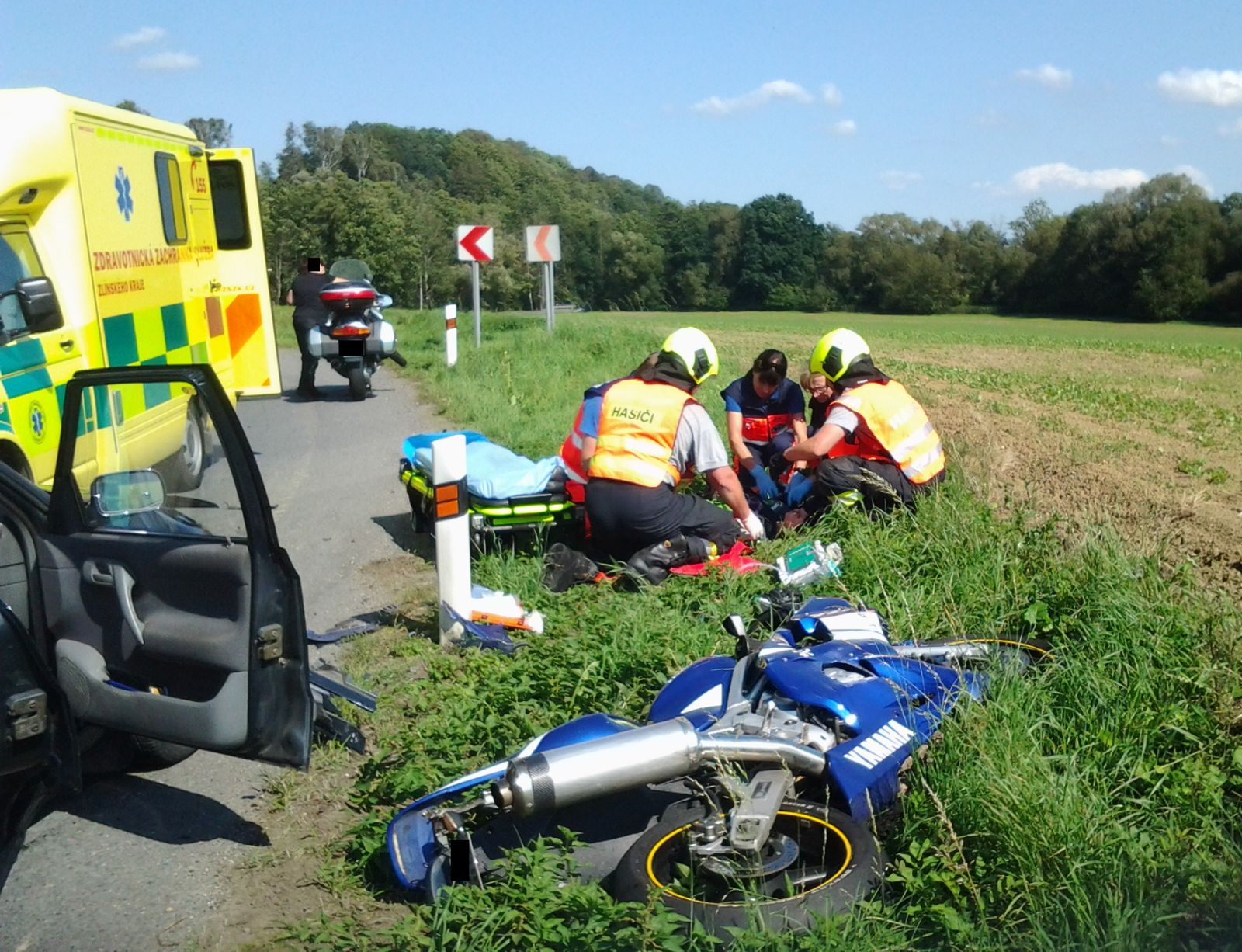 Profesionální hasiči dorazili na místo hlášené události bezprostředně za záchranáři. Těm také asistovali při ošetření a naložení vážně zraněné řidičky motocyklu. Ke kontrole do nemocnice byla následně odvezena i řidička a spolujezdkyně z osobního vozidla.