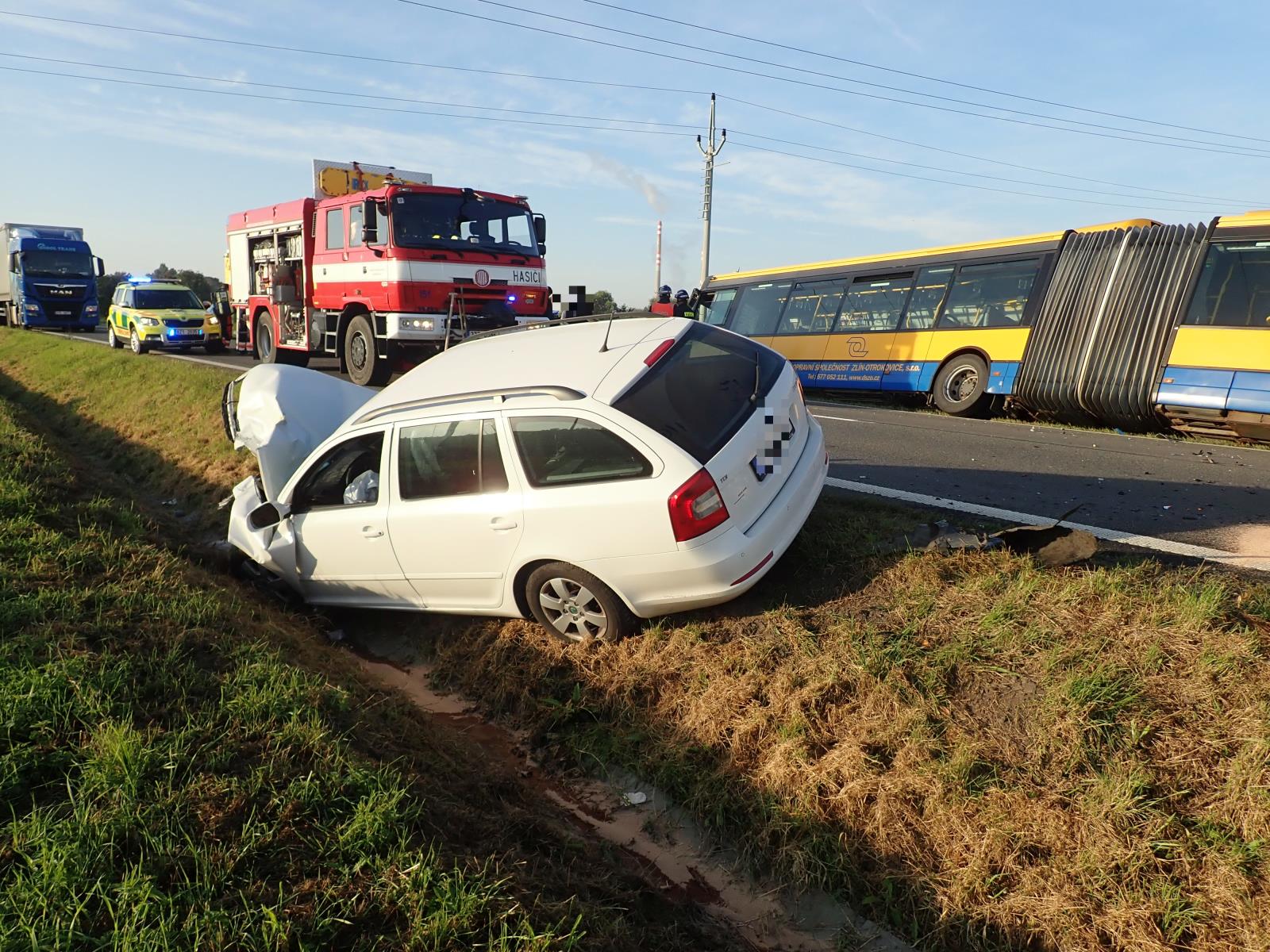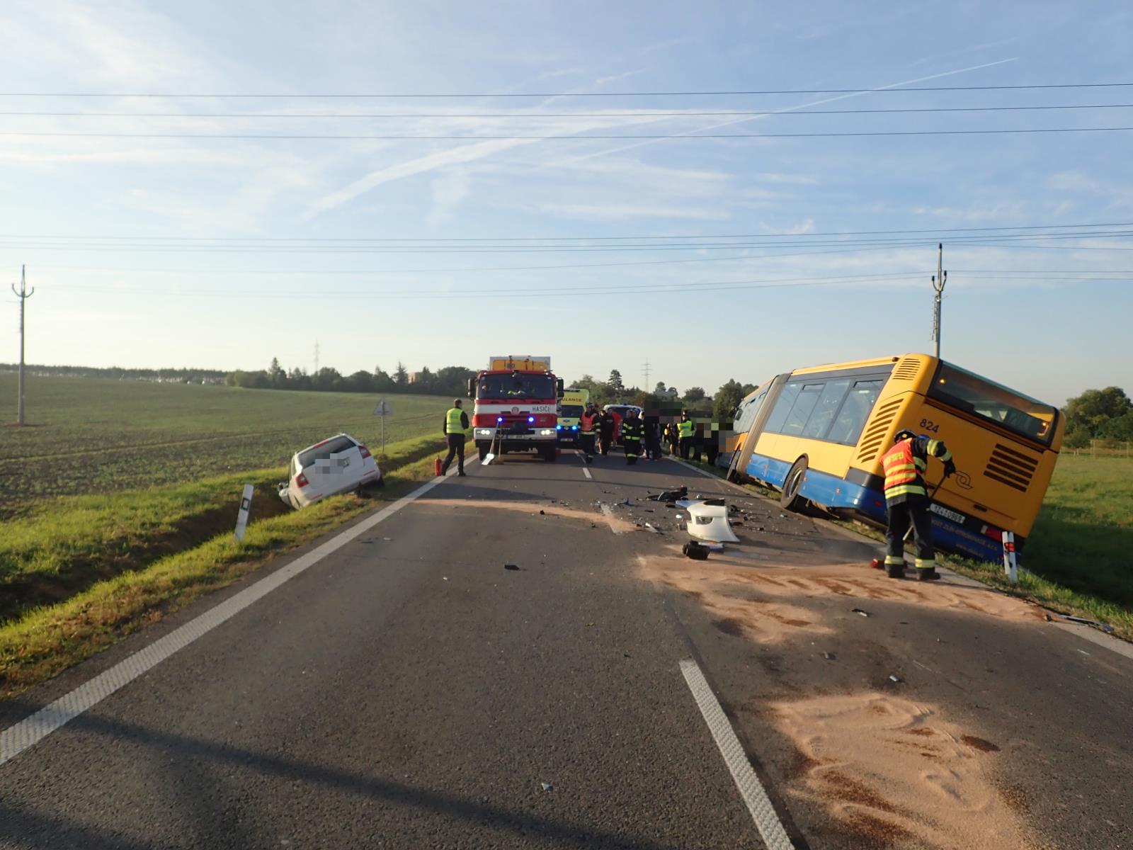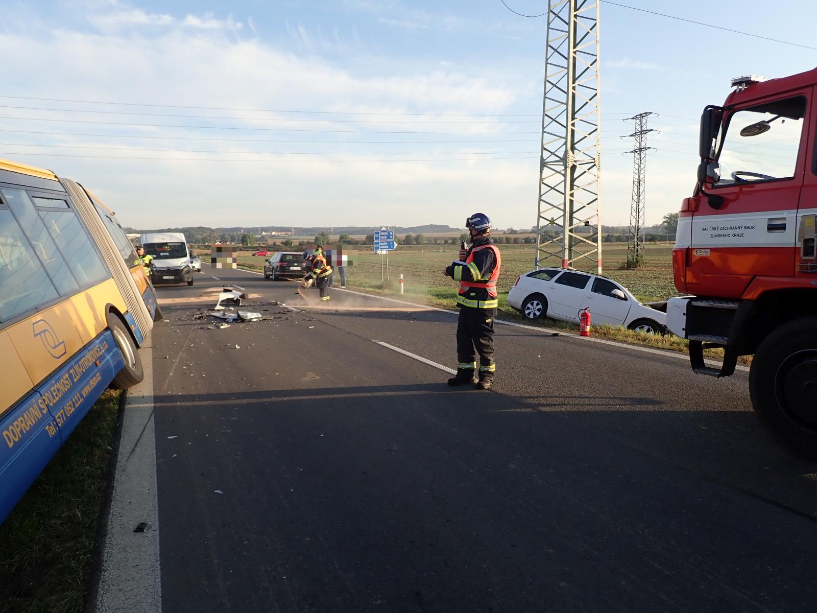 16.9.2019) Pár minut před půl osmou ranní vyjeli profesionální hasiči ze stanice Otrokovice k dopravní nehodě osobního vozidla a linkového autobusu na silnici od Otrokovic směrem na Tlumačov.
