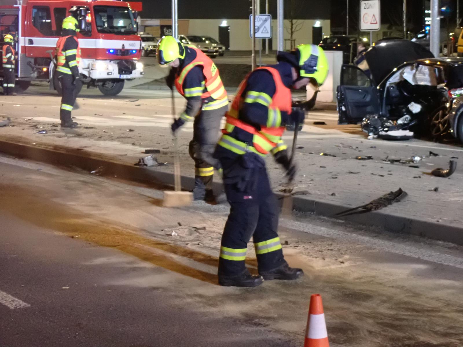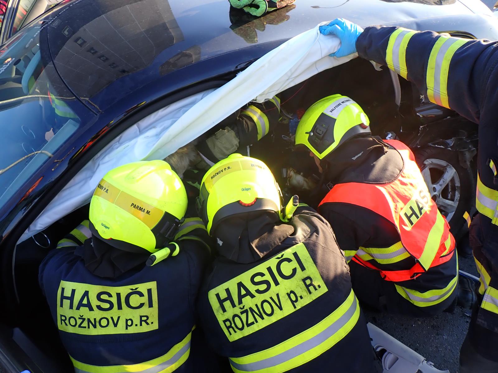 Pár minut po šesté hodině večerní byli vysláni k nehodě profesionální hasiči ze stanice Valašské Meziříčí a hasiči města Rožnov pod Radhoštěm. Ti po příjezdu průzkumem zjistili, že došlo ke střetu tří osobních vozidel a ke zranění chodkyně. Neprodleně zahájili vyprošťovací práce, aby vytáhli z vozidla řidičku. S použitím hydraulických nůžek se hasiči dostali k řidičce a poté ji na páteřové desce vytáhli ven z vraku vozidla. Taktéž u vozidel provedli protipožární opatření a odpojení autobaterií. Došlo i k velkému úniku provozních kapalin, které hasiči zasypali sorbentem.