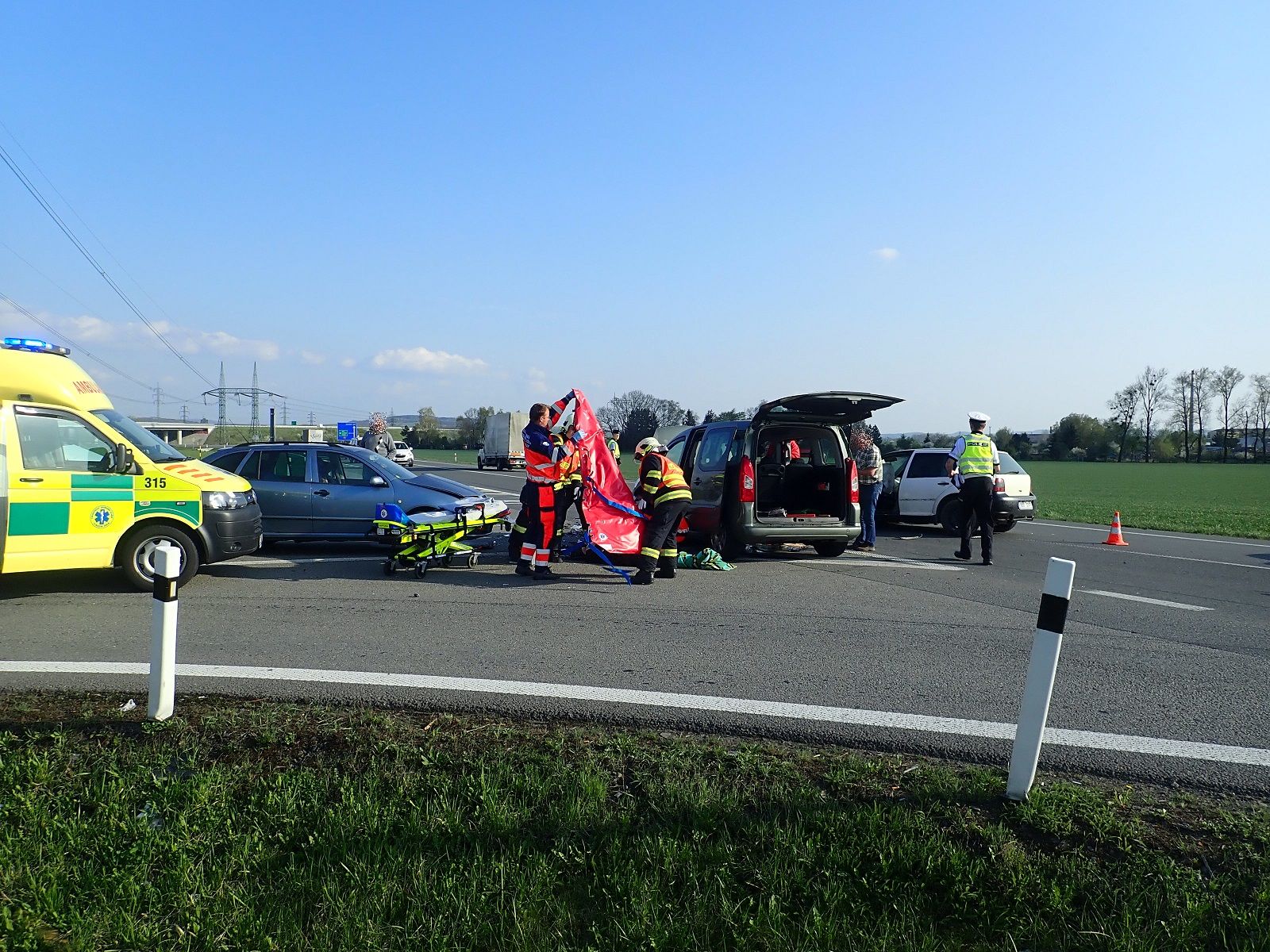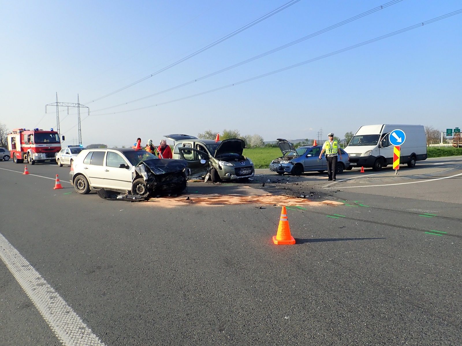 17. 4. 2018 v  odpoledních hodinách došlo u Hulína na Kroměřížsku, na sjezdu číslo 17 z dálnice D55, k dopravní nehodě tří osobních vozidel a jedné dodávky.