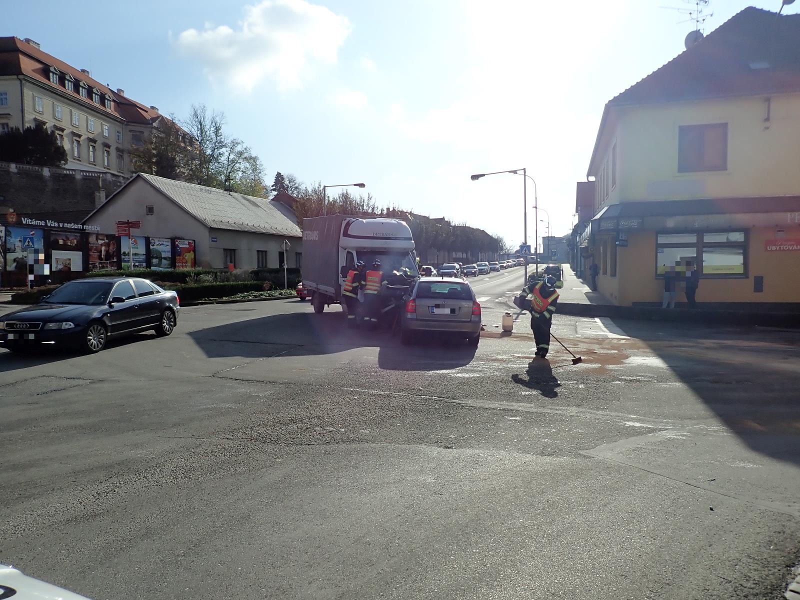 Ke střetu osobního vozidla a dodávky došlo v Napajedlech na křižovatce pod místním zámkem. Při nehodě byla zraněna řidička osobního vozidla, která skončila v péči záchranářů ještě před příjezdem hasičů. Druhý řidič vyvázl bez zranění. Hasiči byli na místo povoláni z důvodu úniku provozních kapalin z havarovaných vozidel. Hasiči proto ihned po příjezdu k místu nehody zasypali sorbentem uniklé provozní kapaliny. Poté u obou vozidel odpojili autobaterie a provedli protipožární opatření. Po zadokumentování nehody Policií ČR hasiči pomohli s odtažením vozidel. Nakonec provedli úklid vozovky od střepů a úlomků z aut.
