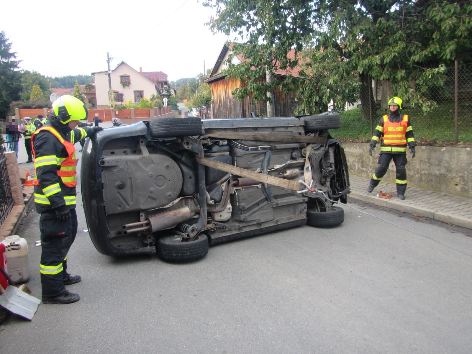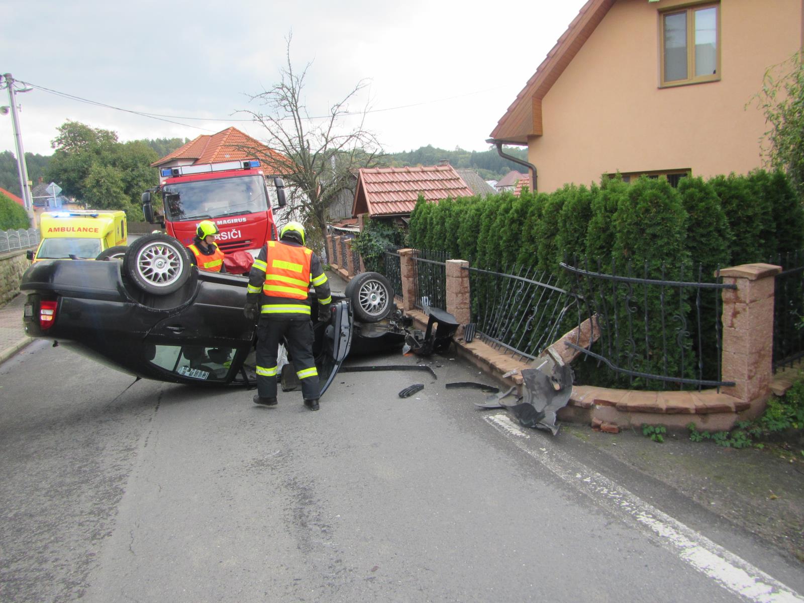 Jednotka po svém příjezdu provedla průzkum místa události, přičemž zjistila, že zde havaroval řidič, jedoucí ve vozidle sám, jehož vozidlo narazilo do plotu rodinného domu a po nehodě skončilo na střeše. Z vozidla unikaly provozní kapaliny, které hasiči zasypali sorbentem. Taktéž u vozidla provedli protipožární opatření.