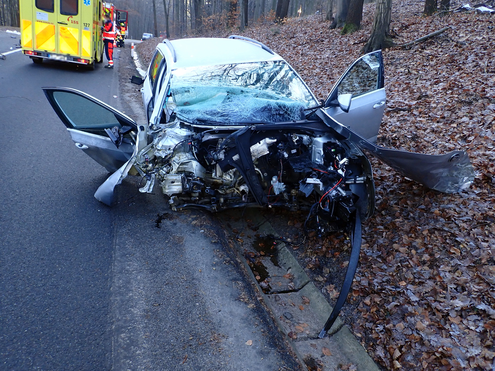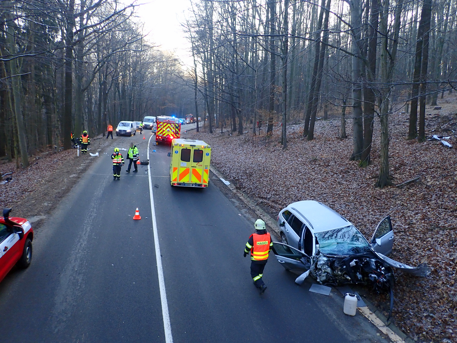 V době jejich příjezdu se již řidič nacházel mimo vrak vozu a do své péče si jej převzala posádka zdravotnické záchranné služby. Hasiči zajistili místo nehody a provedli protipožární zabezpečení automobilu. V době dokumentace nehody policií byla komunikace úplně uzavřena. Po jejím ukončení hasiči pomohli s naložením vraku vozu na odtahovou službu a uklidili povrch vozovky od střepů a úlomků. Krátce před dvanáctou hodinou se hasiči vrátili zpět na svou základnu.