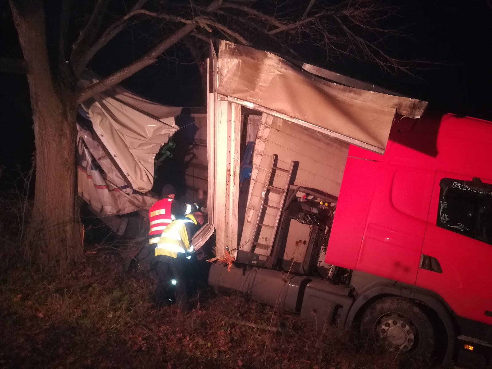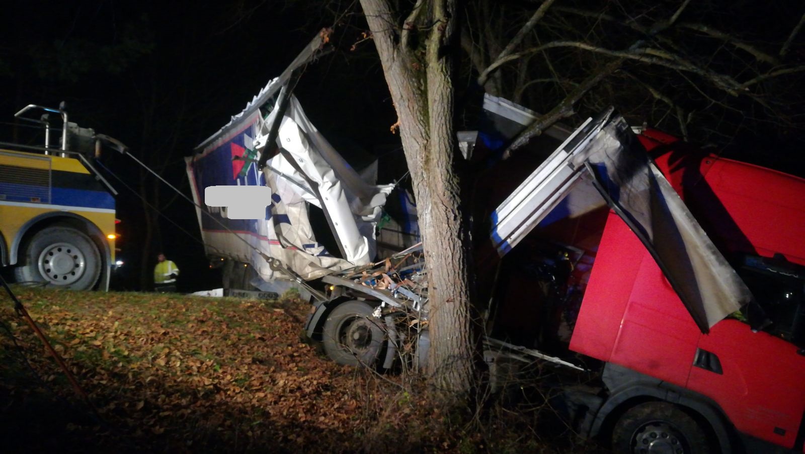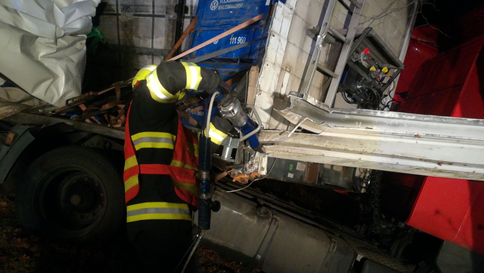 Stále probíhá vyprošťování kamionu pomocí těžkotonážní techniky. Zasahující hasiči napomáhají za využití hydraulických vyprošťovacích nůžek vyprostit zaklíněné vozidlo ve stromech odstřižením bočních stran kamionu.