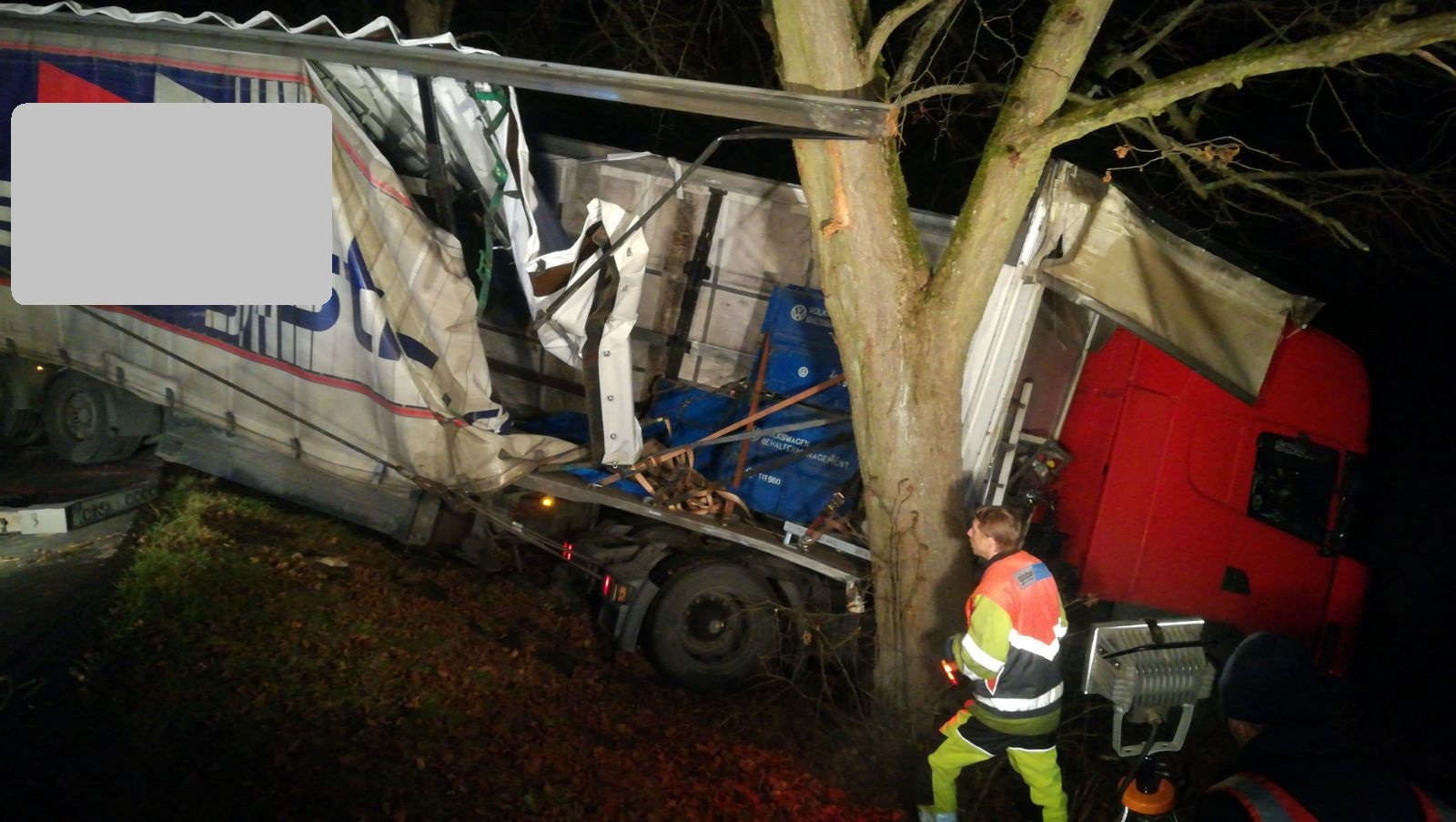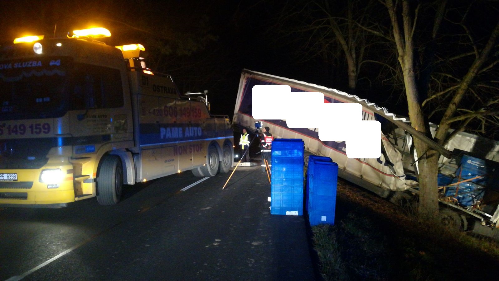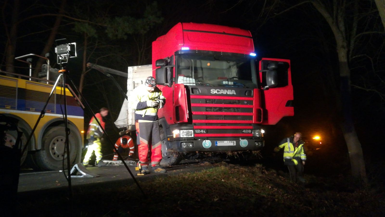 Stále probíhá vyprošťování kamionu pomocí těžkotonážní techniky. Zasahující hasiči napomáhají za využití hydraulických vyprošťovacích nůžek vyprostit zaklíněné vozidlo ve stromech odstřižením bočních stran kamionu.
