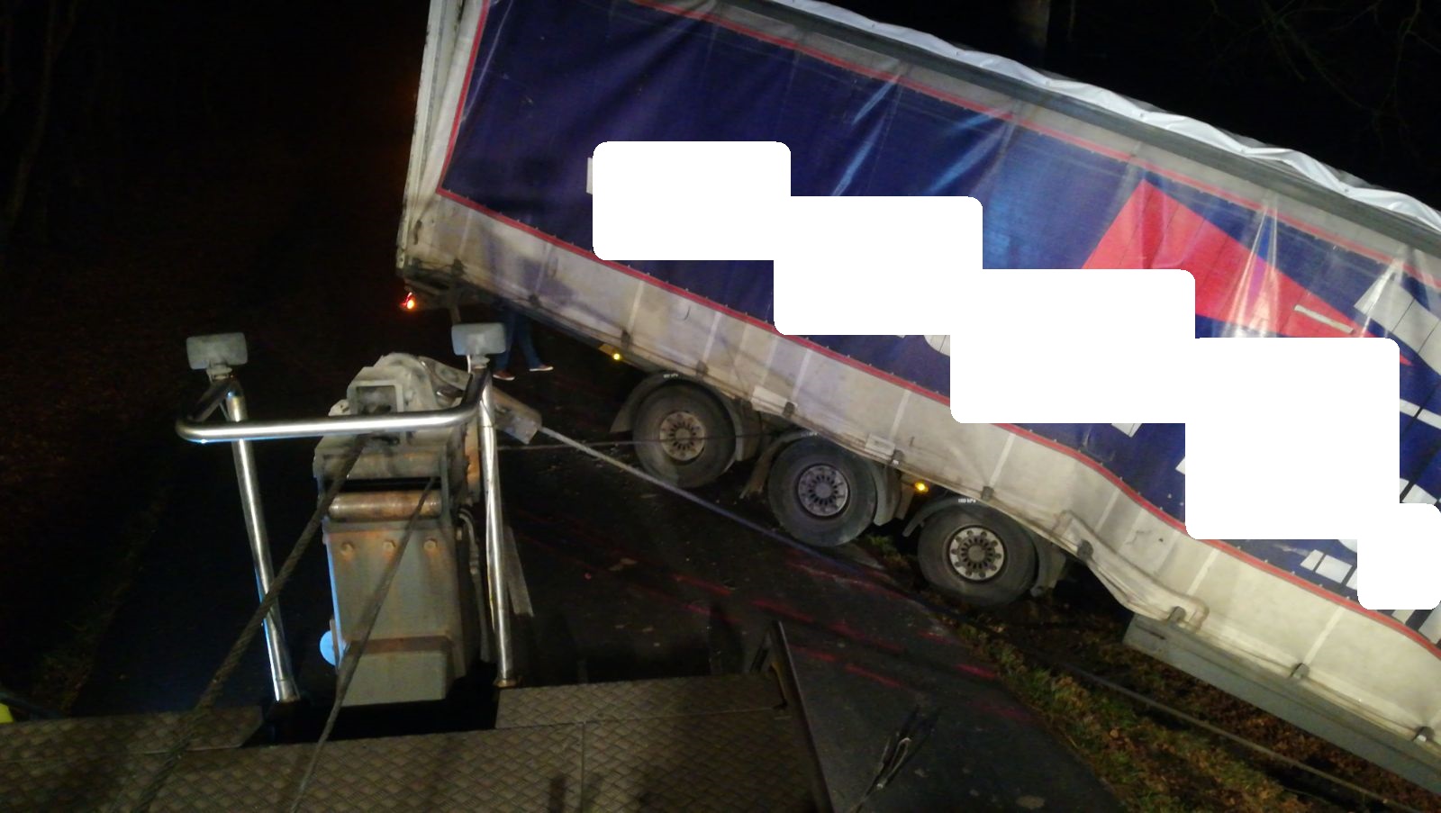 K vyproštění kamionu z příkopu zpět na silnici byla povolána těžkotonážní vyprošťovací technika. Do jejího příjezdu hasiči vyskládali z kamionu část nákladu o váze okolo dvou tun. Zbytek zajistili tak, aby se při vyprošťování kamionu náklad nehýbal.