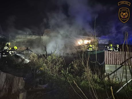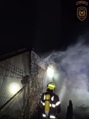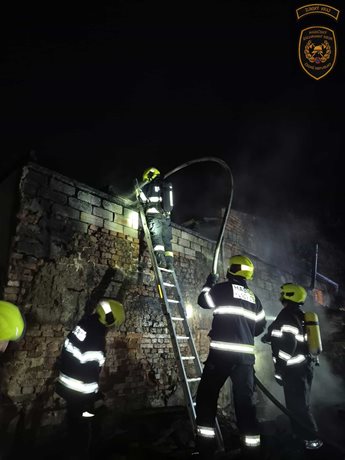Noční požár kůlny ohrozil sousední stavby, jeden hasič zraněn