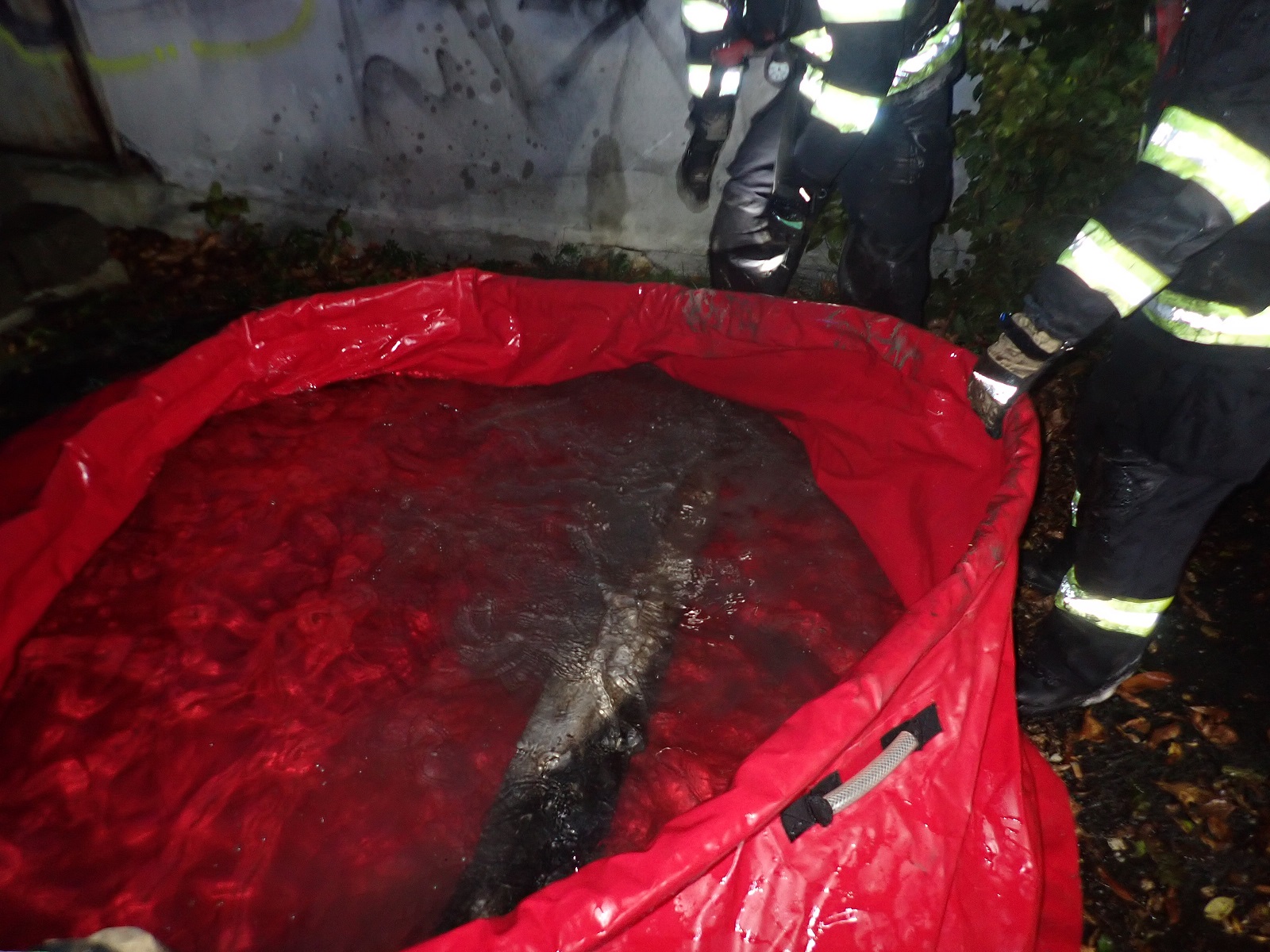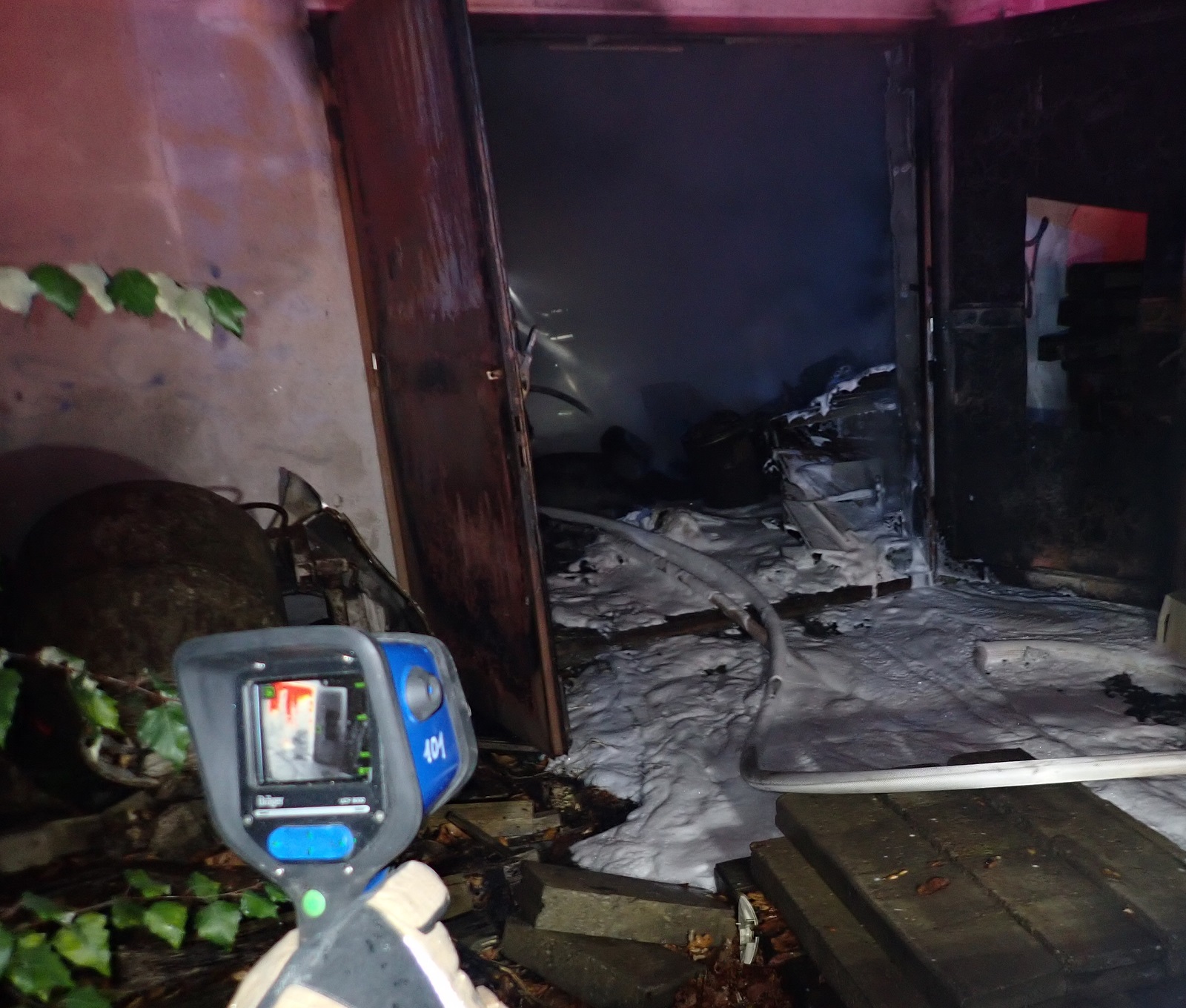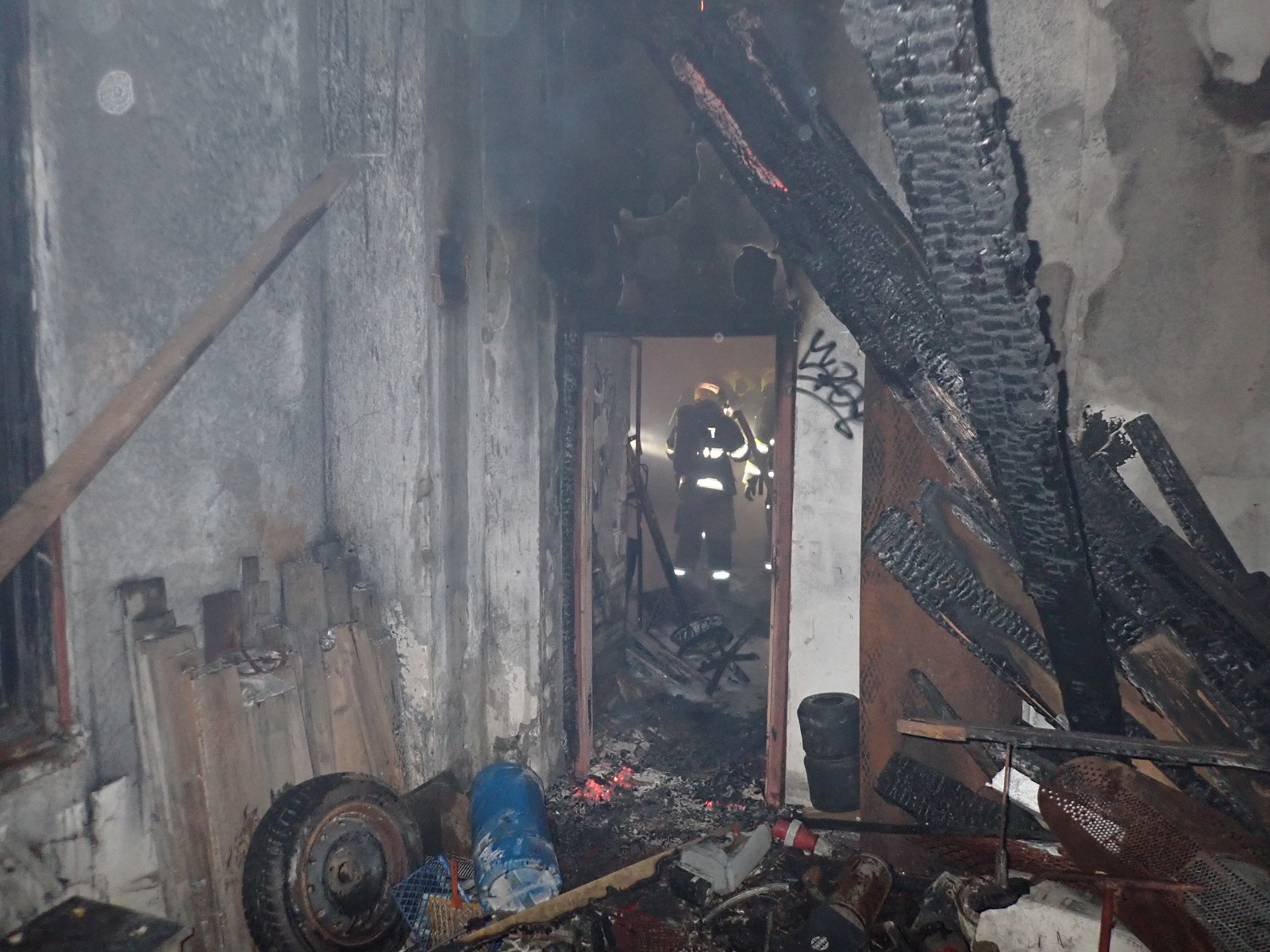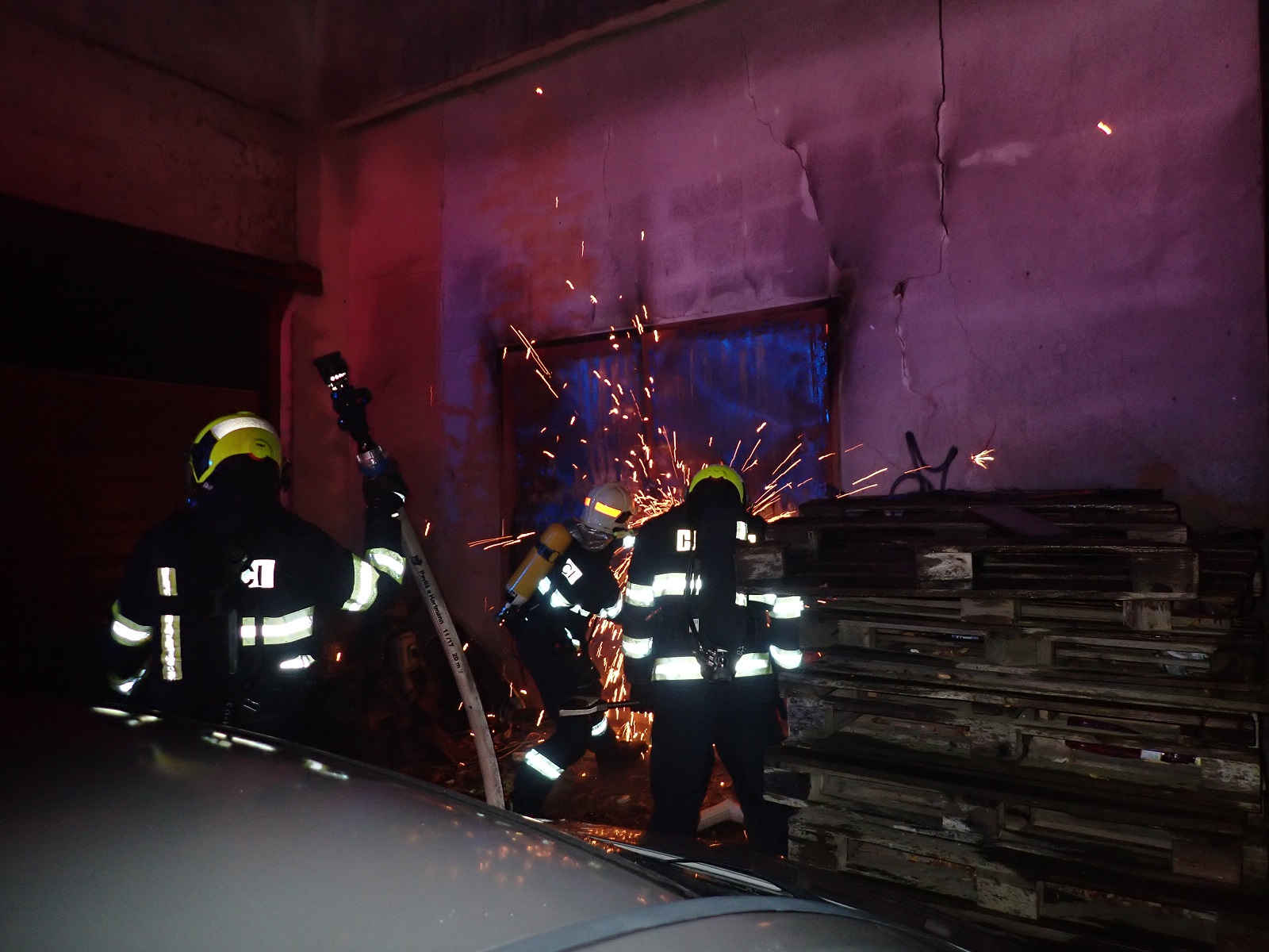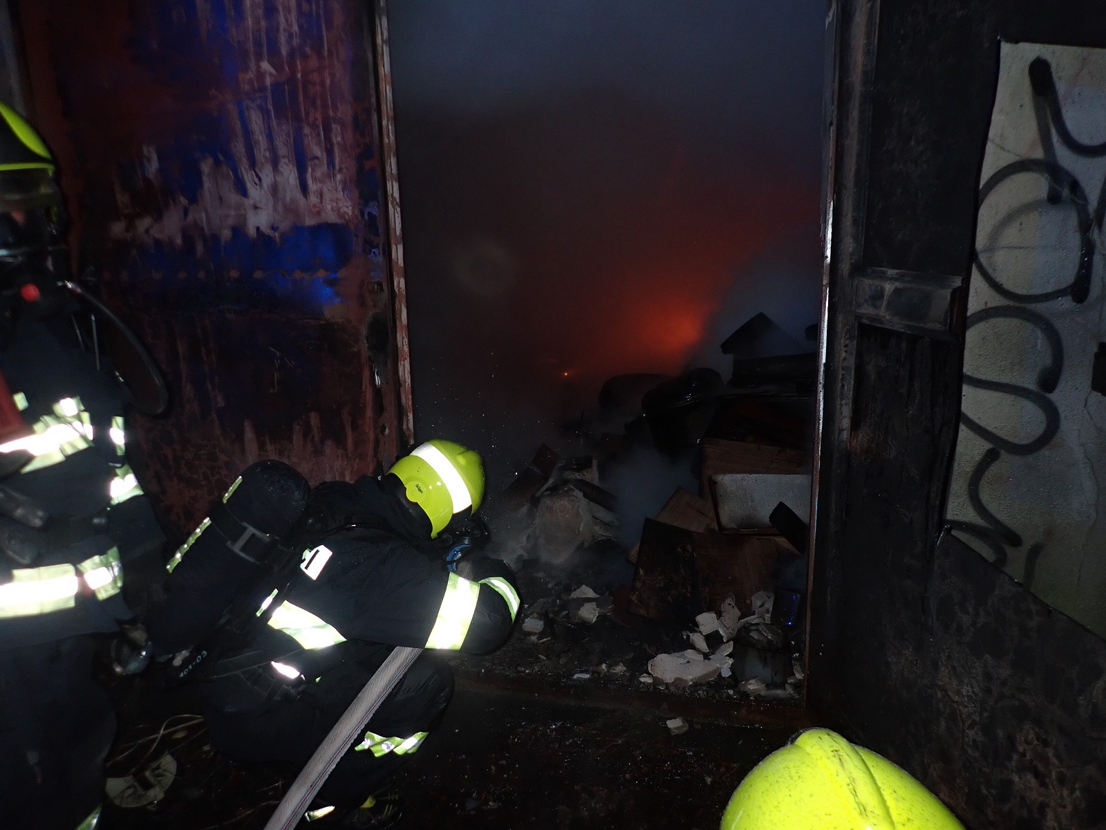 Průzkumem bylo zjištěno, že hoří uvnitř uzamčeného objektu bývalého pneuservisu na ulici Příční. Na uhašení požáru byly zřízeny dva útočné proudy vody C. Aby mohl být prováděn hasební zásah v budově, musel být v kovových vratech vyřezán otvor rozbrušovačkou. Hasiči v dýchacích přístrojích nalezli uvnitř čtyři tlakové láhve na plyn. Láhve byly opálené, takže nebylo zřejmé, jaký plyn v nich je. Láhve byly ochlazovány vodou. Teplota pláště jedné láhve neklesala, a proto byla vložena do ochlazovacího bazénku. Bylo zjištěno, že v láhvi v bazénku je acetylén. Kolem bazénku bylo vytvořeno bezpečnostní pásmo. Po uhašení požáru byly vnitřní prostory odvětrány přetlakovým ventilátorem. V budově nebyly nalezeny žádné osoby.