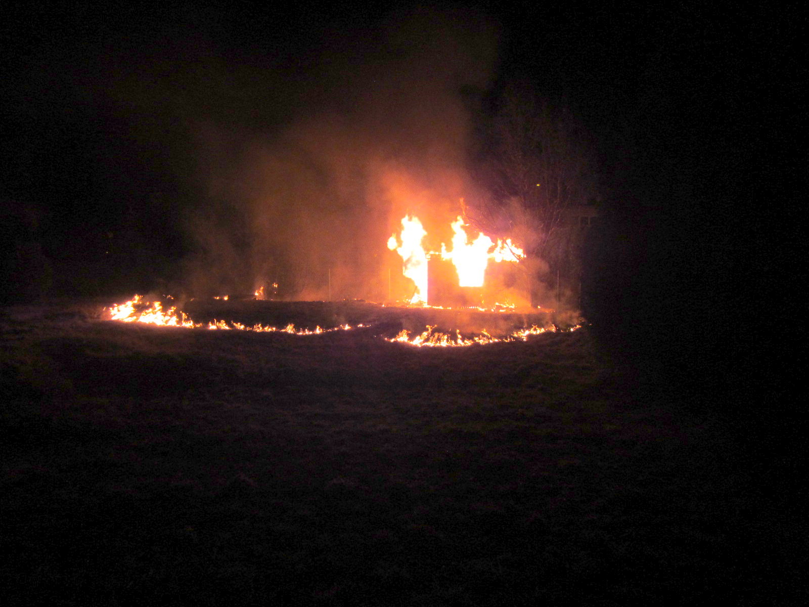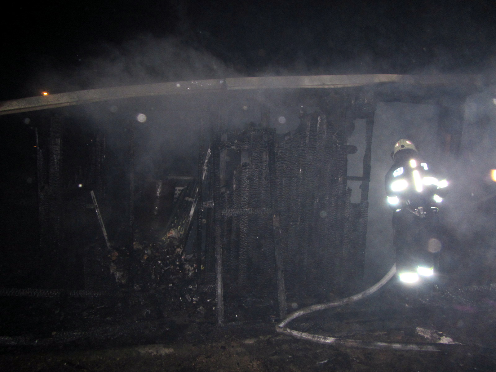 V době příjezdu jednotek na místo byl objekt kompletně v plamenech a požár se již rozšířil i na okolní trávu. Hasiči natáhli útočné vodní proudy a oheň dostali do deseti minut pod kontrolu. Postupným rozebíráním konstrukce a proléváním ohnisek vodou byl podle informací velitele v 00:37 hodin požár zlikvidován. Na místě byla následně ponechána ještě dobrovolná jednotka na hodinovou dohlídku, kvůli vyloučení nebezpečí opětovného rozhoření.