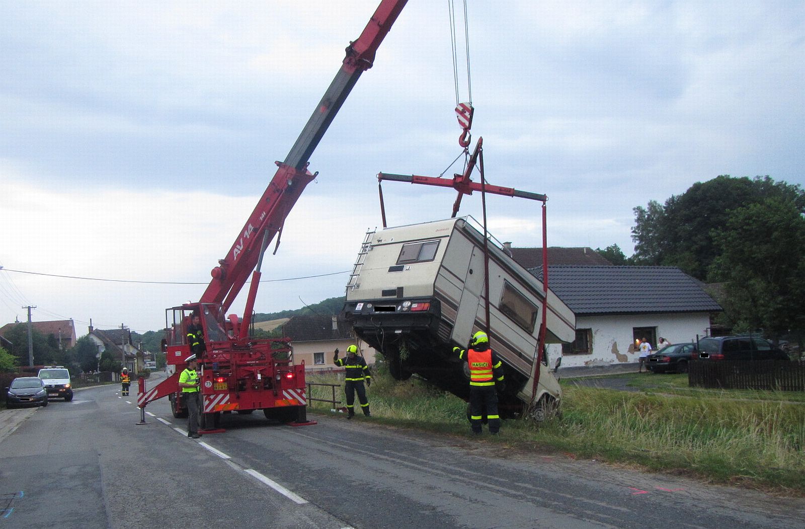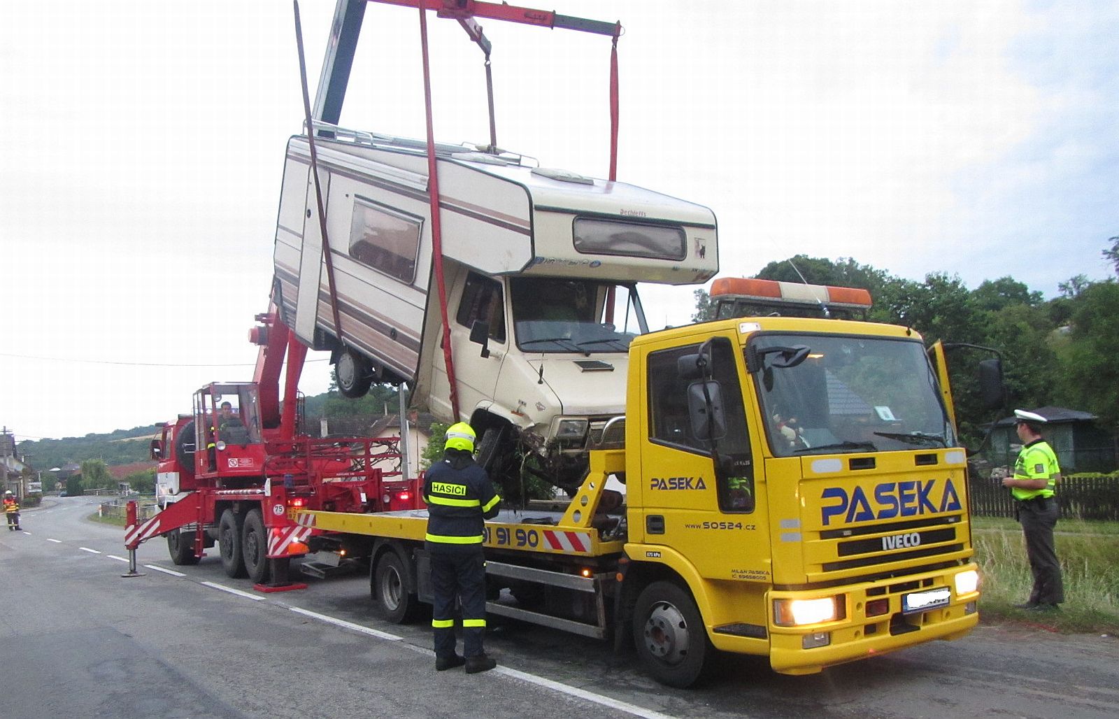 Obytné auto skončilo v korytě potoka. Vytáhl ho vyprošťovací automobil hasičů