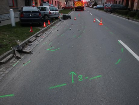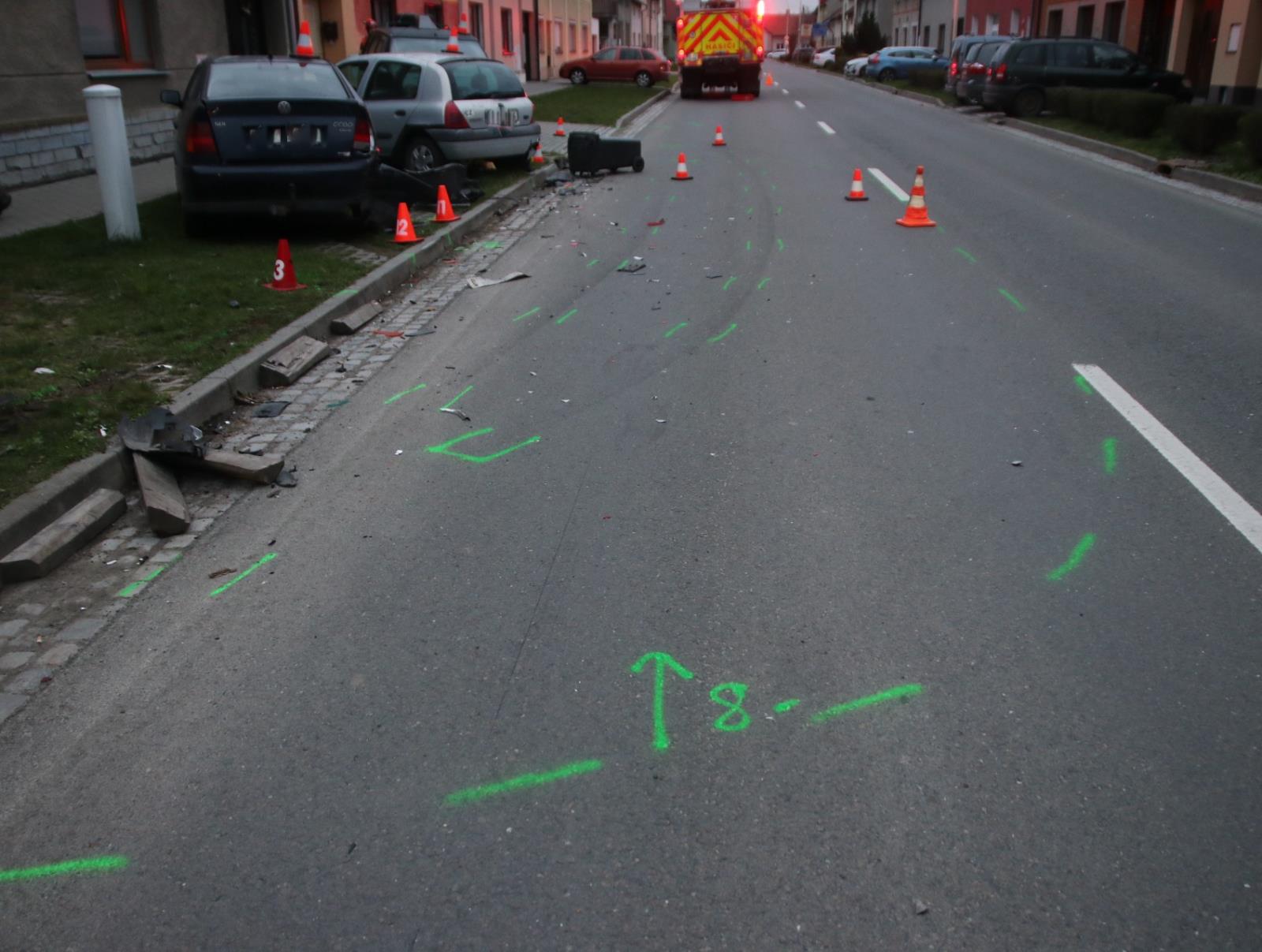 Žena sedmačtyřiceti let projížděla městem Chropyně svým vozem značky Mercedes. Policisté zaznamenali první stopy její nebezpečné jízdy na ulici Komenského, kde narazila do obrubníku a poškodila okrasné dřeviny. Pokračovala ulicí Hrad, kde nezvládla pravotočivou zatáčku, vjela na travnatý pás a postupně narazila do čtyř dalších zaparkovaných vozidel. Celková škoda byla předběžně vyčíslena na téměř čtyři sta tisíc korun.