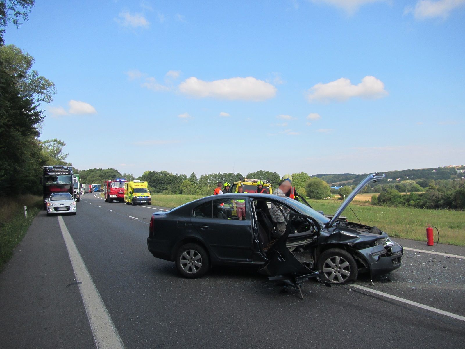 V době příjezdu hasičů byl na místě sanitní vůz zdravotnické záchranné služby, kterým byla později převezena thsanit.jpgdo nemocnice jedna zraněná osoba. Osobní vozidlo po nárazu do vozu odtahové služby blokovalo oba jízdní pruhy, takže se během chvilky vytvořily z obou stran nehody kolony vozidel.Hasiči provedli protipožární opatření.