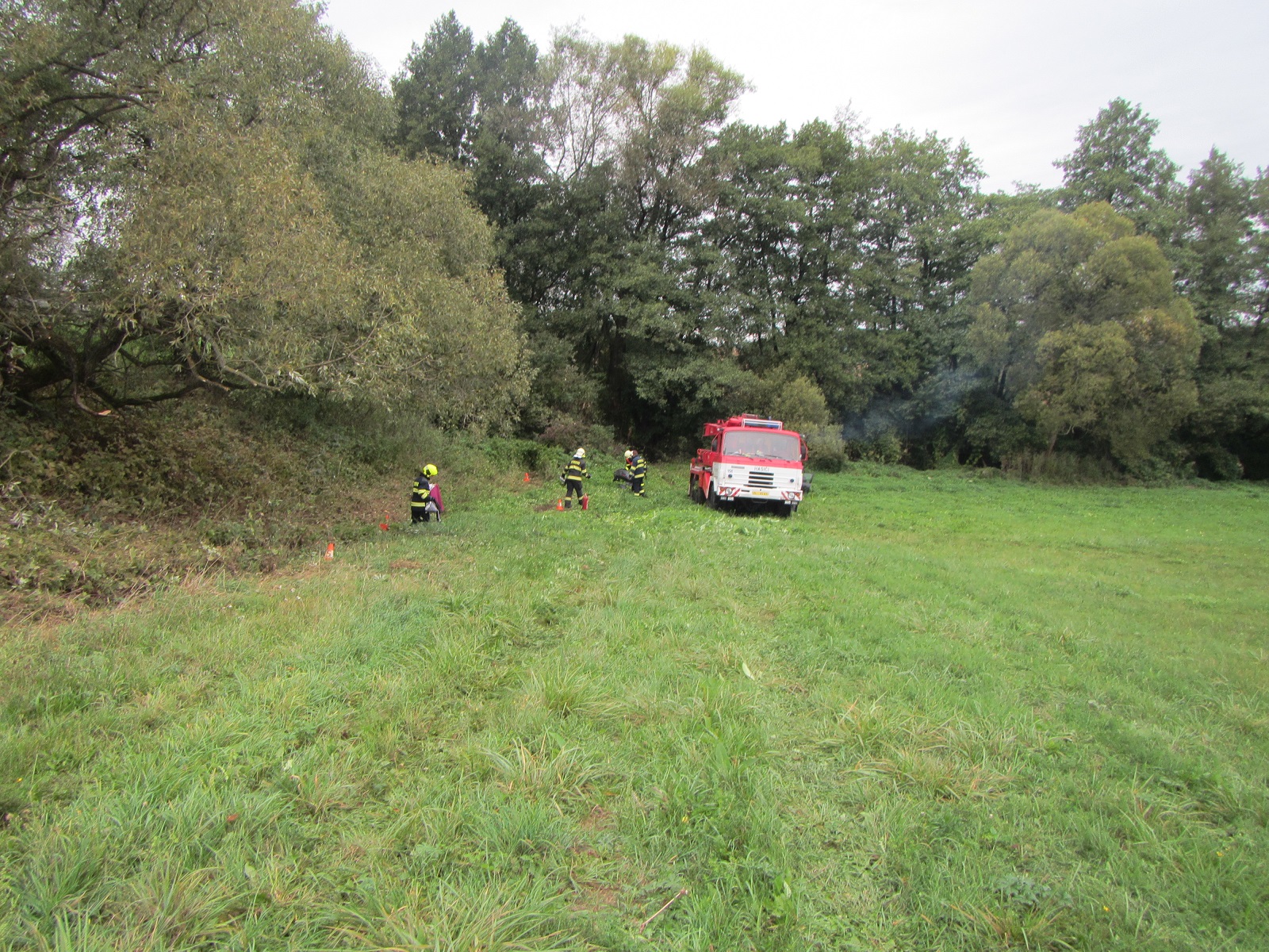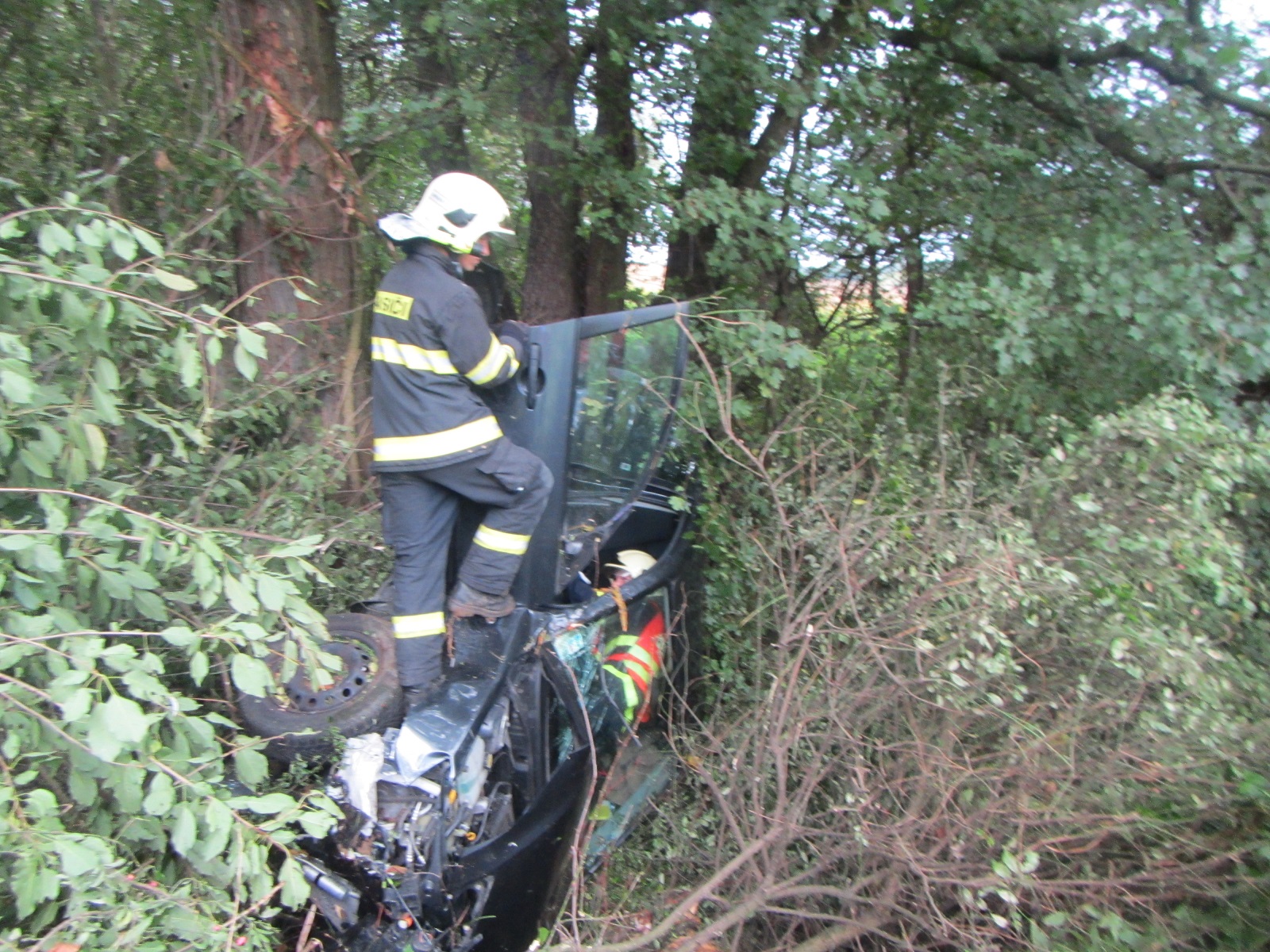 Osobní automobil sjel ze silnice po srázu a zůstal ležet zaklíněný mezi stromy v blízkosti potoka. Hasiči provedli protipožární opatření. K vytažení poškozeného vozu si velitel zásahu vyžádal příjezd vyprošťovacího automobilu. Ani po vyproštění z automobilu nevytekly žádné provozní kapaliny.