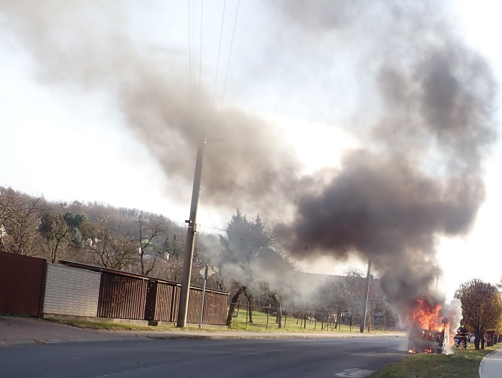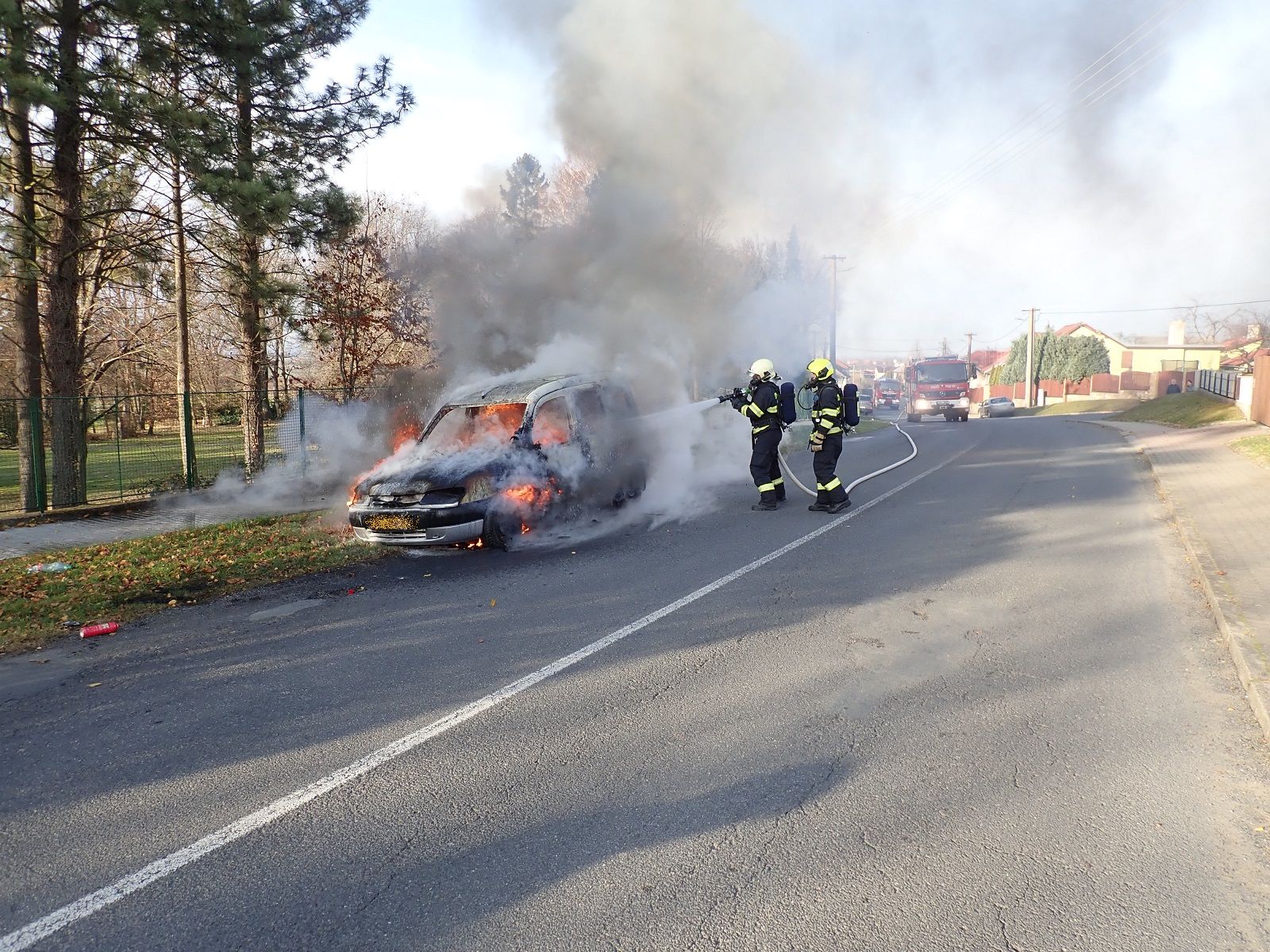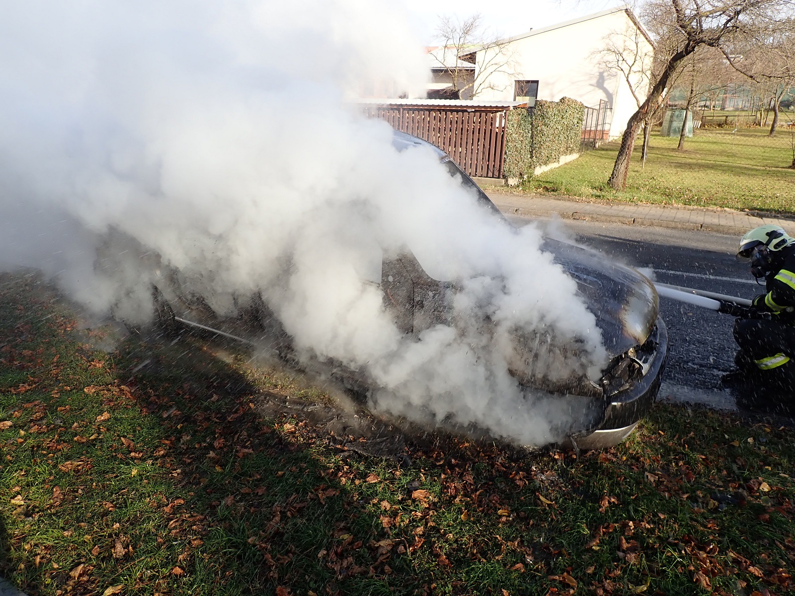 V době našeho příjezdu byl automobil celý v plamenech. Jednotka dobrovolných hasičů zahájila hašení se třemi přenosnými hasicími přístroji. Požár byl následně uhašen jedním útočným proudem C.