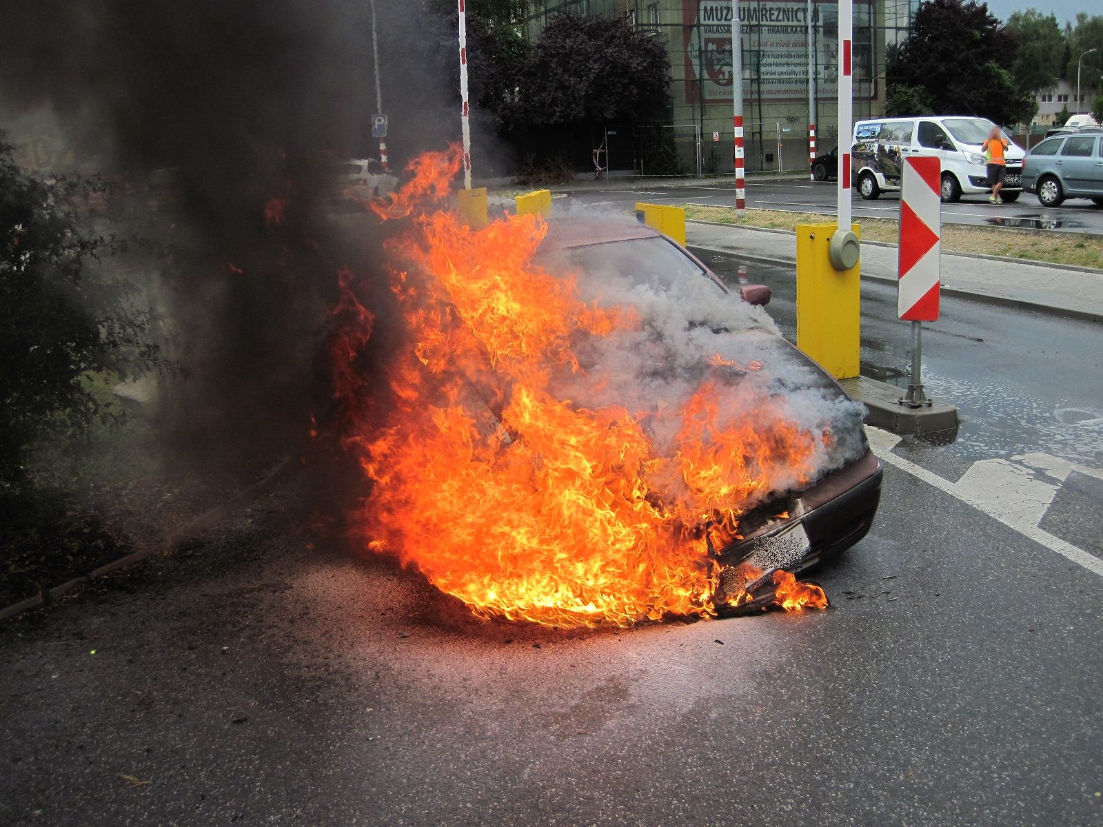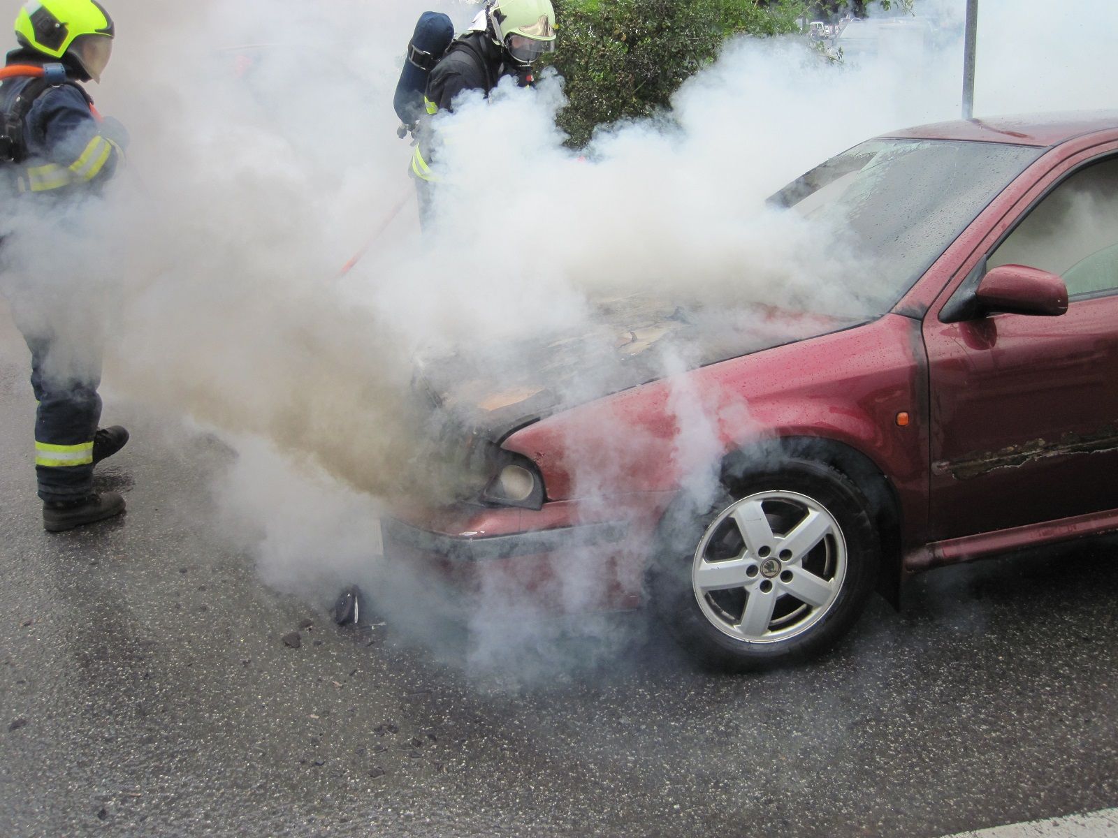 V době příjezdu hasičů byl automobil v plamenech. Hasiči v dýchacích přístrojích požár uhasili jedním vysokotlakým proudem vody...