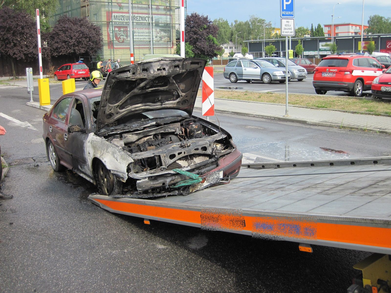 V době příjezdu hasičů byl automobil v plamenech. Hasiči v dýchacích přístrojích požár uhasili jedním vysokotlakým proudem vody. Hasiči se dozvěděli, že osádka vozu v počtu tří osob odjížděla od nákupního centra. Během jízdy se ozvala rána a vozidlo začalo hořet. Vznikající požár se osádka vozu snažila uhasit hasicími přístroji. To se jí ale nepodařilo. Požár proto oznámili hasičům.