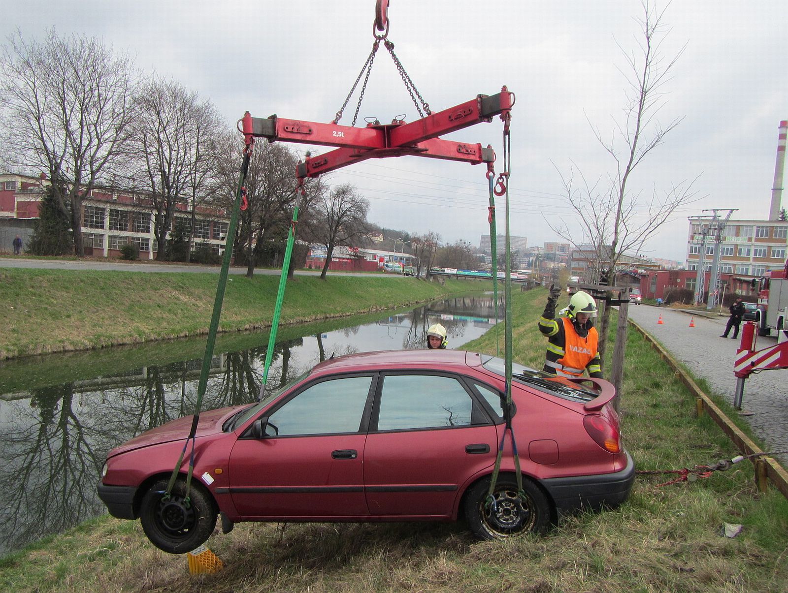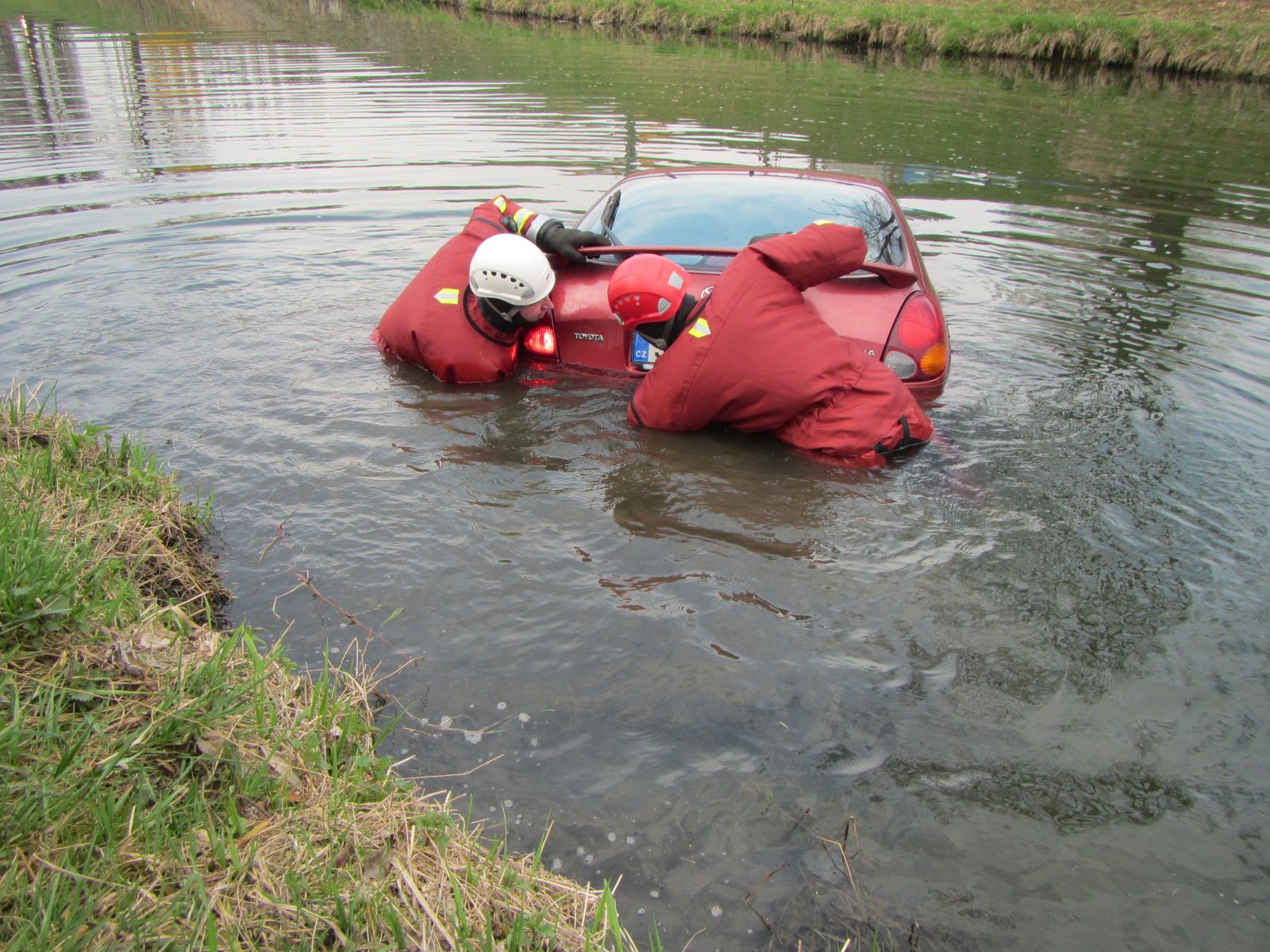 Ještě než na místo přijel vyprošťovací automobil profesionálních hasičů z Otrokovic, zkontrolovali na místě zasahující hasiči vybaveni tzv. suchými obleky zda nedochází k úniku provozních kapalin do řeky. Po příjezdu vyprošťovacího automobilu bylo z větší části ponořené vozidlo uchyceno lany a vytaženo z řeky.