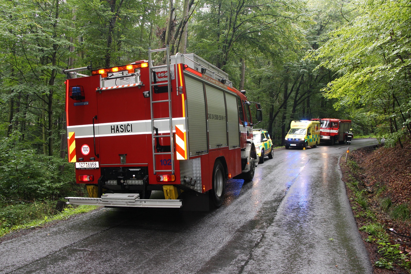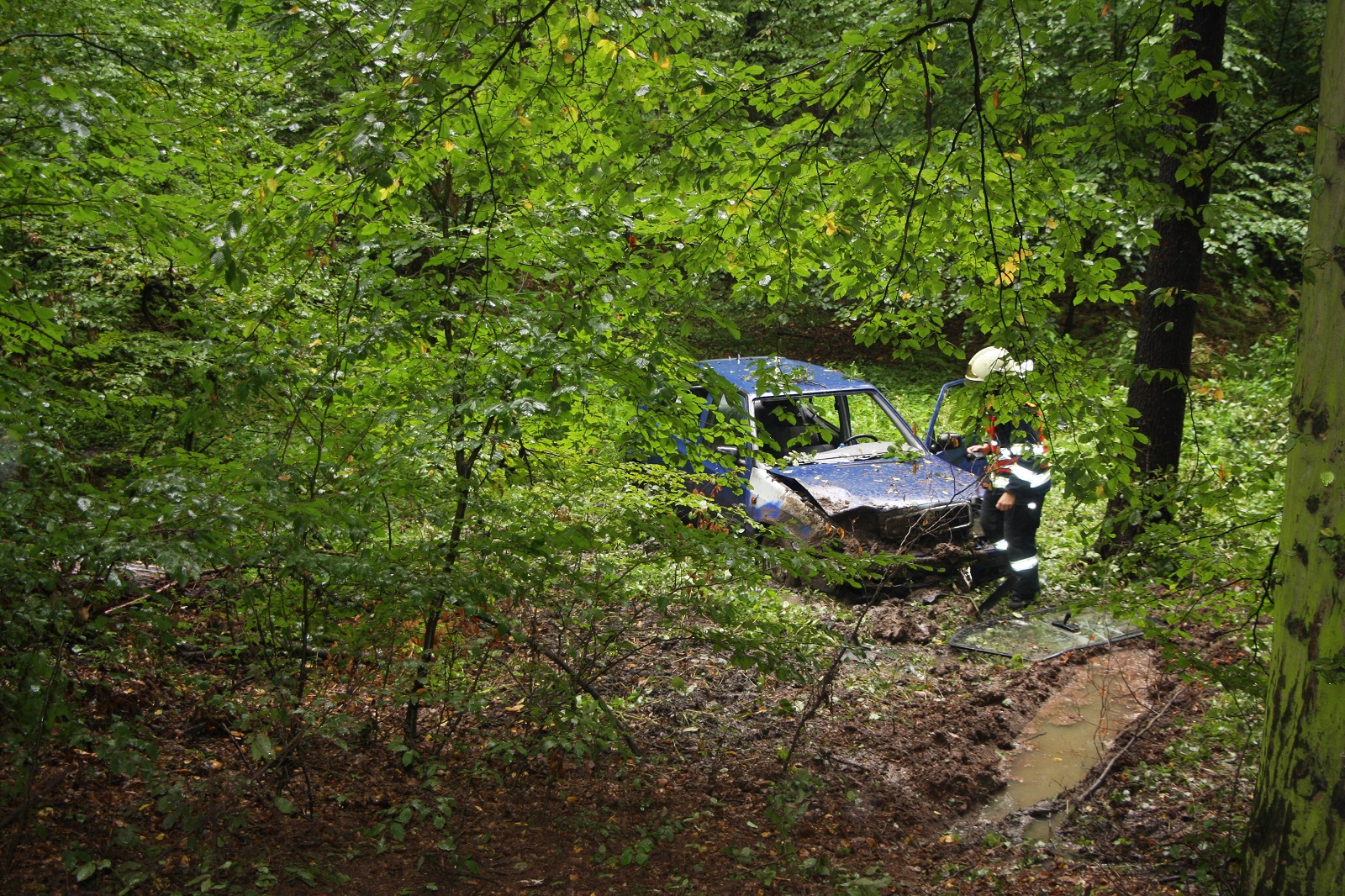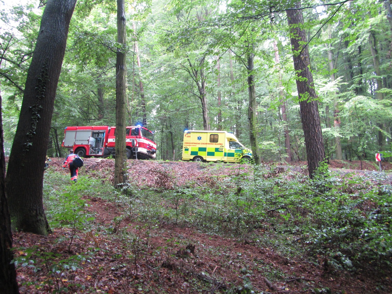 Vozidla hasičů a zdravotnické záchranné služby projely několikrát kolem místa nehody. Vozidlo Škoda Felicia totiž nenechalo na silnici, ani na stromech, žádné stopy po vyjetí. V šeru a za deště bylo dobře zamaskováno v lesním porostu mezi stromy. Havarovaný vůz byl proto objeven se zpožděním. Uvnitř auta byla zraněná řidička, která byla vyproštěna na páteřní desce bez použití hydraulického vyprošťovacího zařízení. Hasiči následně zraněnou osobu vynesli v rozbahněném terénu do sanitky, která ji později odvezla do nemocnice k dalšímu vyšetření.