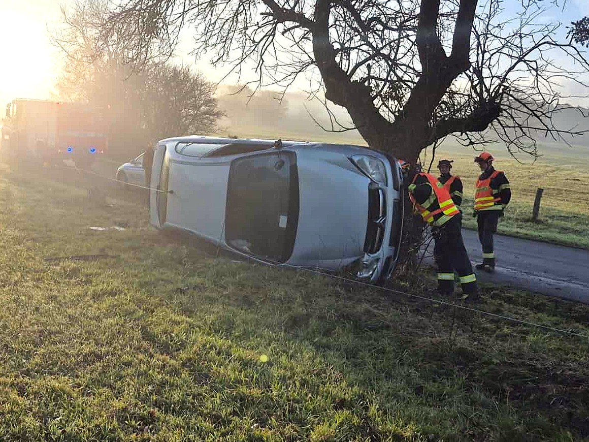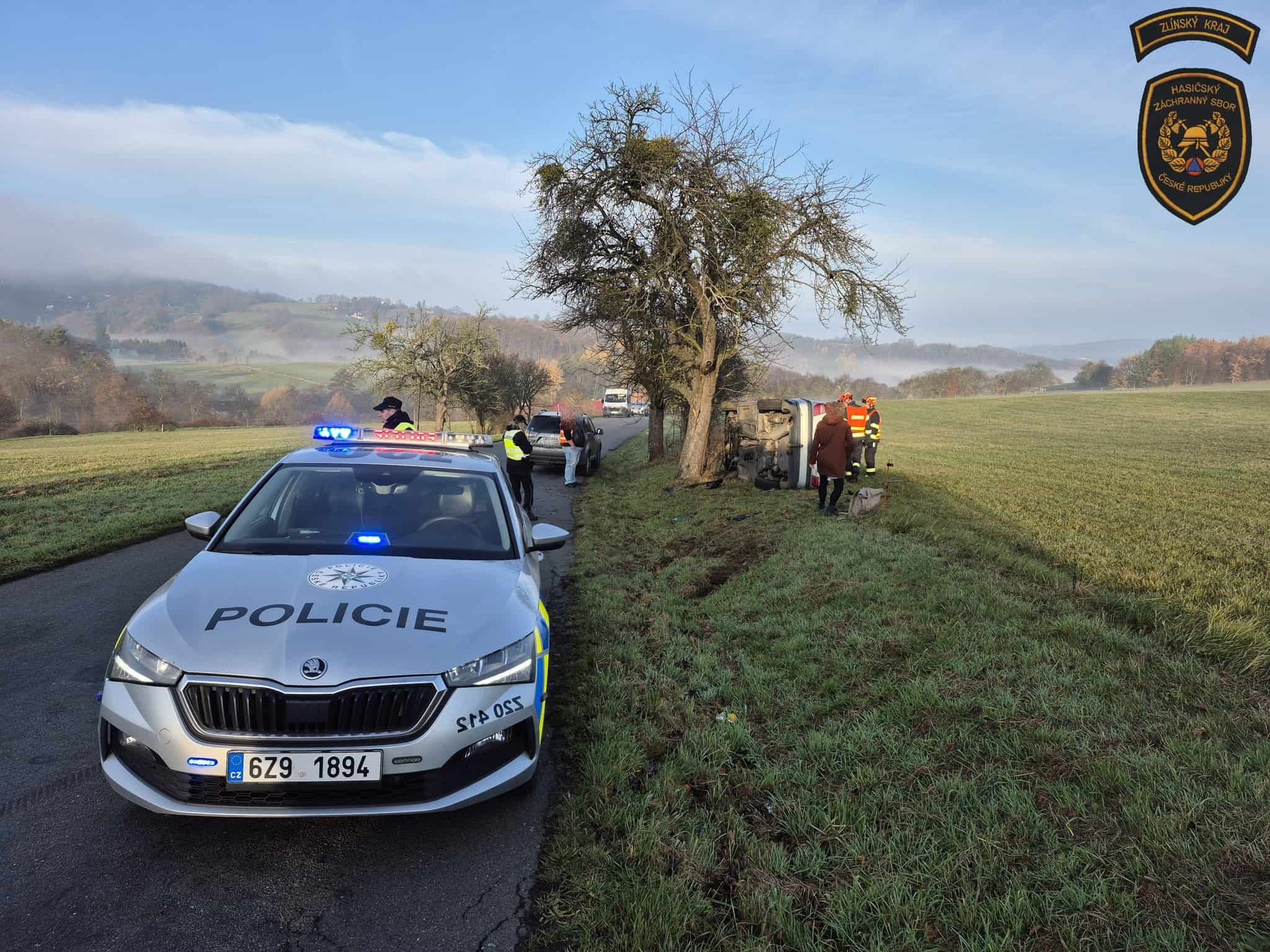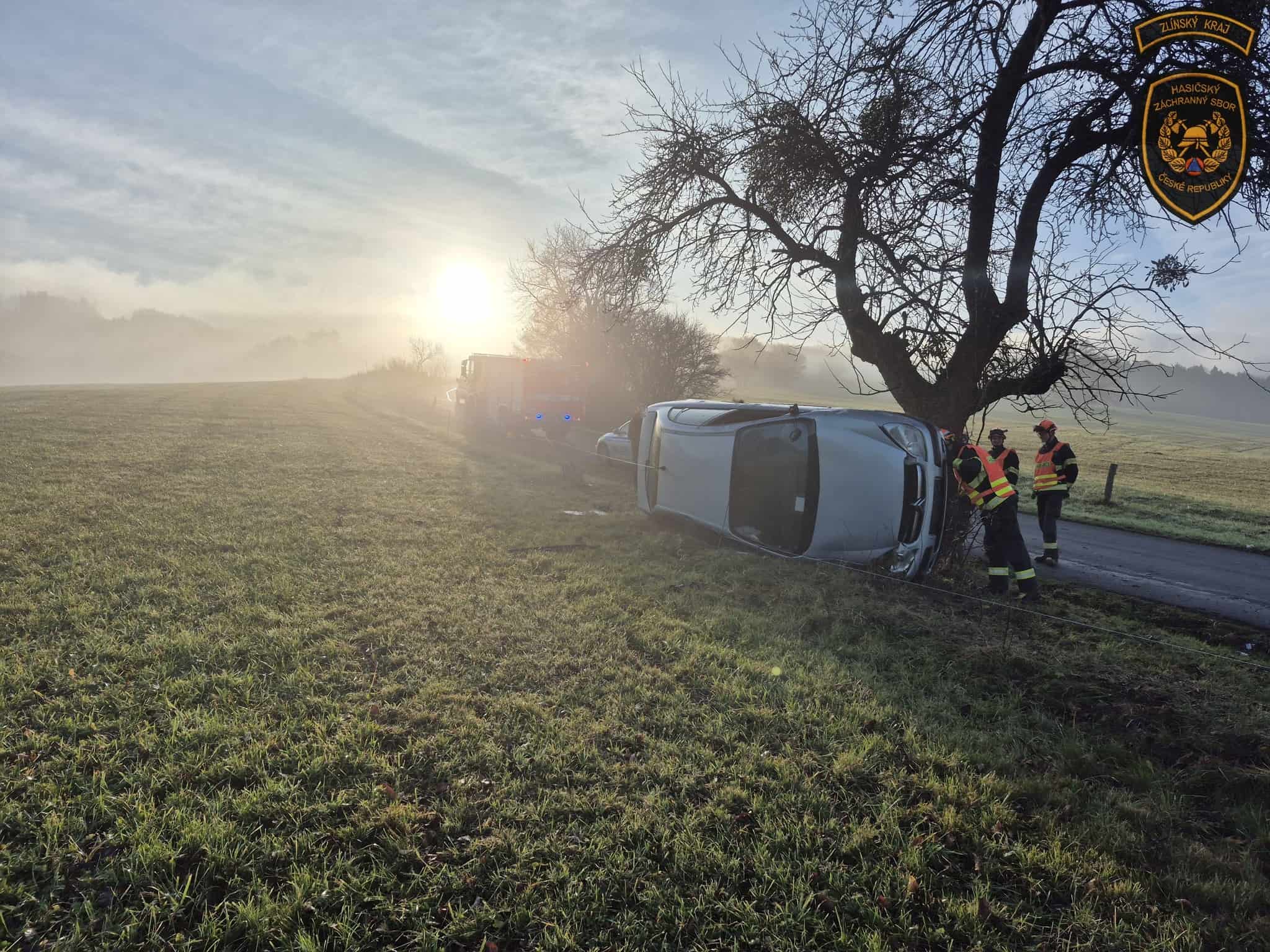 Dnes ráno došlo k nehodě osobního vozidla, které sjelo ze silnice a skončilo na boku na okraji pole. Řidička byla při vědomí a vyvázla bez zranění. Pomoc poskytli první svědci, včetně člena místní dobrovolné jednotky a zdravotní sestry, než dorazili profesionální hasiči a zajistili vozidlo a místo nehody.