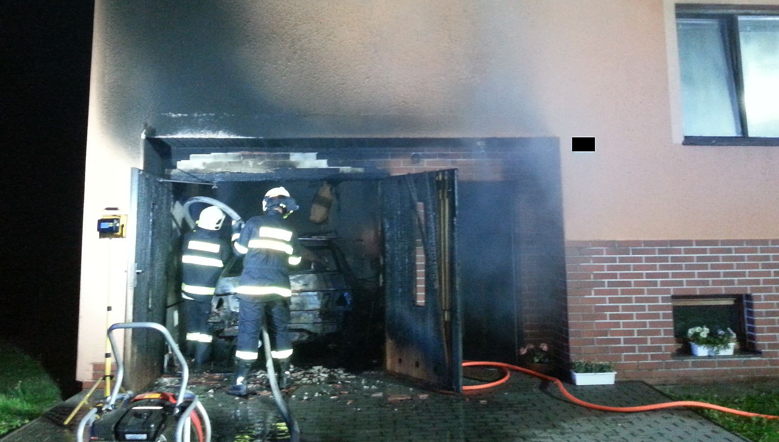Hasiči vybaveni dýchací technikou plameny, které zachvátili interiér garáže i v ní zaparkované osobní vozidlo, rychle srazili. Po vniknutí do interiéru postupně dohasili jednotlivá ložiska hoření a celý prostor ochladili. Vzhledem k silnému zakouření museli vnitřní prostory garáže i domu odvětrat přetlakovou ventilací.