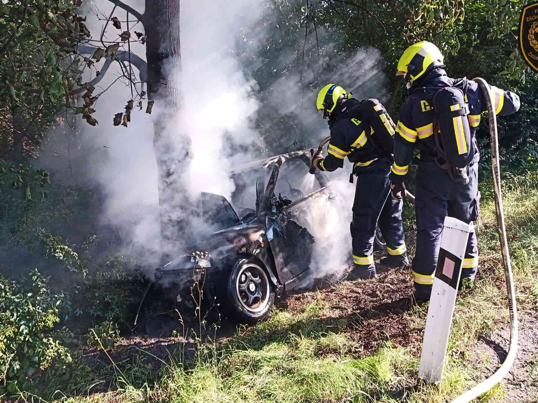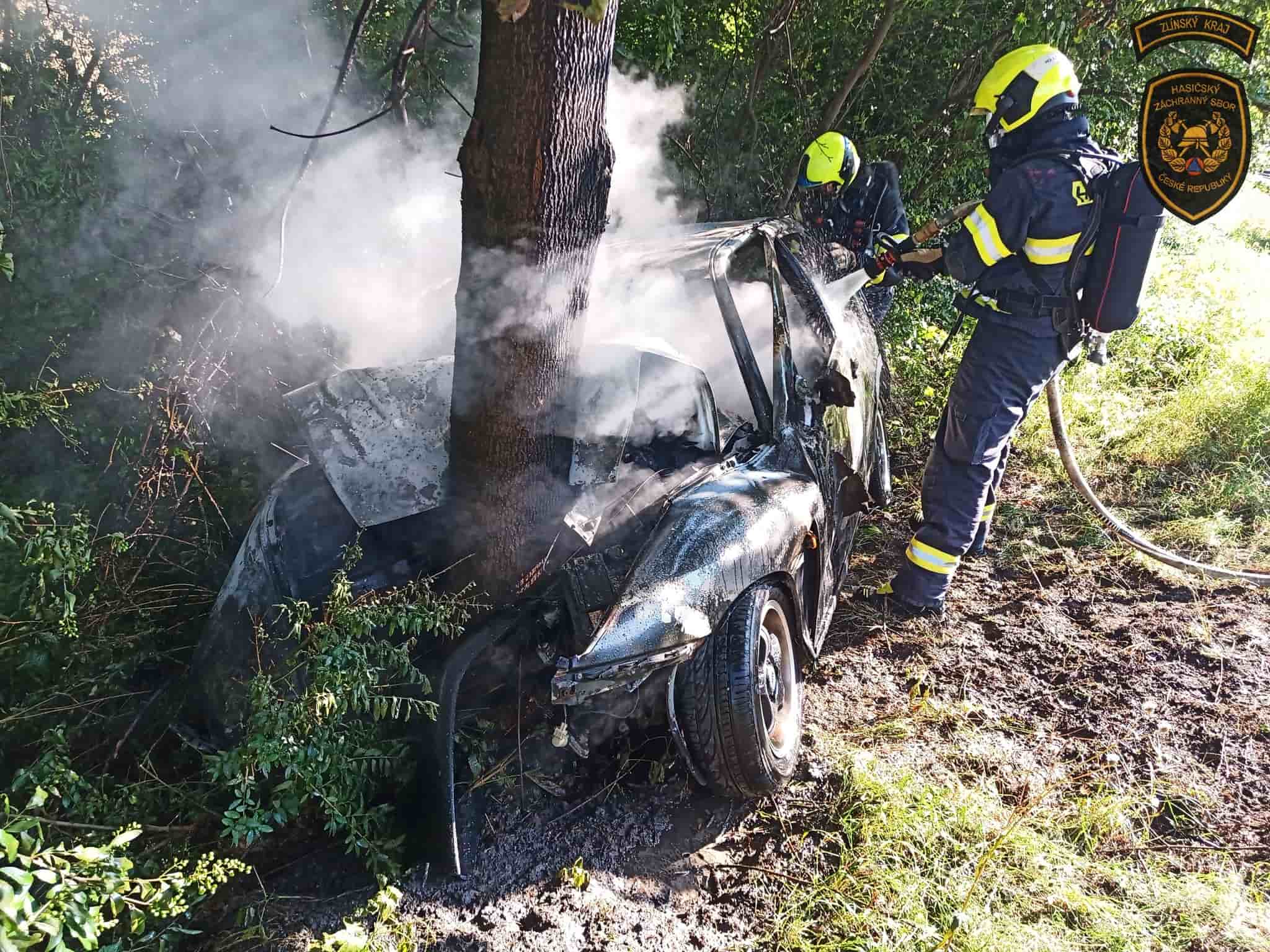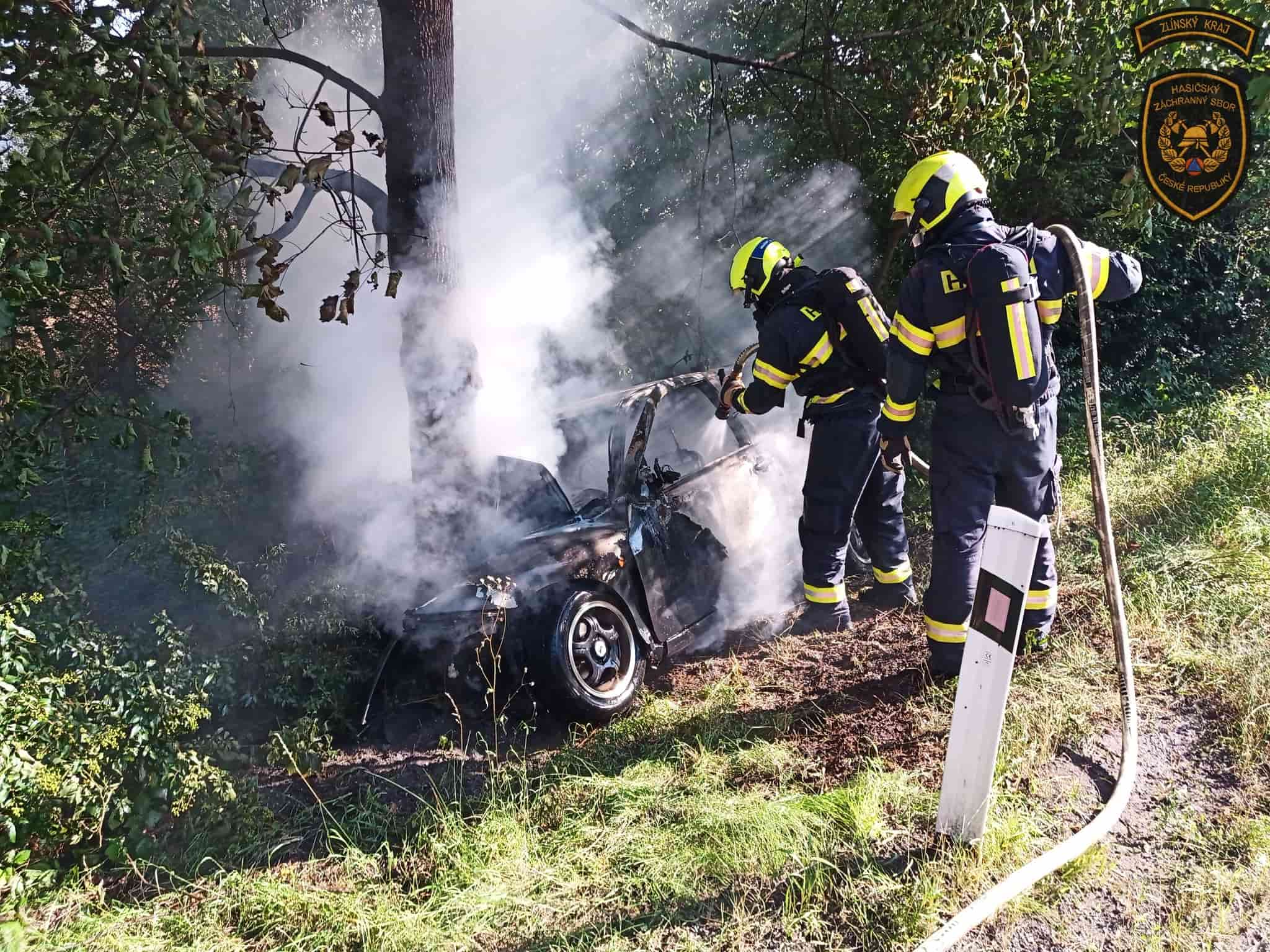 Silnice u Jankovic na Kroměřížsku se včera odpoledne stala dějištěm dramatické nehody. Osobní vůz sjel mimo vozovku a čelně narazil do vzrostlého stromu. Prakticky okamžitě poté začal automobil hořet.