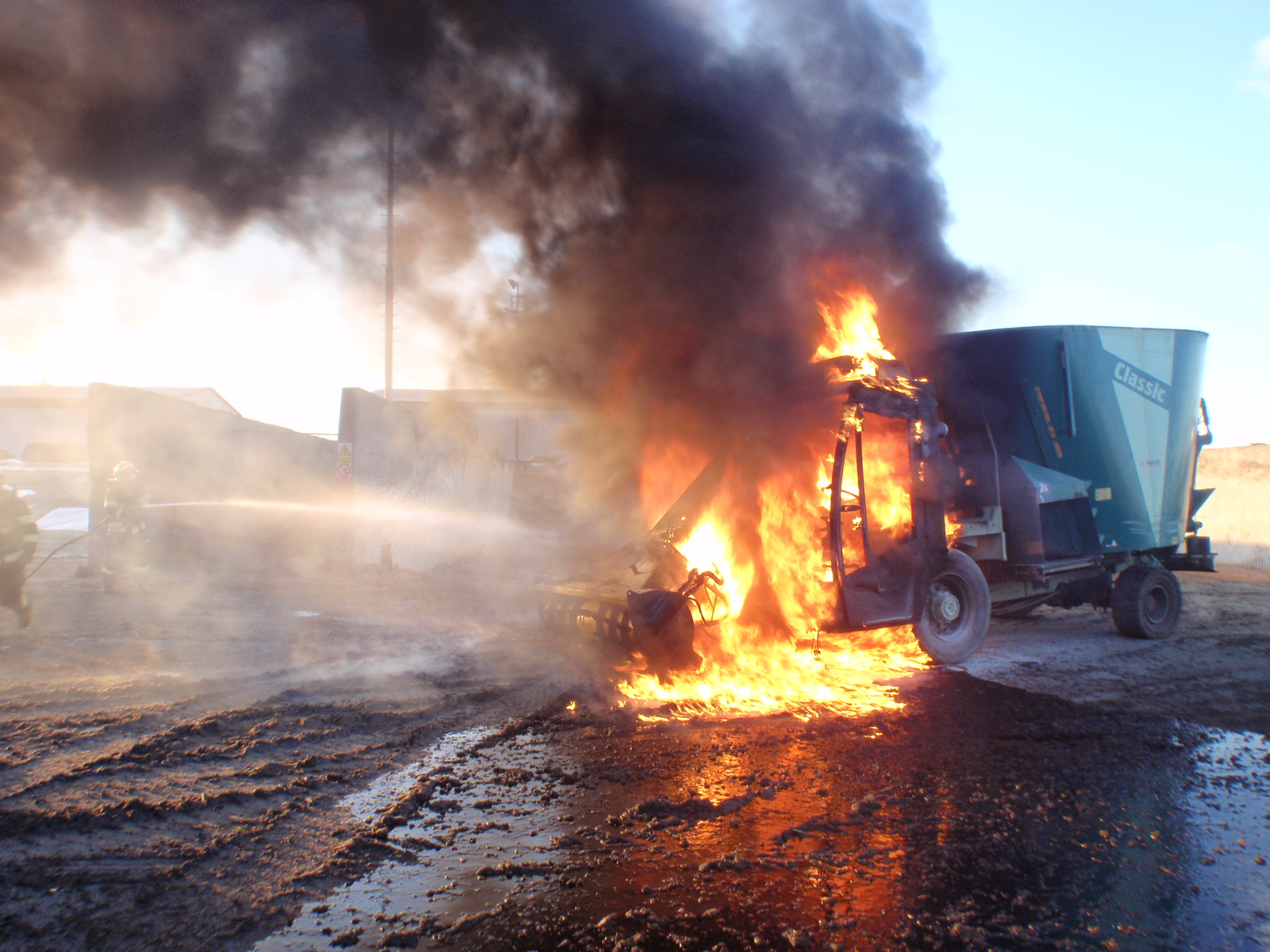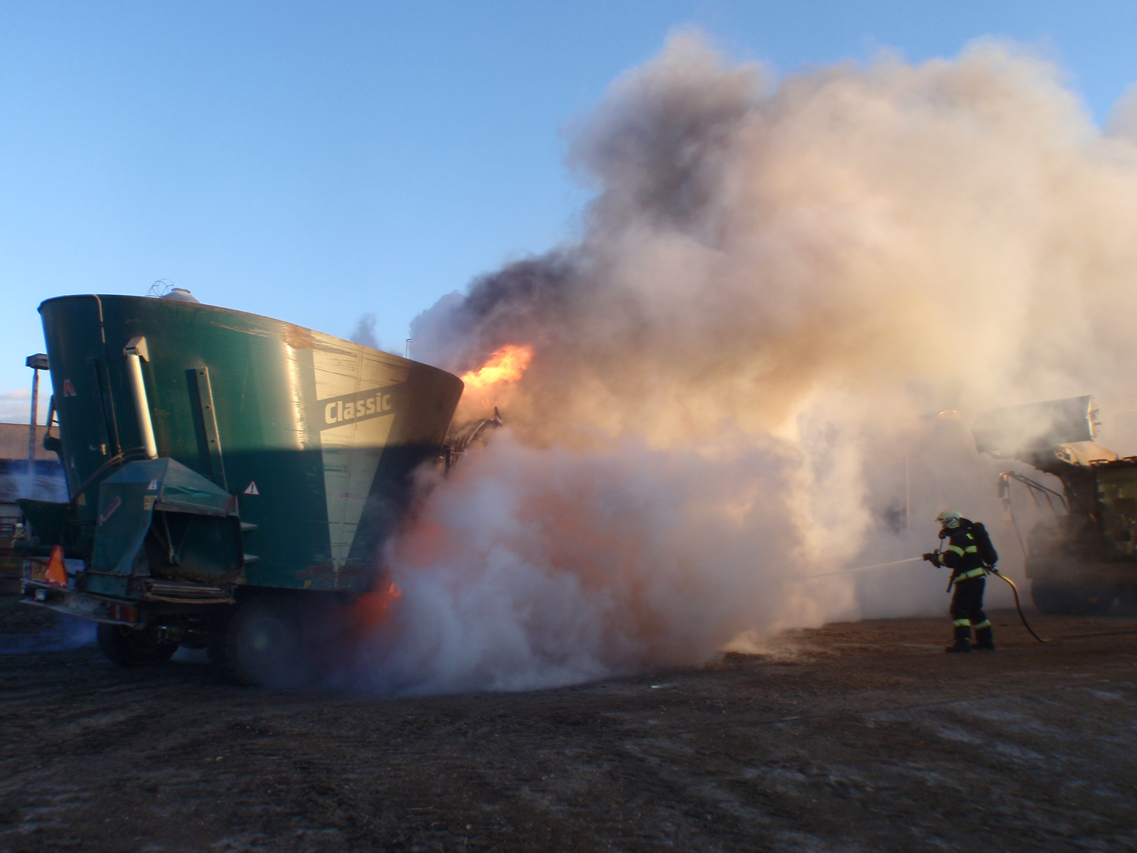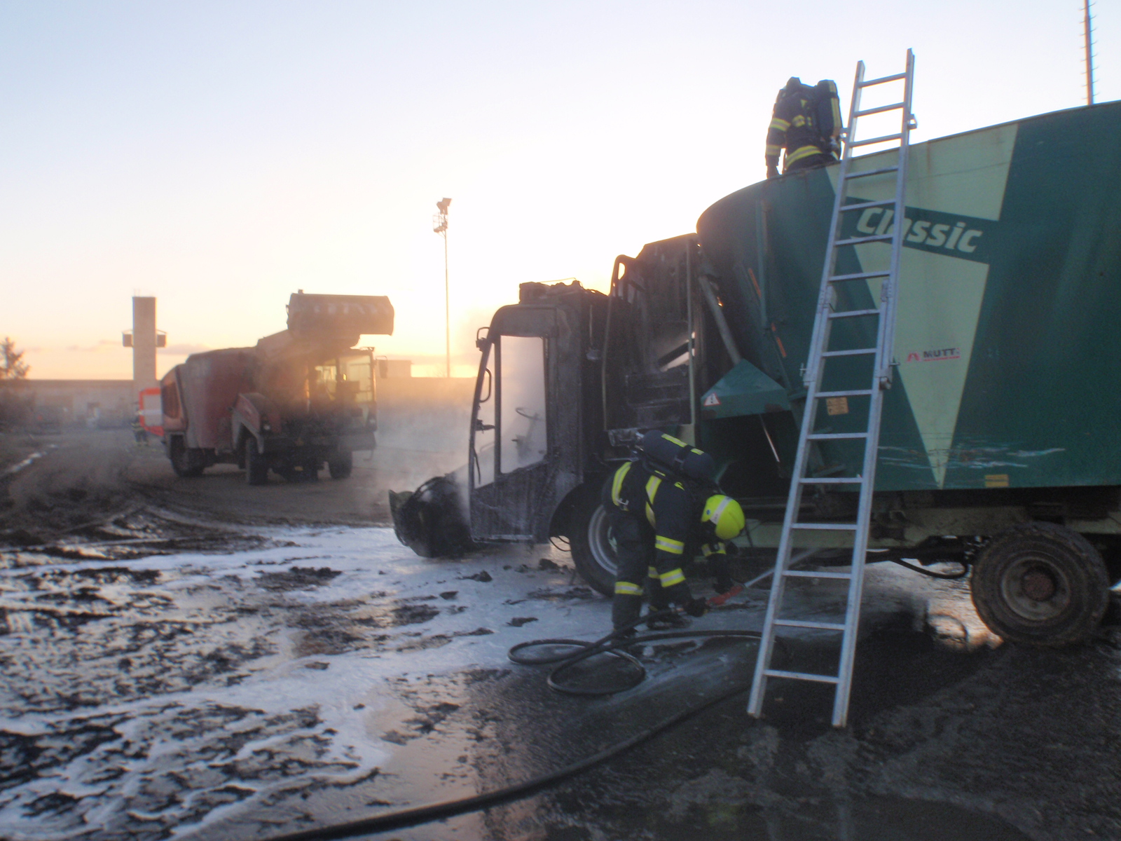 Už při příjezdu k místu události viděli hasiči hustý dým, jdoucí z vozidla. Po příjezdu na místo průzkumem zjistili, že se jedná o plně naložený krmící vůz, patřící místnímu zemědělskému podniku. Přední část vozu již byla plně zasažena plameny. Hasiči k uhašení požáru použili dva vysokotlaké proudy a během pár minut měli požár pod kontrolou. Před pátou hodinou velitel zásahu vyhlásil lokalizaci požáru. Nadále probíhaly dohašovací práce a vozidlo průběžně kontrolovali termokamerou, neboť byla obava, že se požár rozšíří do vnitřních prostor vozu, kde se nacházelo krmivo pro dobytek. Z tohoto důvodu hasiči vodou ochlazovali celý vůz.