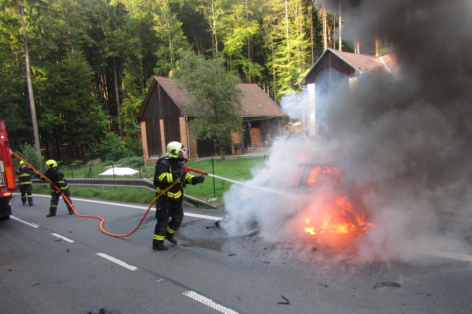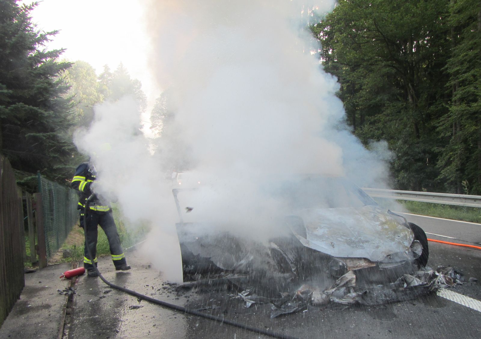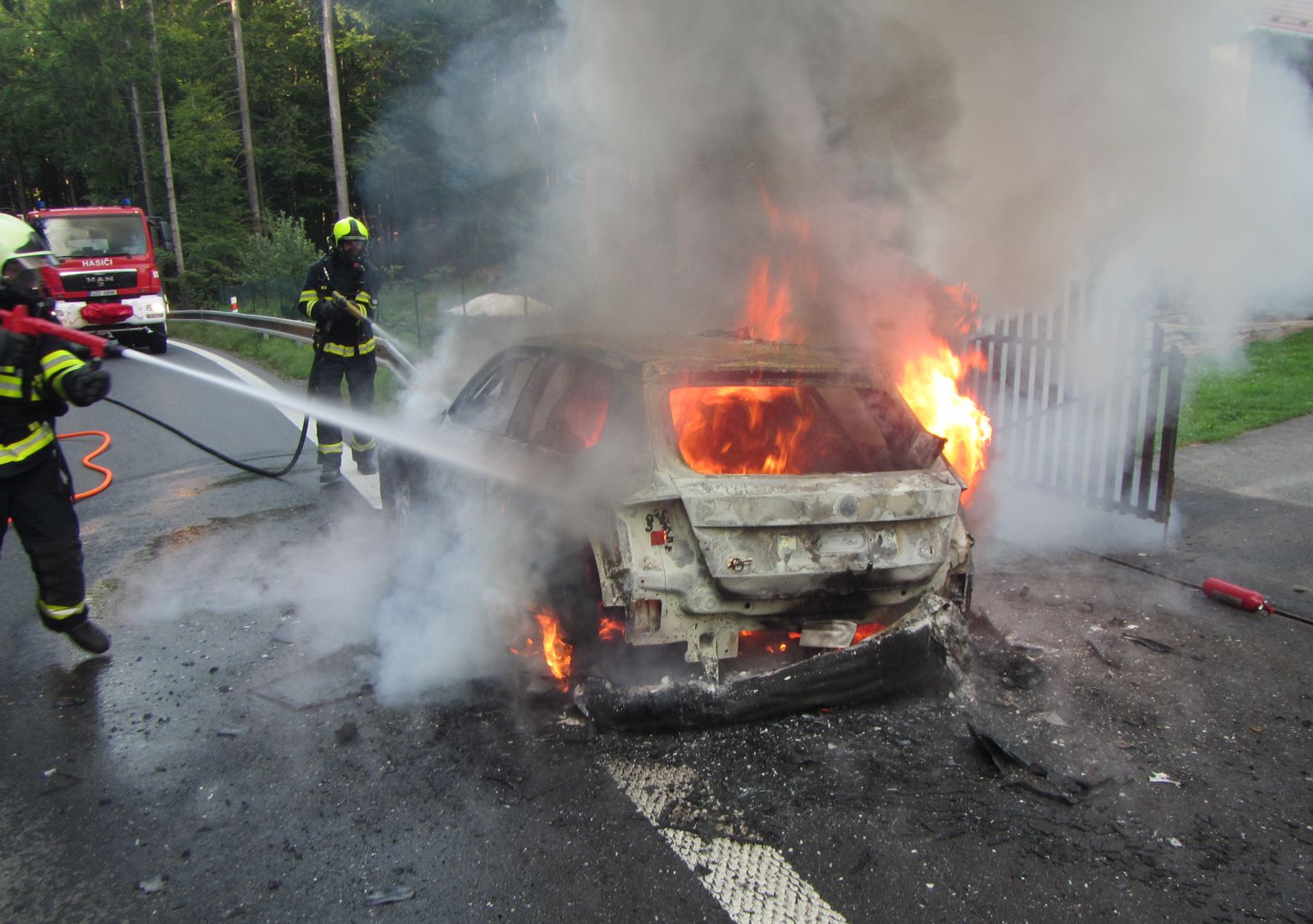 I přes zásah posádky automobilu hasicím přístrojem byl rozvoj požáru tak rychlý, že v době příjezdu hasičů bylo celé vozidlo v plamenech. Hasiči vybaveni dýchací technikou nasadili k jejich sražení dva vysokotlaké proudy. Po uhašení požáru celé torzo vozidla ještě ochladili.