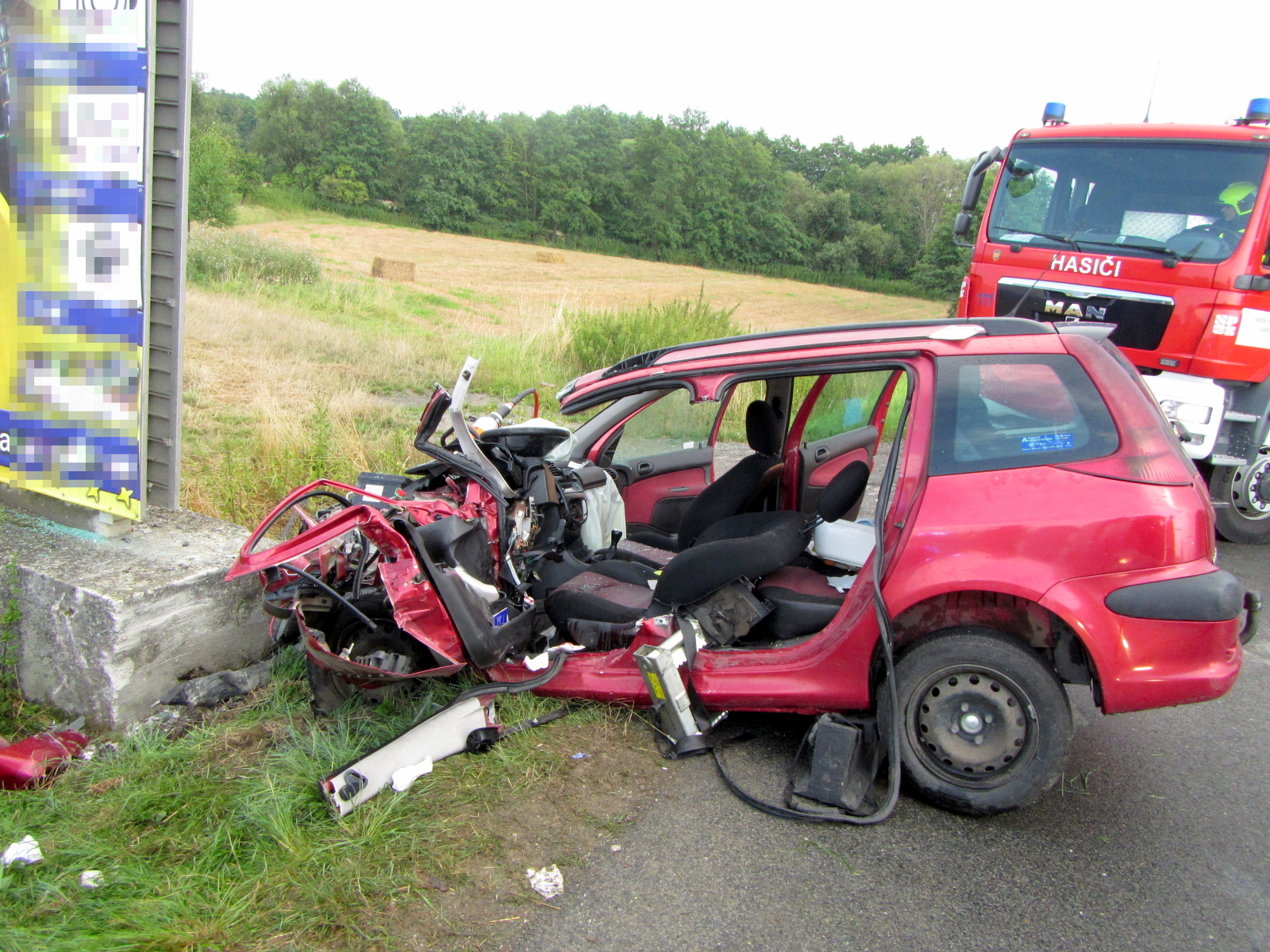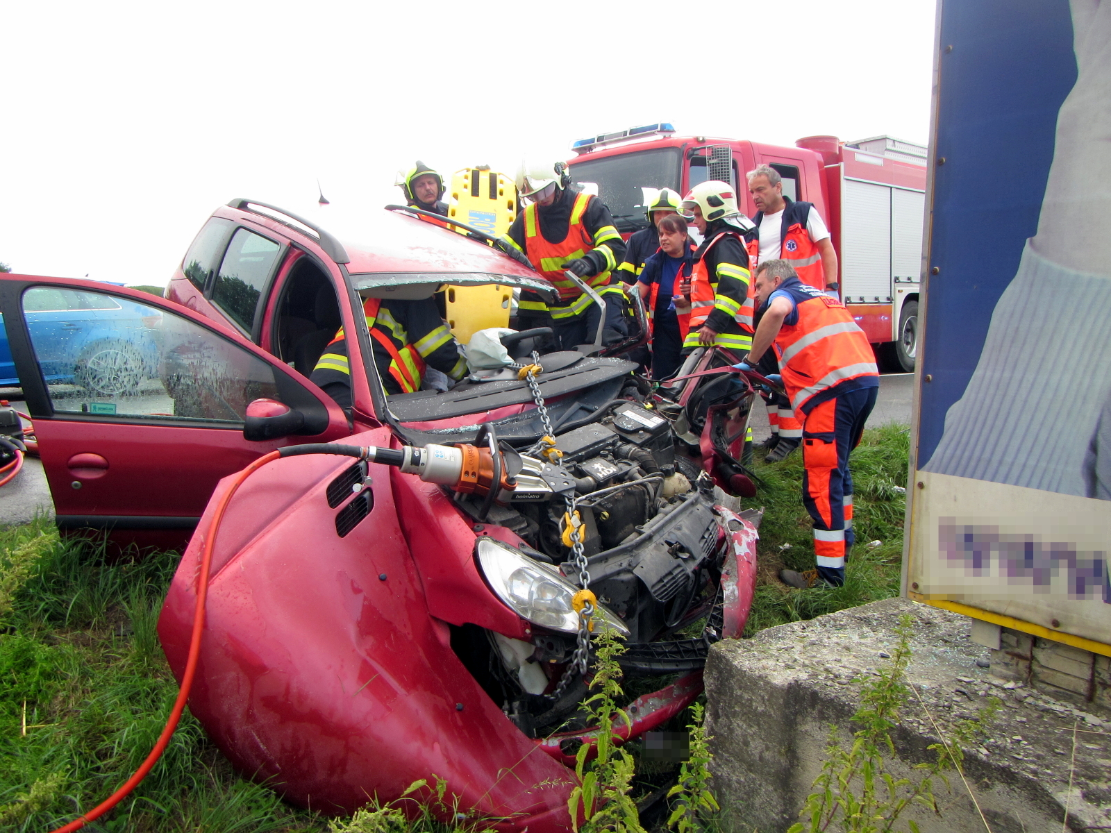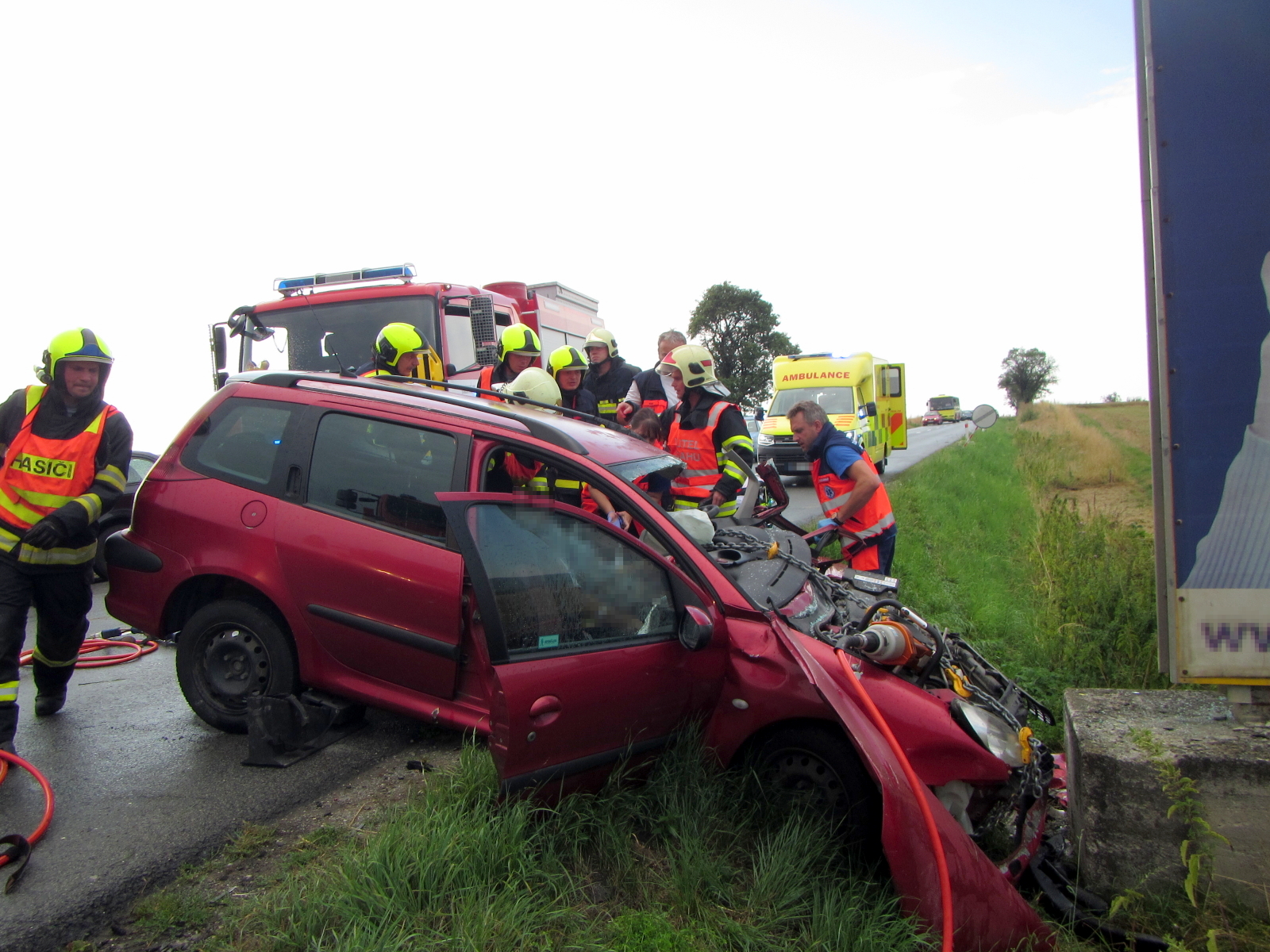 Na místo byly ihned vyslány jednotky profesionálních hasičů ze stanic Holešov a Zlín. Po příjezdu a provedení prvotního průzkumu upřesnil velitel zásahu, že se jedná o havárii osobního vozu Peugeot, který narazil do betonové patky u komunikace. Řidič byl ve vraku zaklíněn a jednotka ve spolupráci se záchranáři okamžitě zahájila jeho vyproštění. Po příjezdu jednotky ze Zlína byla použita i druhá sada hydraulického vyprošťovacího zařízení.