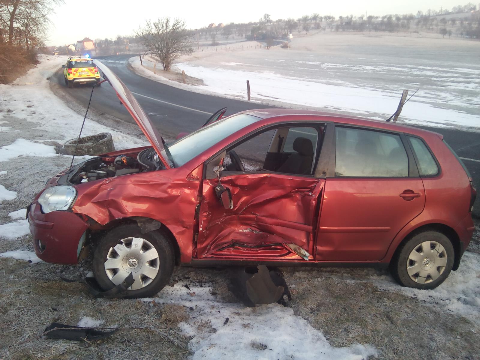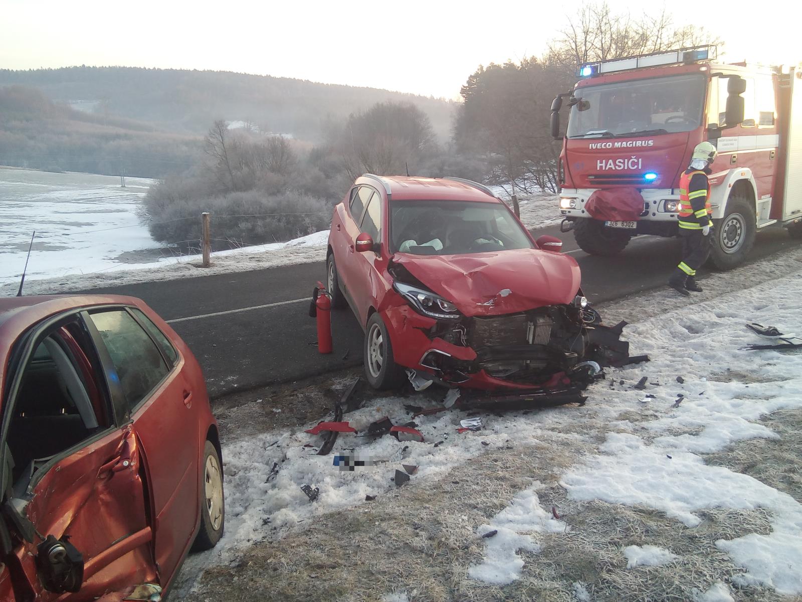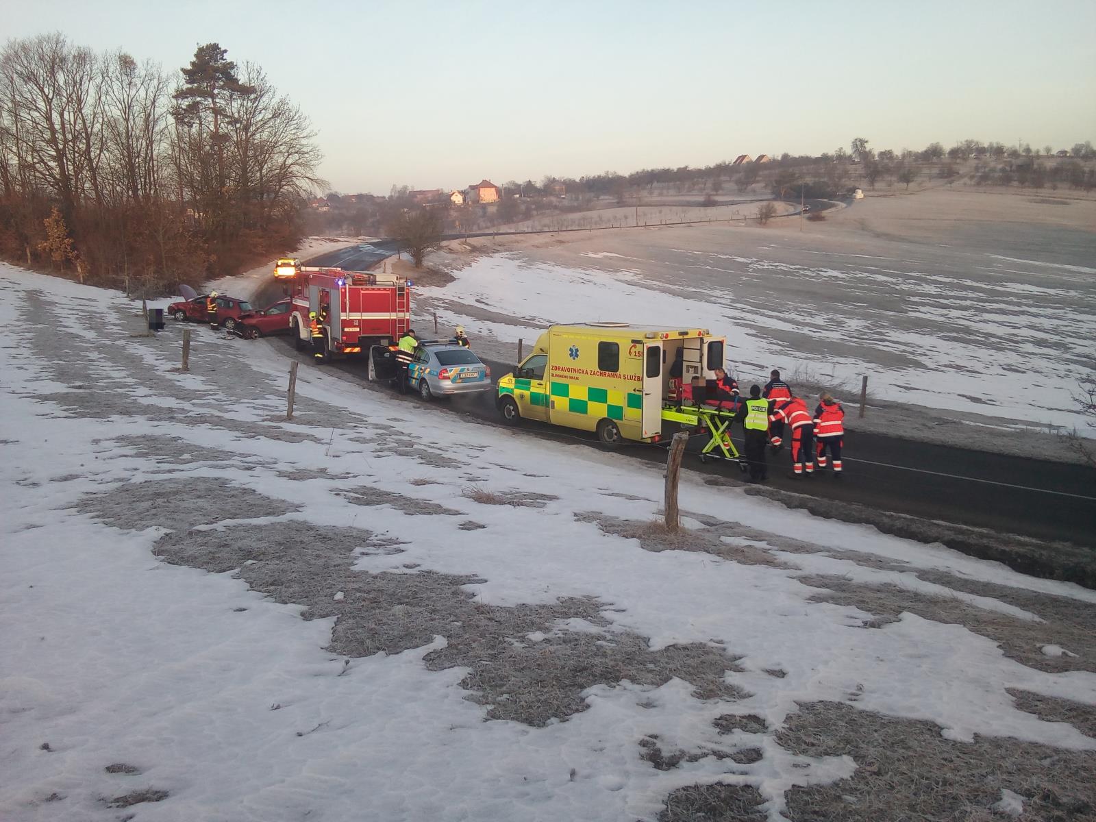 Po příjezdu na místo nehody hasiči průzkumem zjistili, že řidič osobního vozidla v kopci při projíždění zatáčky vjel na zledovatělý úsek komunikace, dostal smyk a vjel do protisměru, kde se střetl s druhým osobním vozidlem. Zraněný řidič zůstal ve vozidle zaklíněný. Řidička druhého auta po příjezdu hasičů již byla mimo vozidlo.