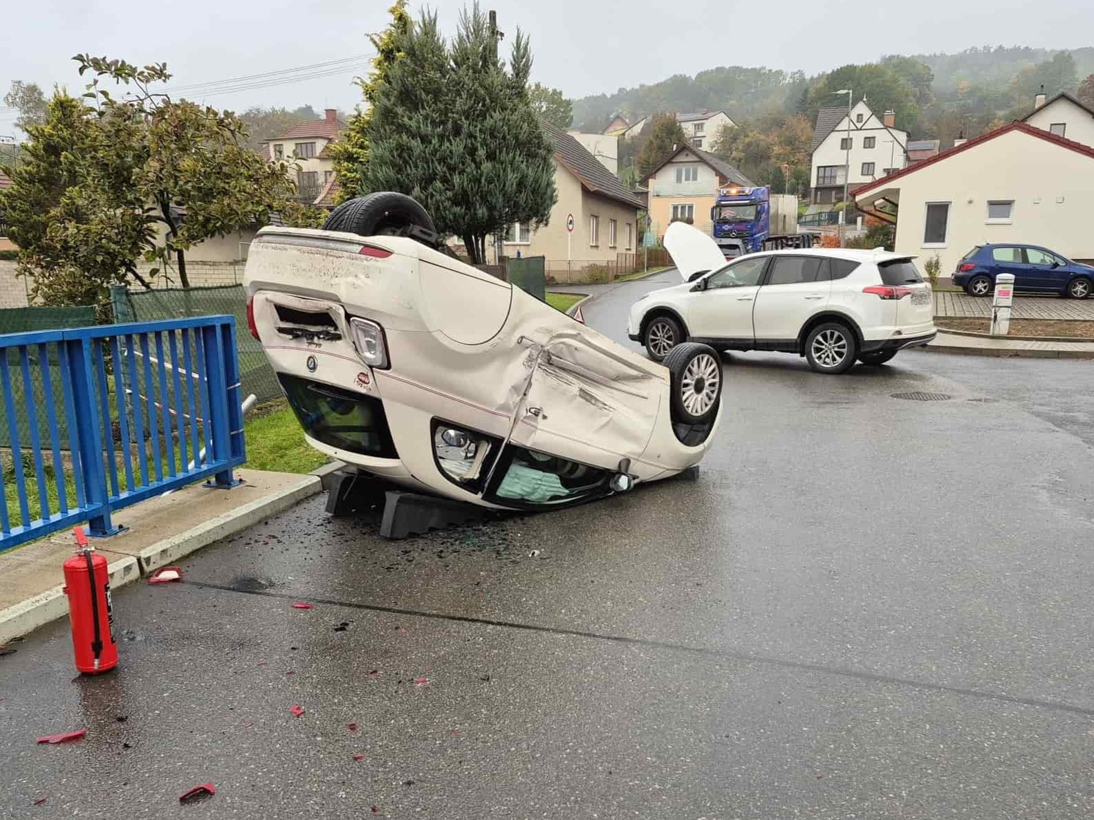 Řidička z převráceného vozu utrpěla zranění a skončila v péči posádky zdravotnické záchranné služby. Druhý řidič vyvázl bez zranění, hasiči mu však poskytli tepelný komfort ve svém zásahovém automobilu, než dorazila policie.