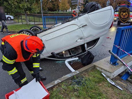 Po střetu skončilo auto převrácené na střechu, řidičku odvezli záchranáři