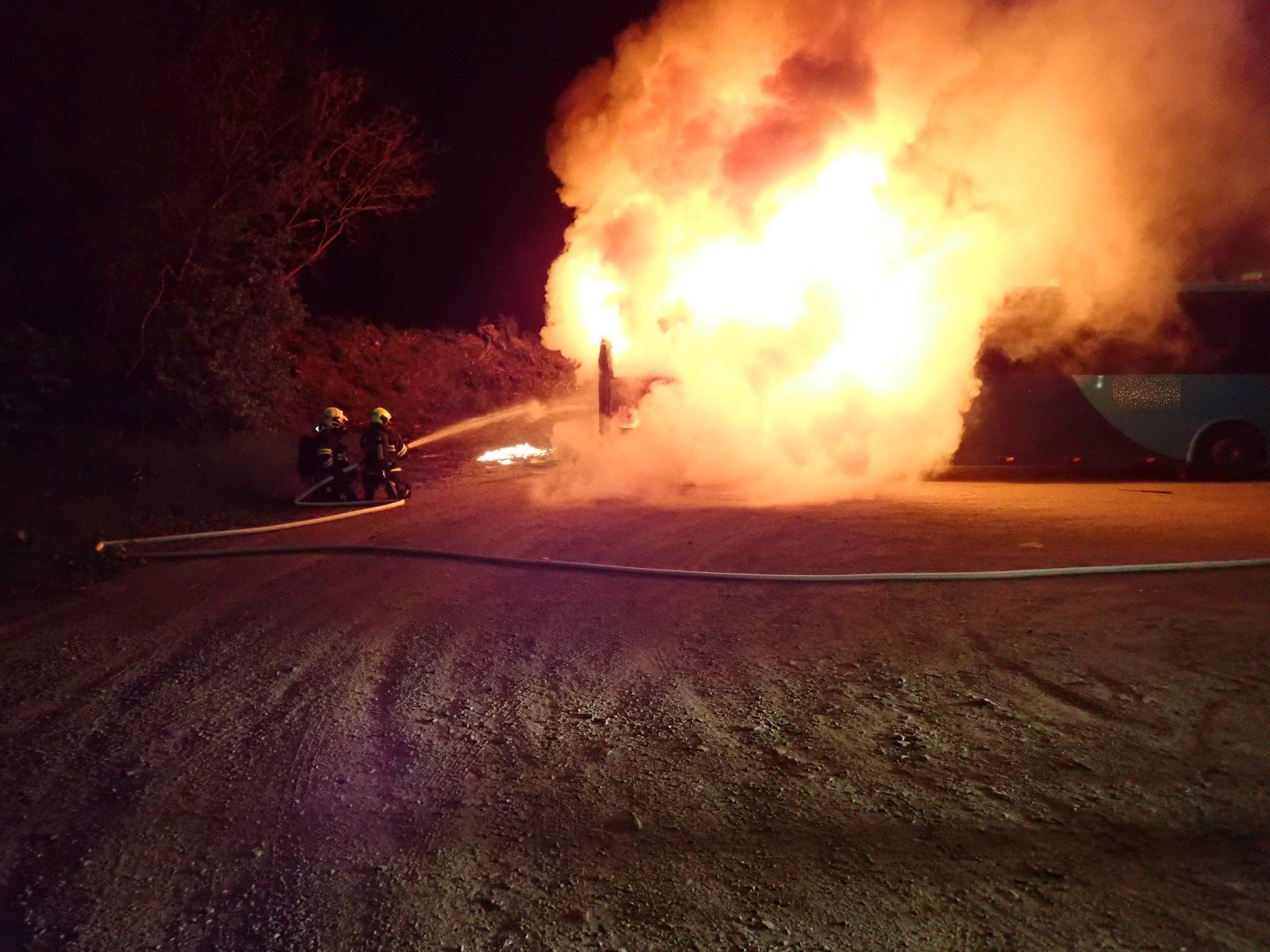 Při příjezdu k hořícímu autobusu byla motorová část v plamenech. Hasiči v dýchacích přístrojích požár uhasili dvěma vodními proudy.