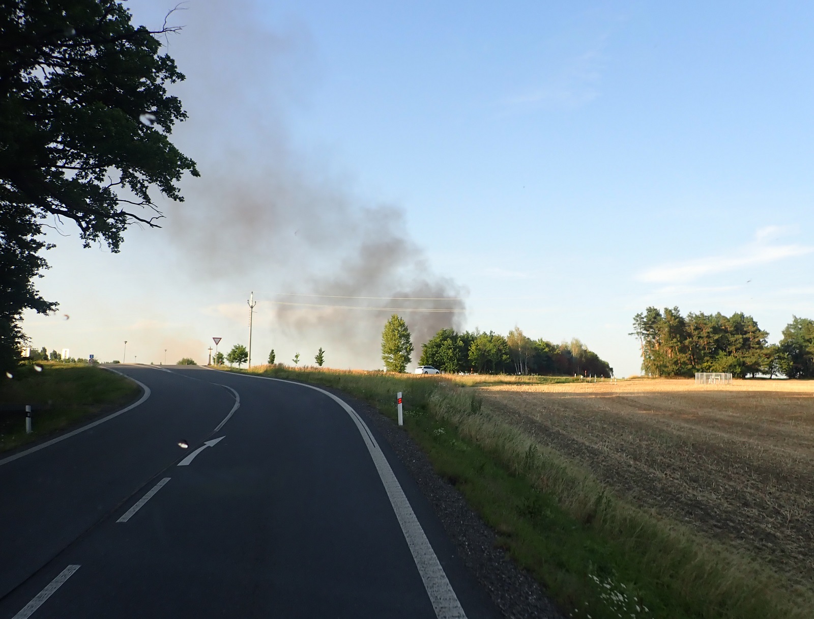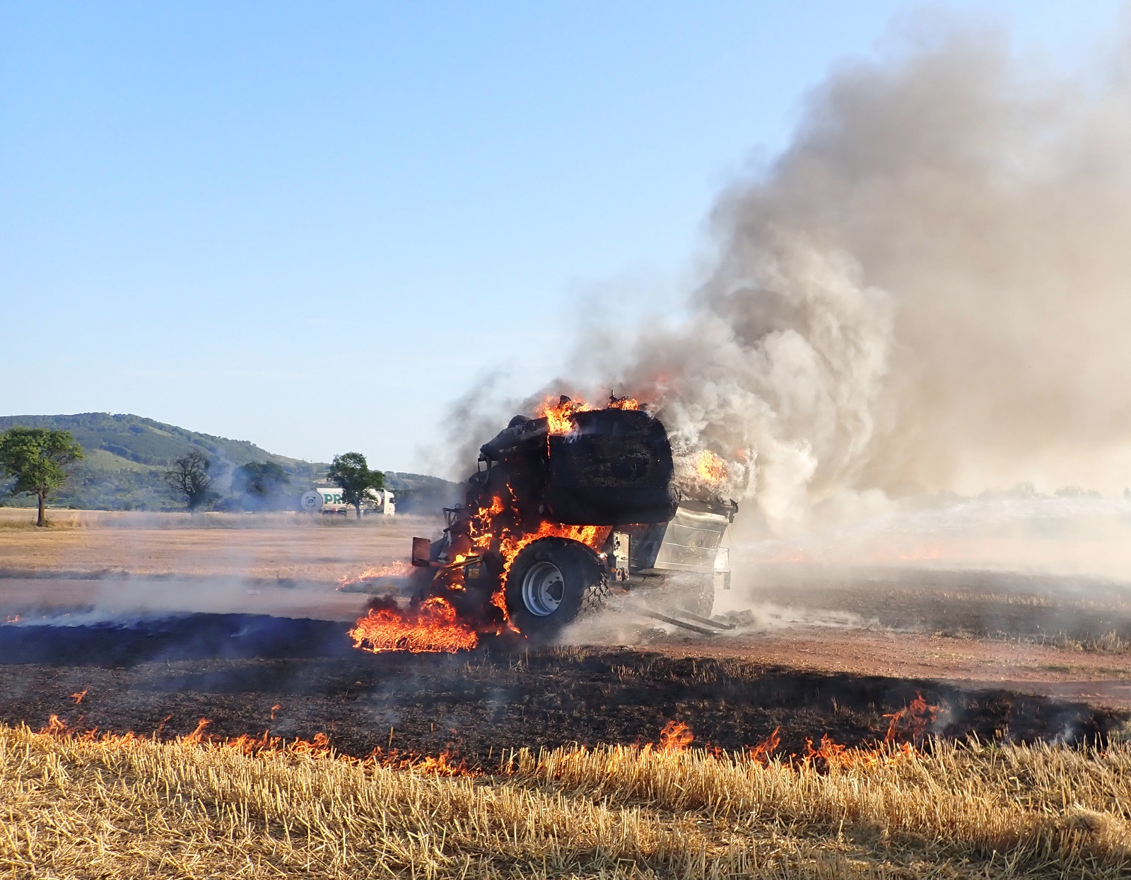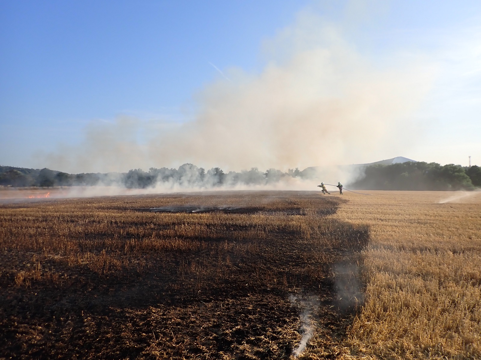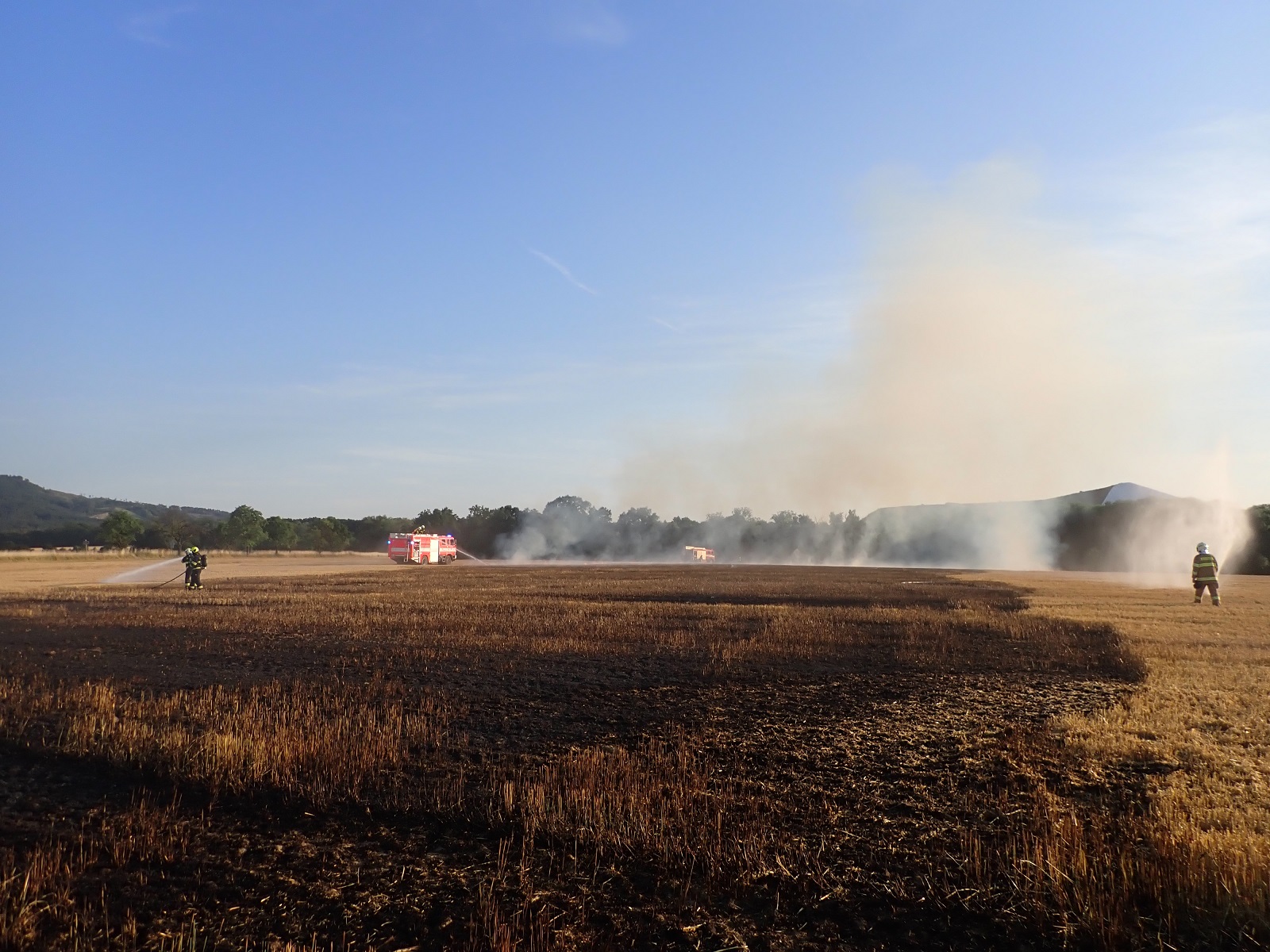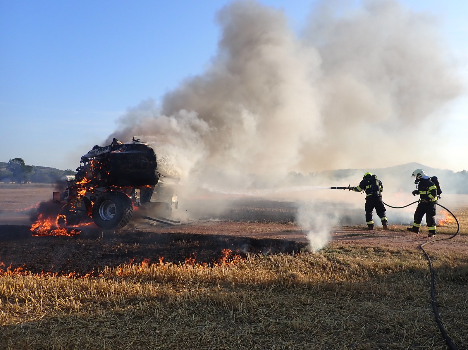 Před naším příjezdem se podařilo odpojit traktor od balíkovače. Kromě balíkovače shořelo strniště na třech místech. Jedna část měla velikost asi 30 x 30 metrů a další dvě části asi 60 x 60 metrů.