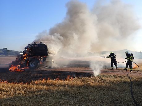 (20. 7. 2022) Škodu v předběžné výši 1,5 milionu korun způsobil požár balíkovače slámy a pole v Mrlínku v okresu Kroměříž.