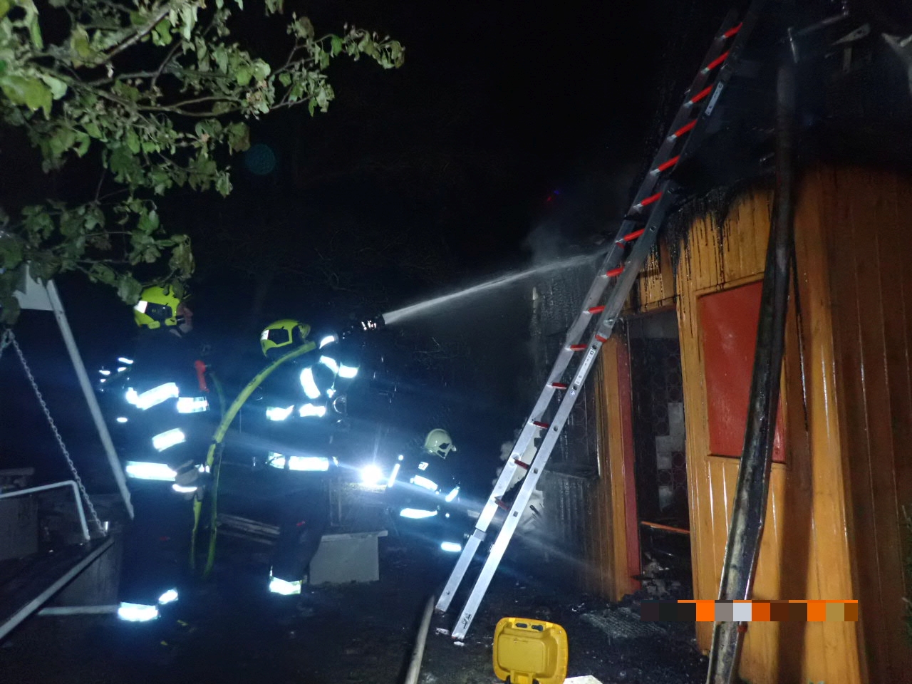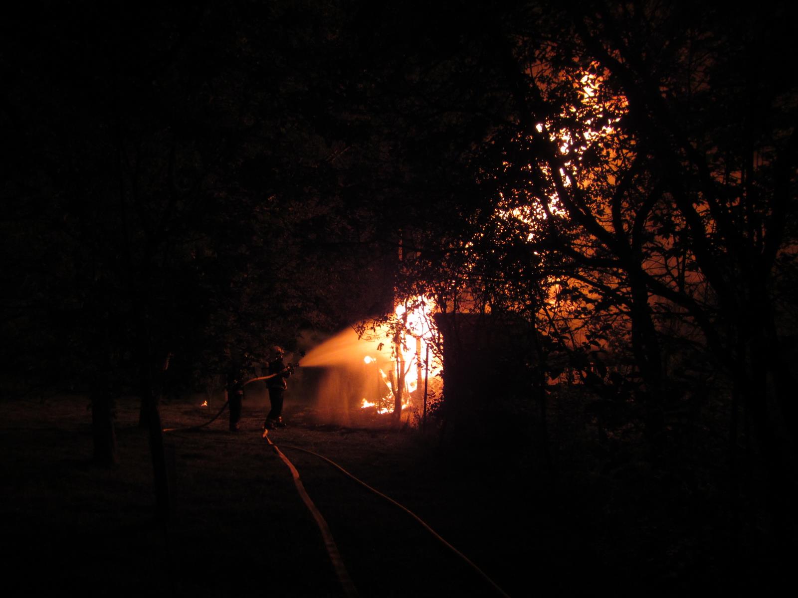 V době jejich příjezdu byla chatka celá v plamenech. Hasiči ihned zahájili hasební činnost a do dvaceti minut měli požár pod kontrolou. Poté rozebírali konstrukci zasažené části chatky a prolévali vodou skrytá ohniska. Na místo požáru se dostavil majitel objektu, který hasičům sdělil, že se uvnitř nachází jedna propanbutanová láhev. Hasiči ji vytáhli ven z chaty a chladili v kádi s vodou. Tři minuty před půlnocí velitel zásahu vyhlásil likvidaci požáru a jednotky se postupně začaly vracet na své základny. Na dohlídku na požářišti zůstali místní dobrovolní hasiči.