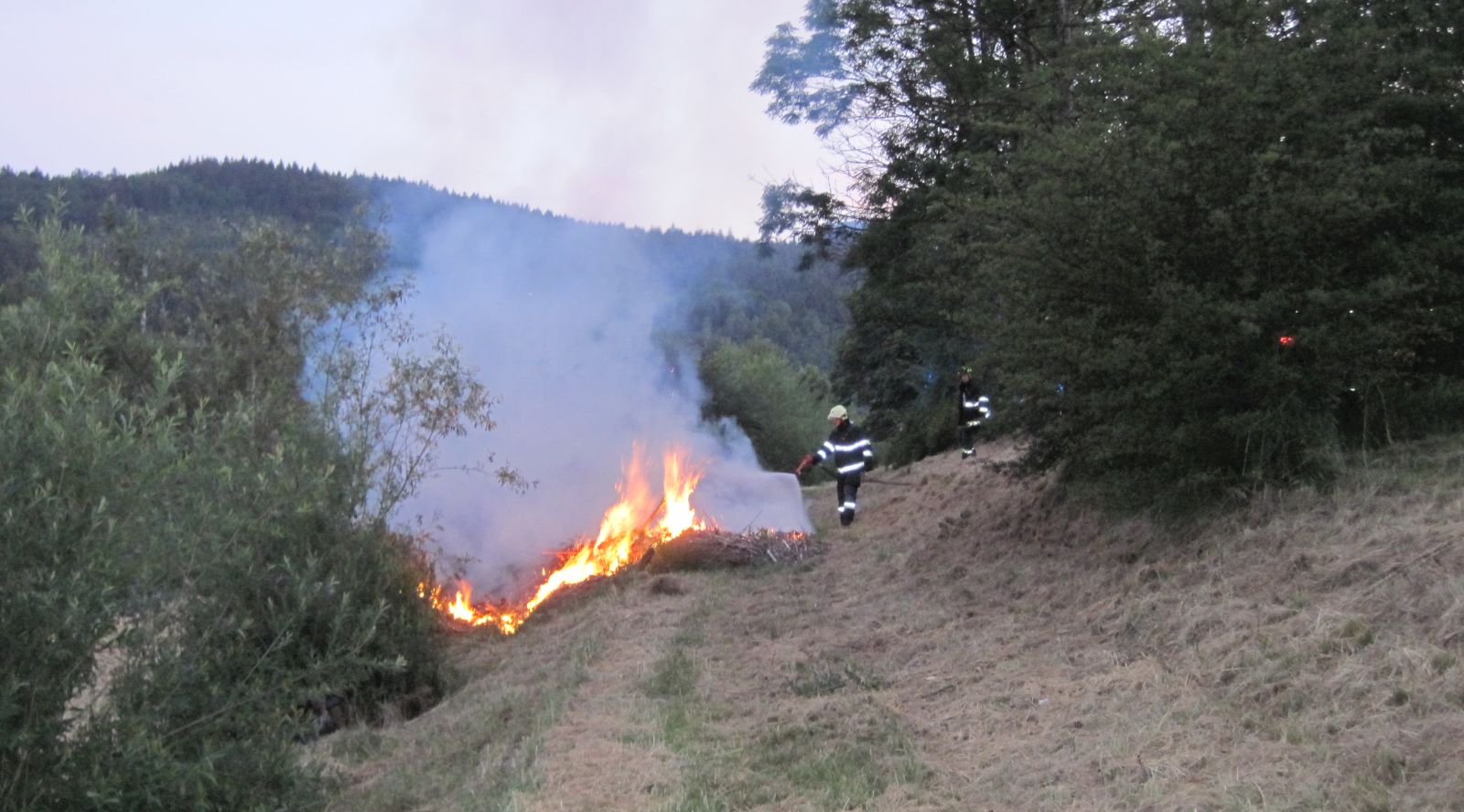 O požáru dřevního odpadu a trávy na břehu řeky Bečvy byli profesionální hasiči informováni v 04:19 hodin městskými strážníky. Na místo požáru vyslal operační důstojník krajských hasičů dvě cisterny. Po příjezdu jednotky bylo zjištěno, že hoří hromada dřevního odpadu na ploše asi 10 x 5 metrů. Pomocí vysokotlakého proudu a ženijního nářadí hasiči srazili plameny, hromadu prohrabali a celou plochu prolili větším množstvím vody.
