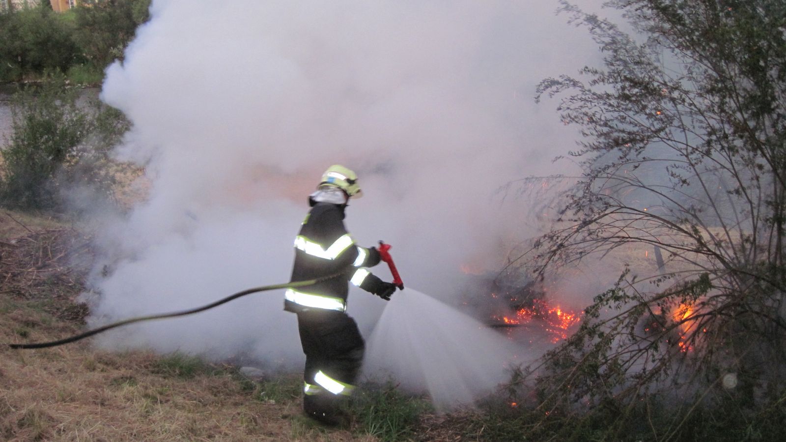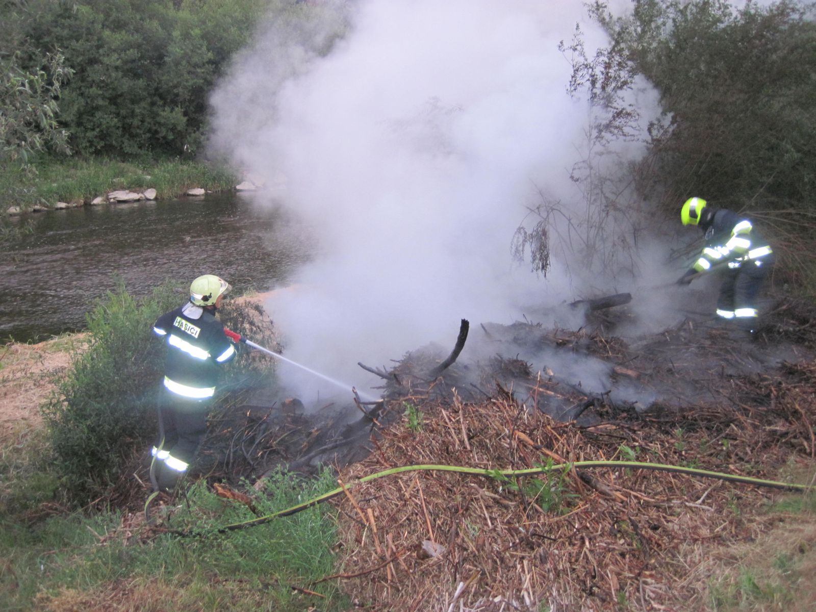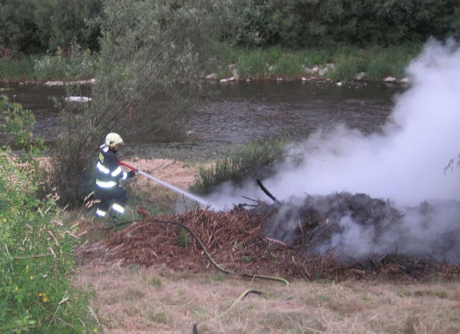 V neděli, 25.6.2017, ranní zásah vsetínských profesionálních hasičů na ulici Lázky. O požáru dřevního odpadu a trávy na břehu...