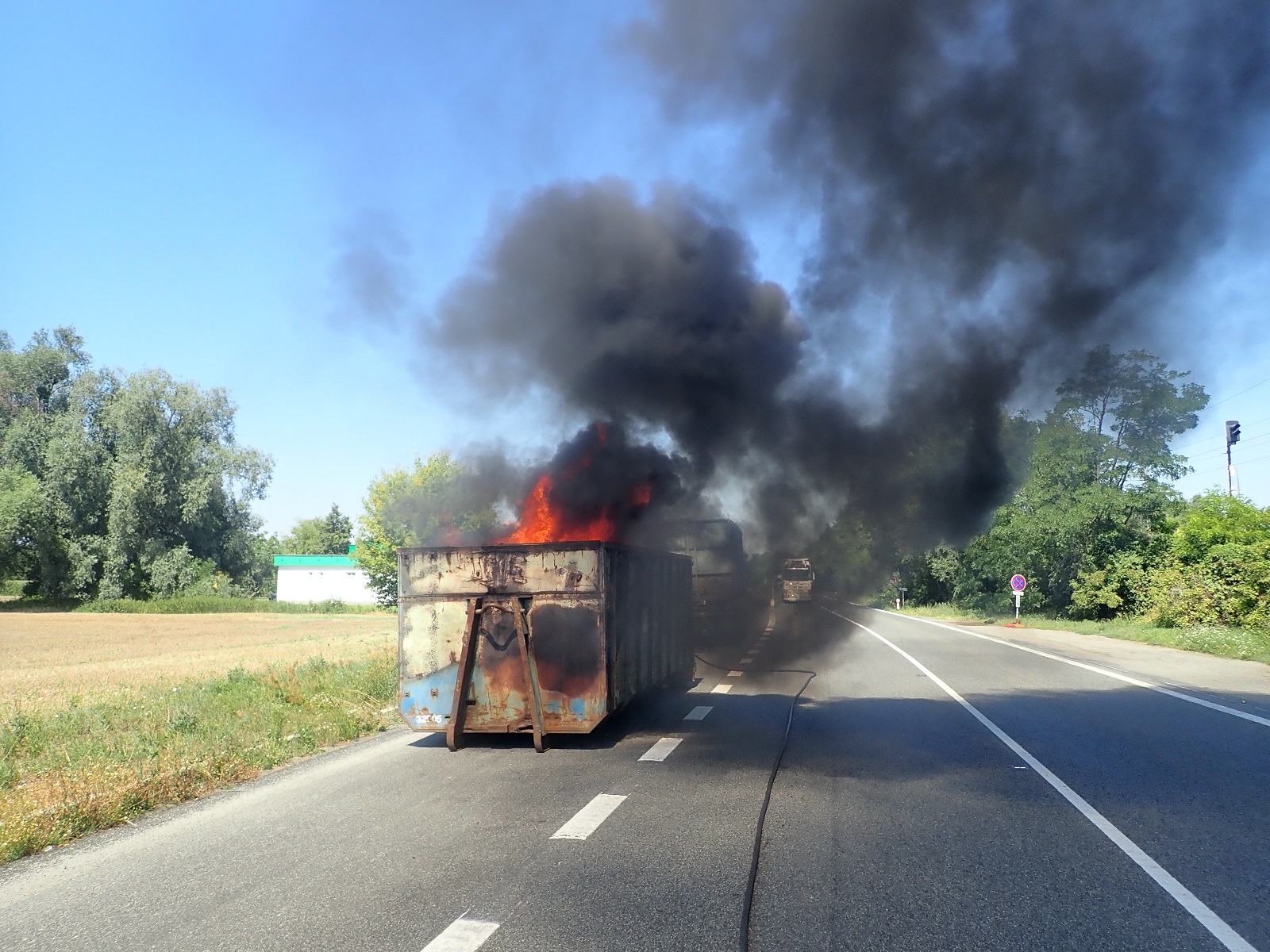 (3. 8. 2022) Na silnici I/55 před obcí Tlumačov došlo ve středu před polednem k požáru kontejneru s odpadem.
