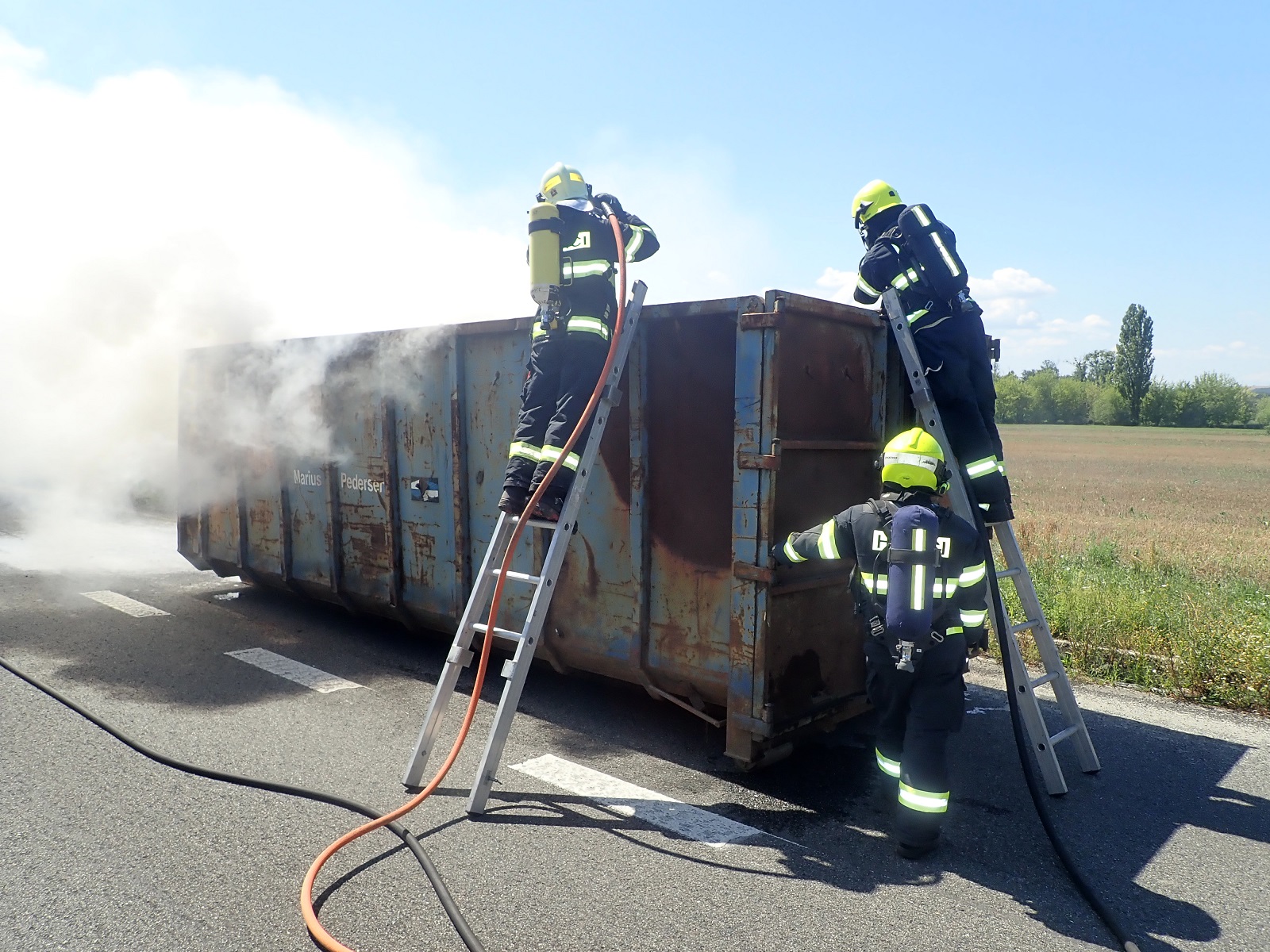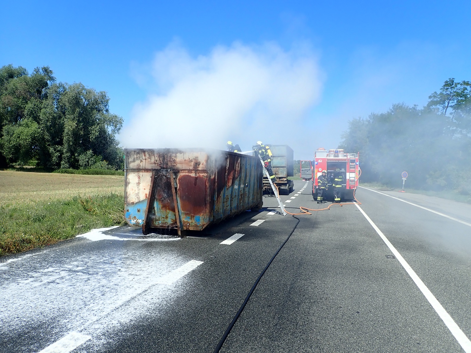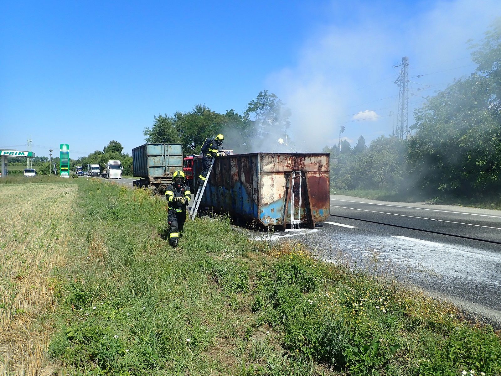 Kontejner byl převážen na nákladním automobilu s přívěsem. Řidič duchapřítomně před naším příjezdem odpojil přívěs a složil kontejner. Díky tomu nedošlo k rozšíření požáru.