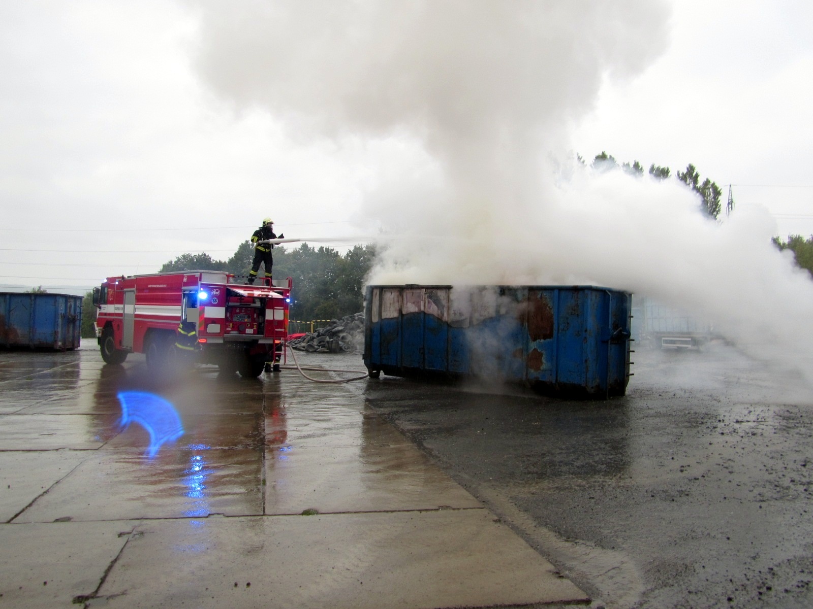 První jednotka byla na místě do šesti minut. Provedeným průzkumem bylo zjištěno, že požár zasáhl velký kontejner s drceným odpadním materiálem. Hasiči na pokyn velitele natáhli jeden proud s pěnou a požár lokalizovali. Po příjezdu dobrovolných jednotek byl požár postupně dohašován.