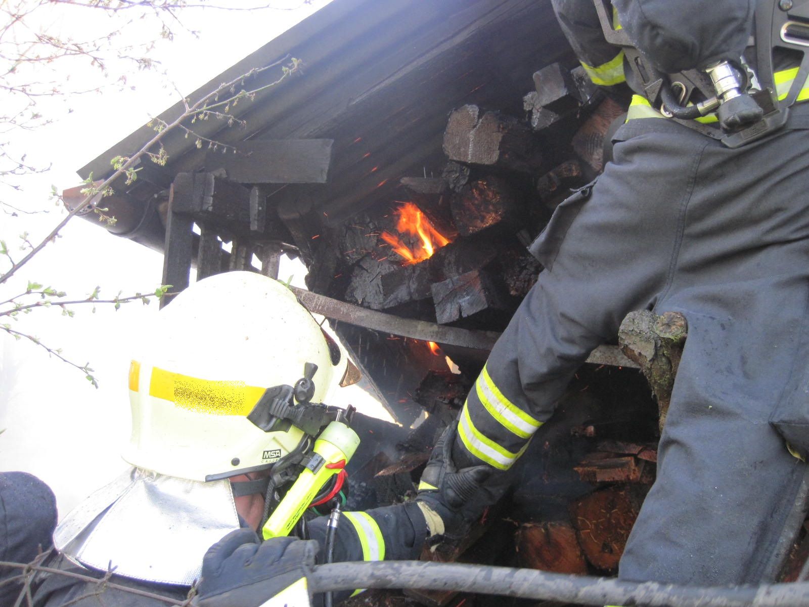 Na místě byla jako první místní jednotka hasičů. Průzkumem hasiči zjistili, že se jedná o požár kůlny s uskladněným dřevem v zahradě rodinného domu. K uhašení plamenů hasiči použili dva proudy vody. Následně začali z kůlny vynášet uskladněné dřevo a dohašovat ohniska hoření.